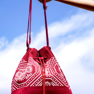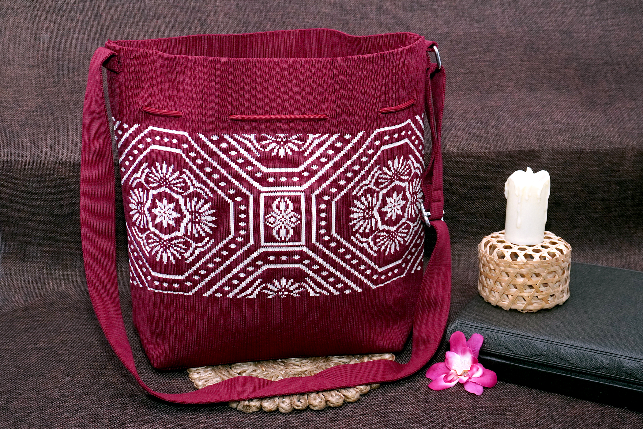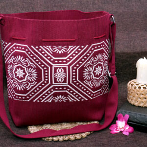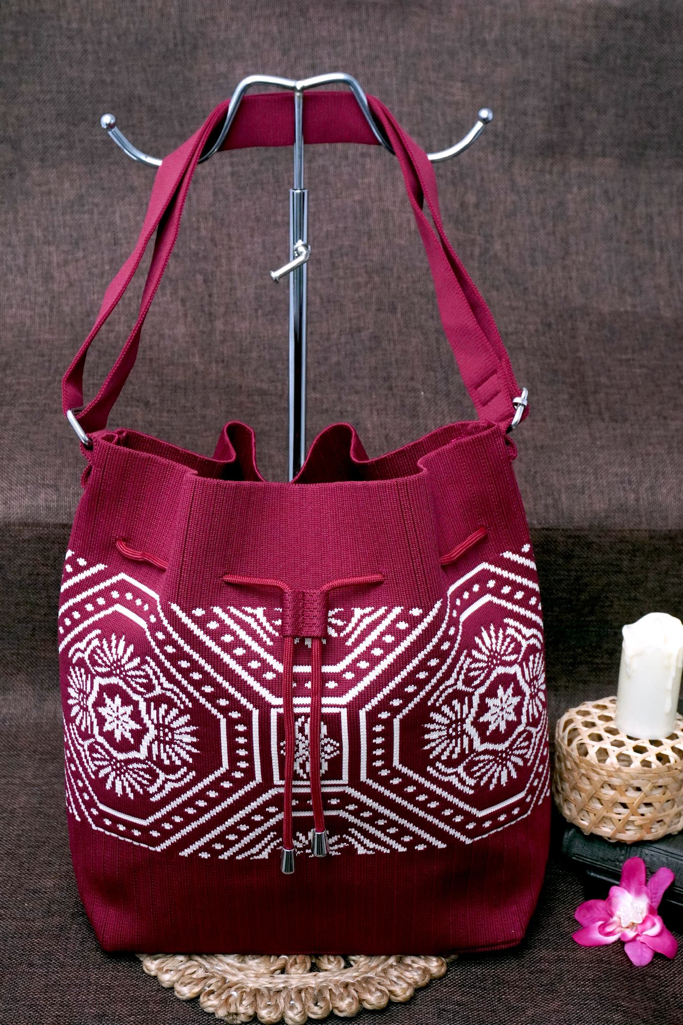 | A handcrafted bucket bag with eye-catching geometric and floral patterns, designed for both style and everyday use. Its neutral tones and soft texture make it a versatile and timeless piece. |