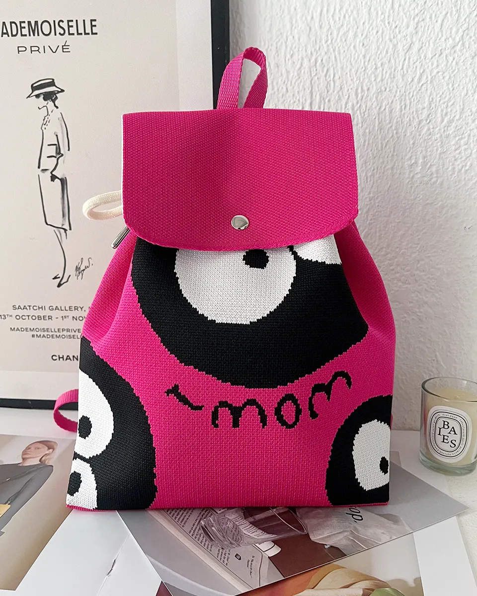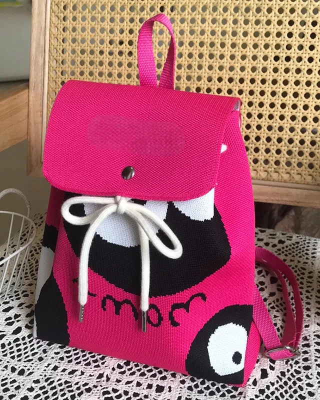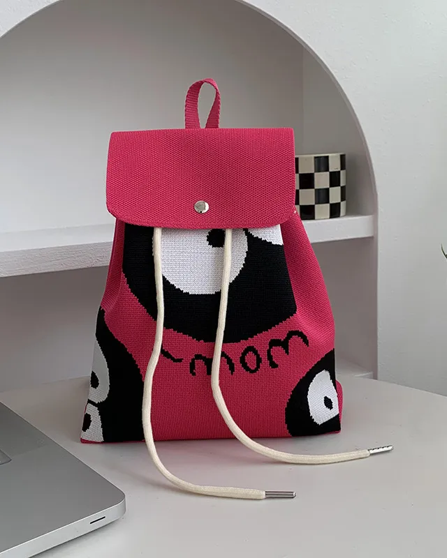 The beautifull knitted drawsring bag with a prominent design on the front.