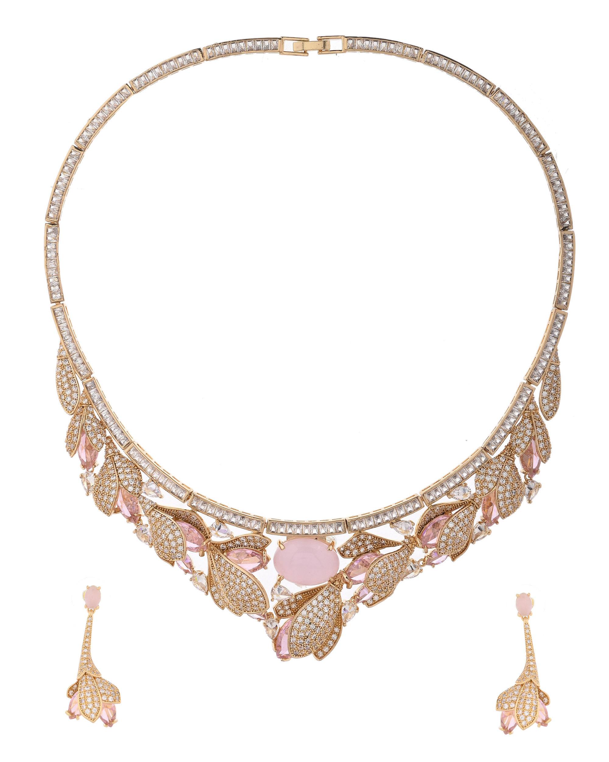 A stunning choker-style necklace set featuring delicate pink sapphires, dazzling diamonds, and a floral-inspired design. The intricate craftsmanship highlights pave-set diamonds and blush-toned gemstones, creating a sophisticated and feminine allure. The matching earrings complete the set, making it perfect for weddings, formal events, and luxury occasions.
