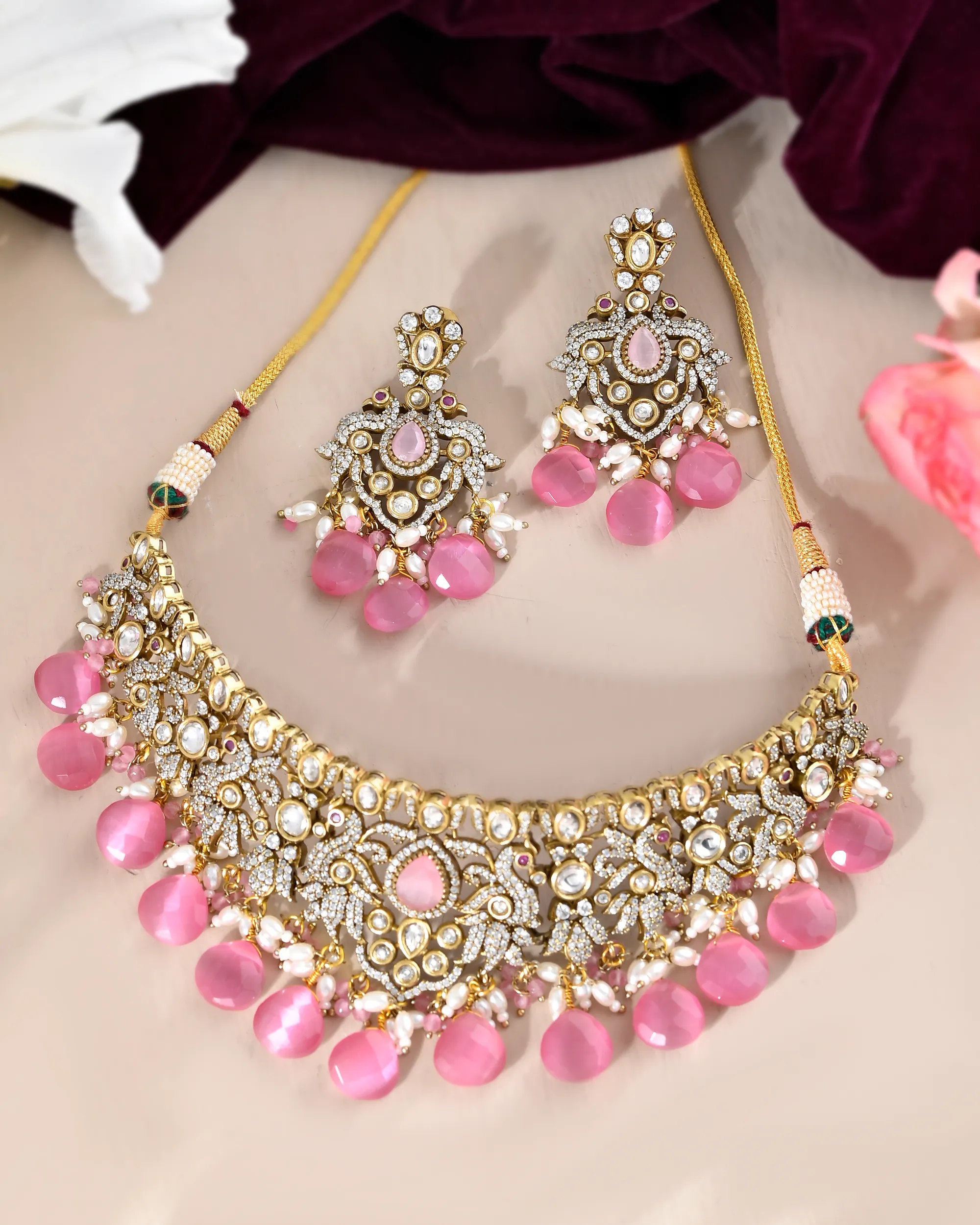 Bridal Antique Gold Finish Choker Necklace Set with Pink Drops & Kundan Detailing
