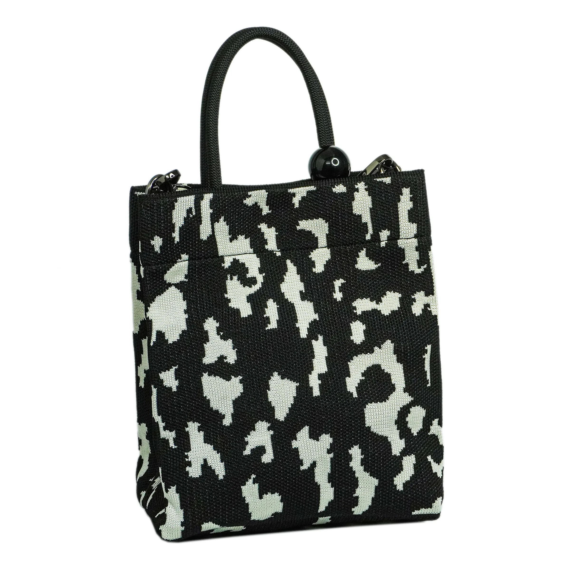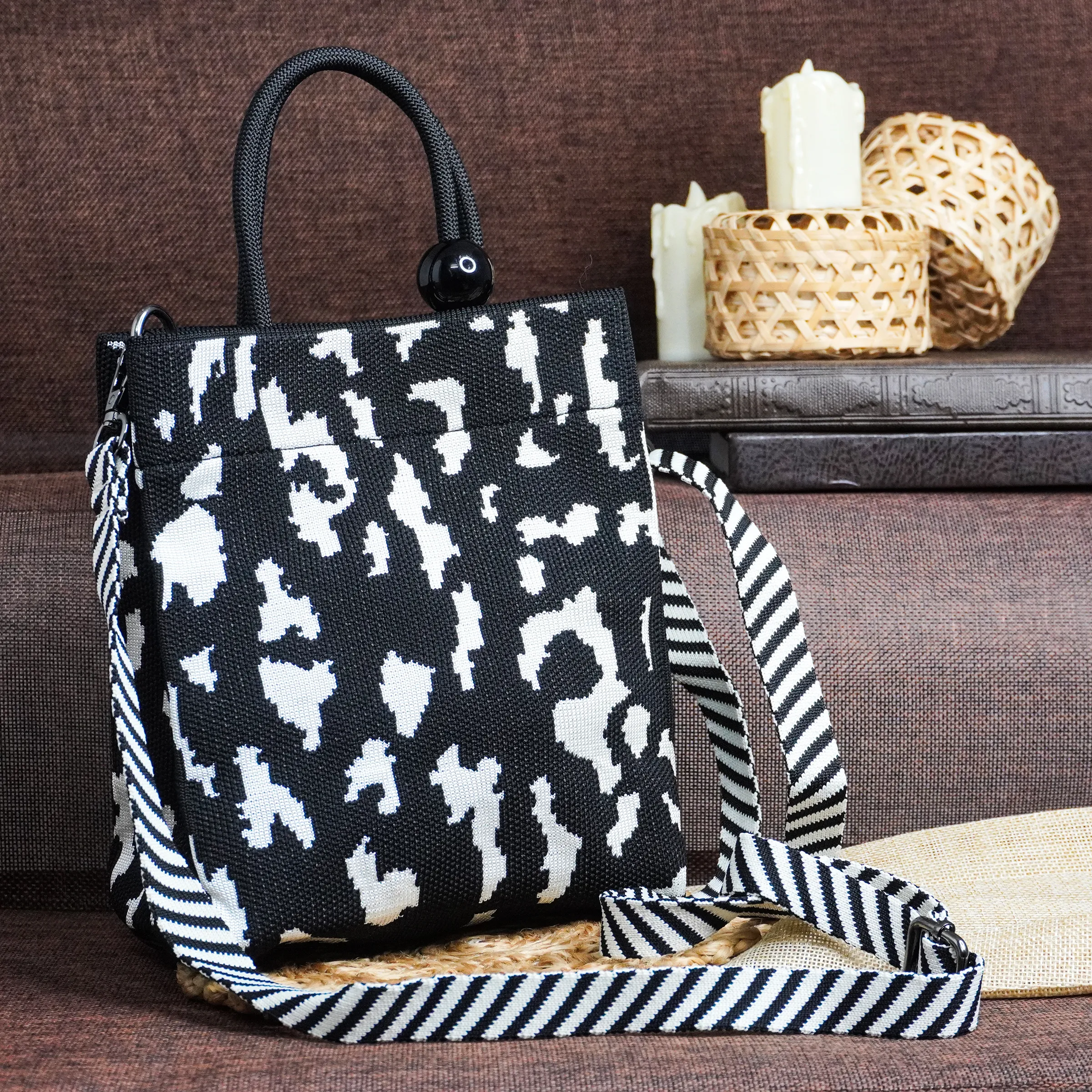 A stylish and modern tote bag featuring a striking black and white abstract pattern. Designed for versatility, it comes with a sturdy handle and a detachable striped shoulder strap for crossbody styling. The handcrafted woven texture adds a touch of uniqueness, making it perfect for casual outings, shopping, or travel.