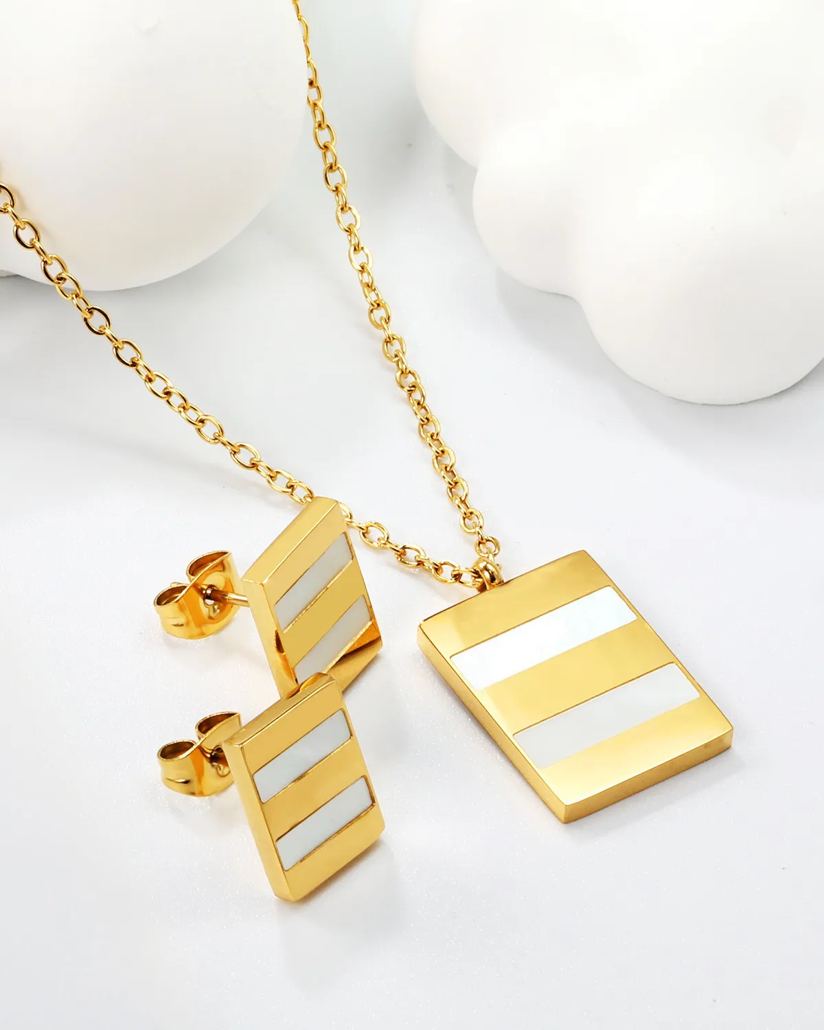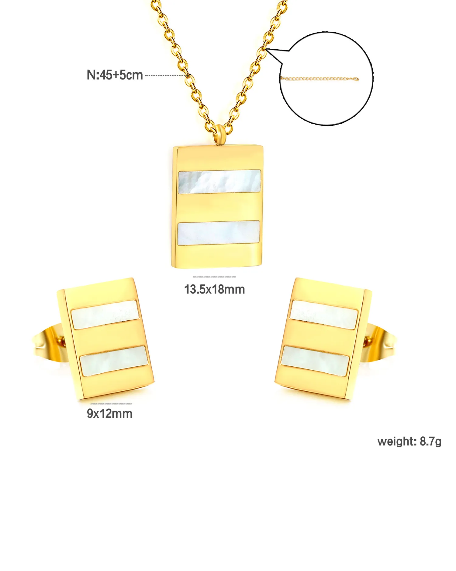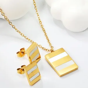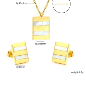 Turn heads with this elegant rectengle-shaped pendant set, crafted in aGold-tone finish with luminous mother-of-pearl inlay. Lightweight and timeless, it?s the perfect blend of romance and modern style ? ideal for gifting or daily wear.