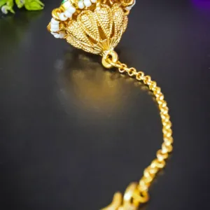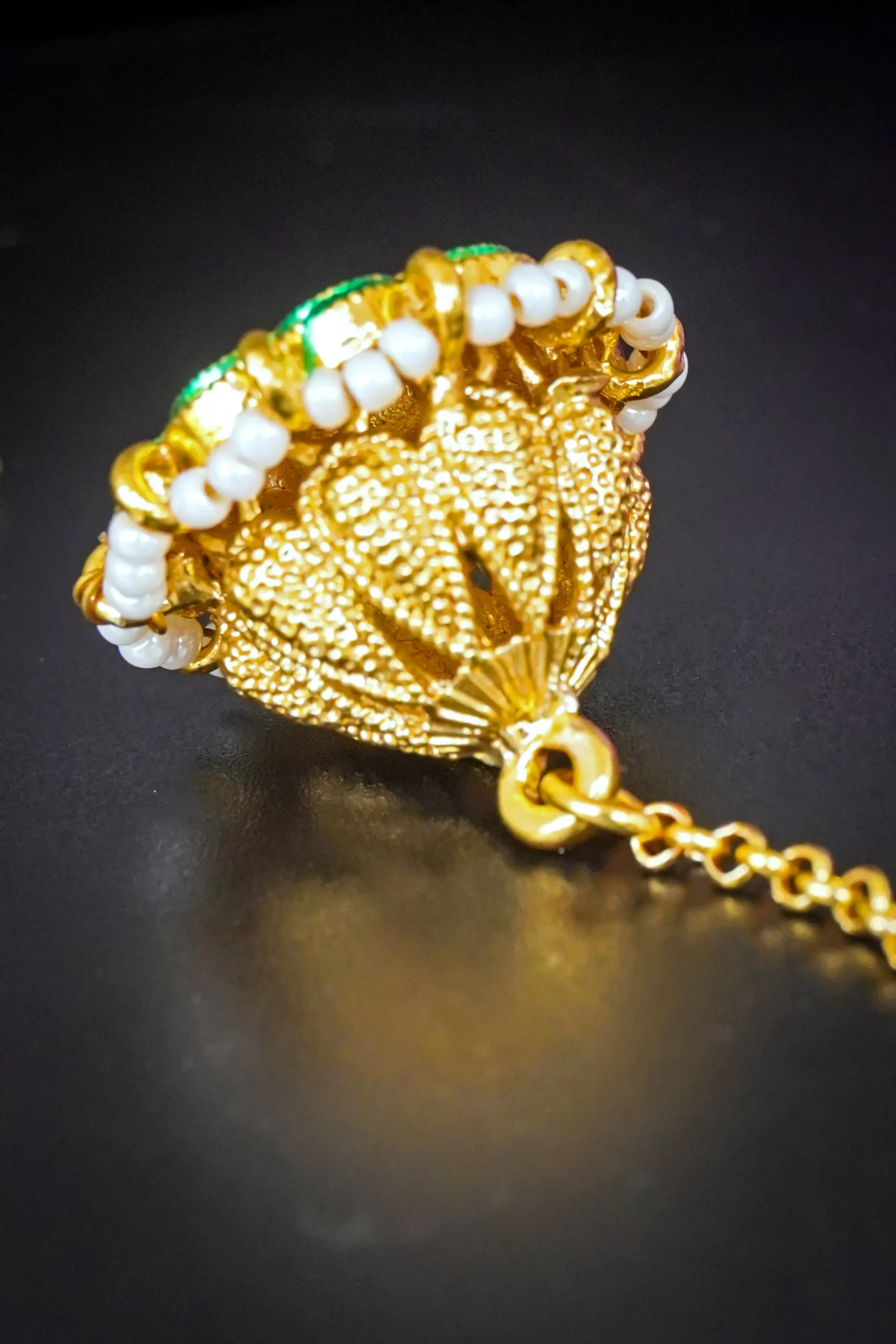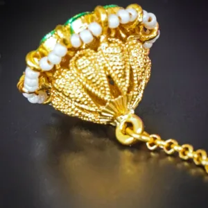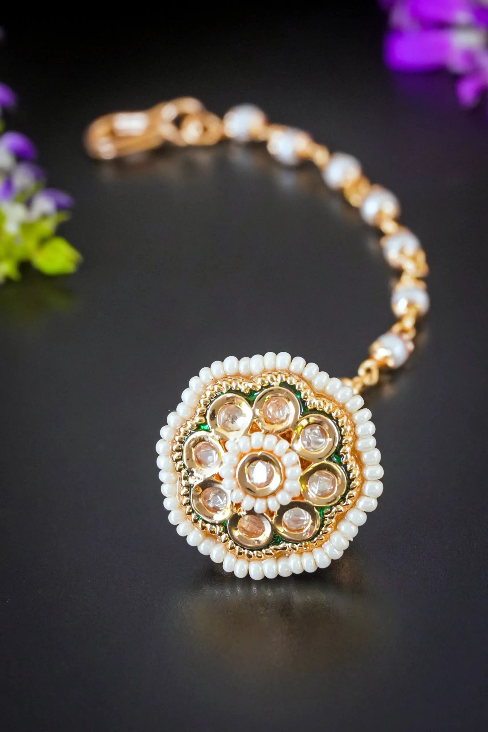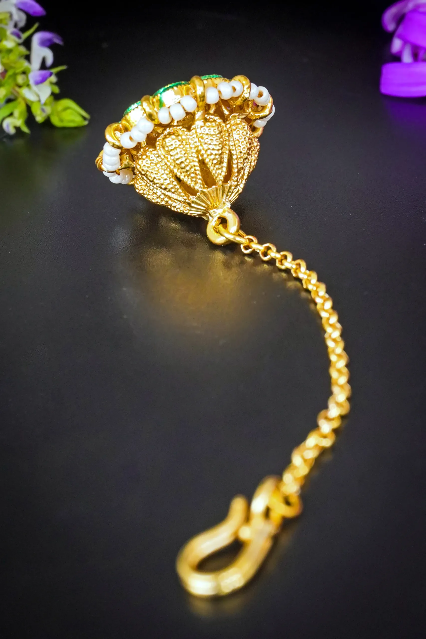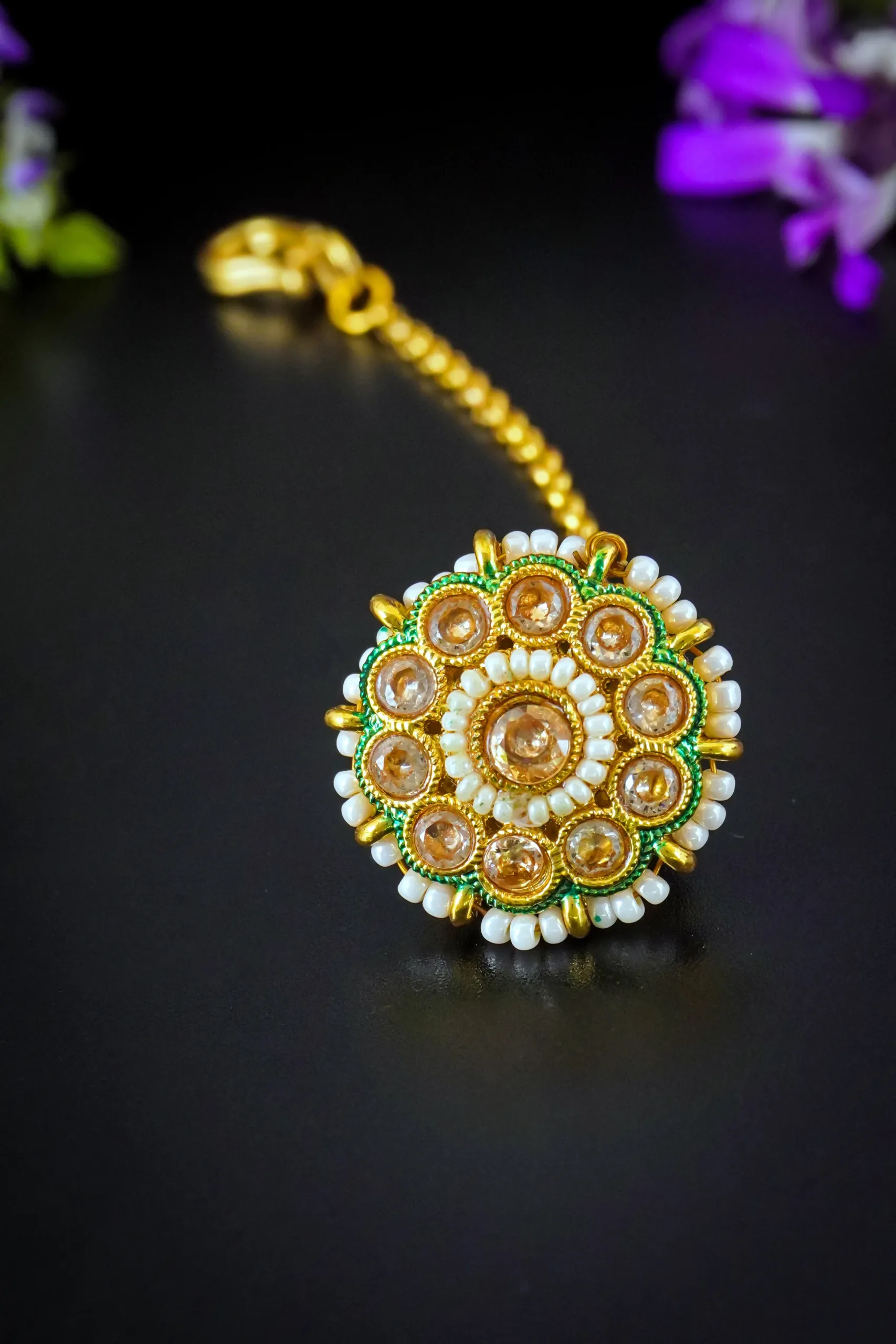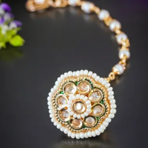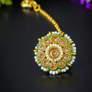 Elegance meets tradition in this timeless rakhdi featuring radiant champagne-toned stones set in a detailed circular Kundan design. Accented with green enamel and bordered with delicate faux pearls, this piece exudes understated charm and grace. The gold-toned finish and traditional craftsmanship make it a versatile accessory for weddings, receptions, and festive attire.