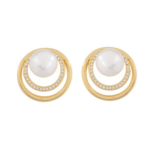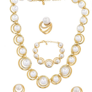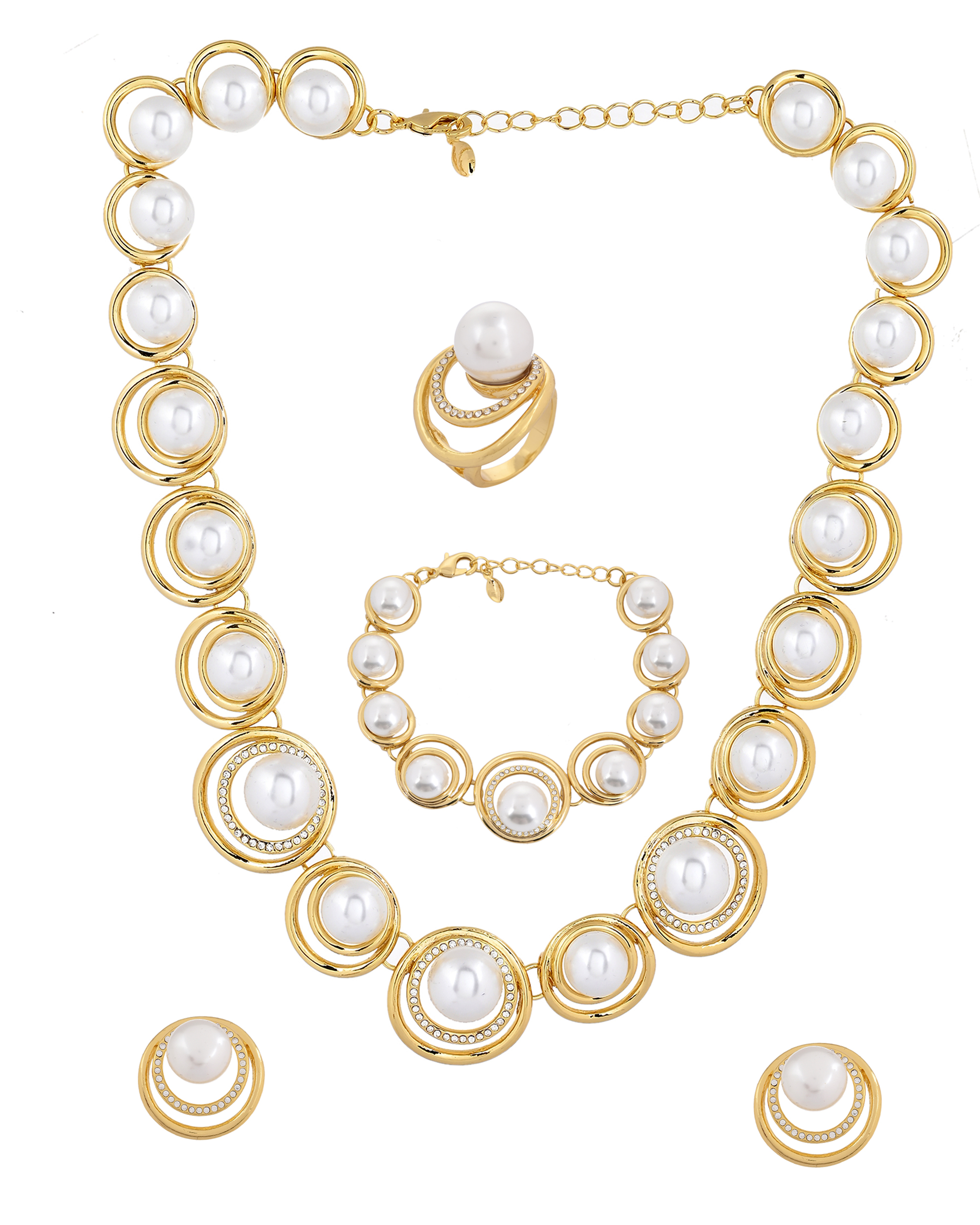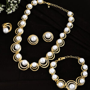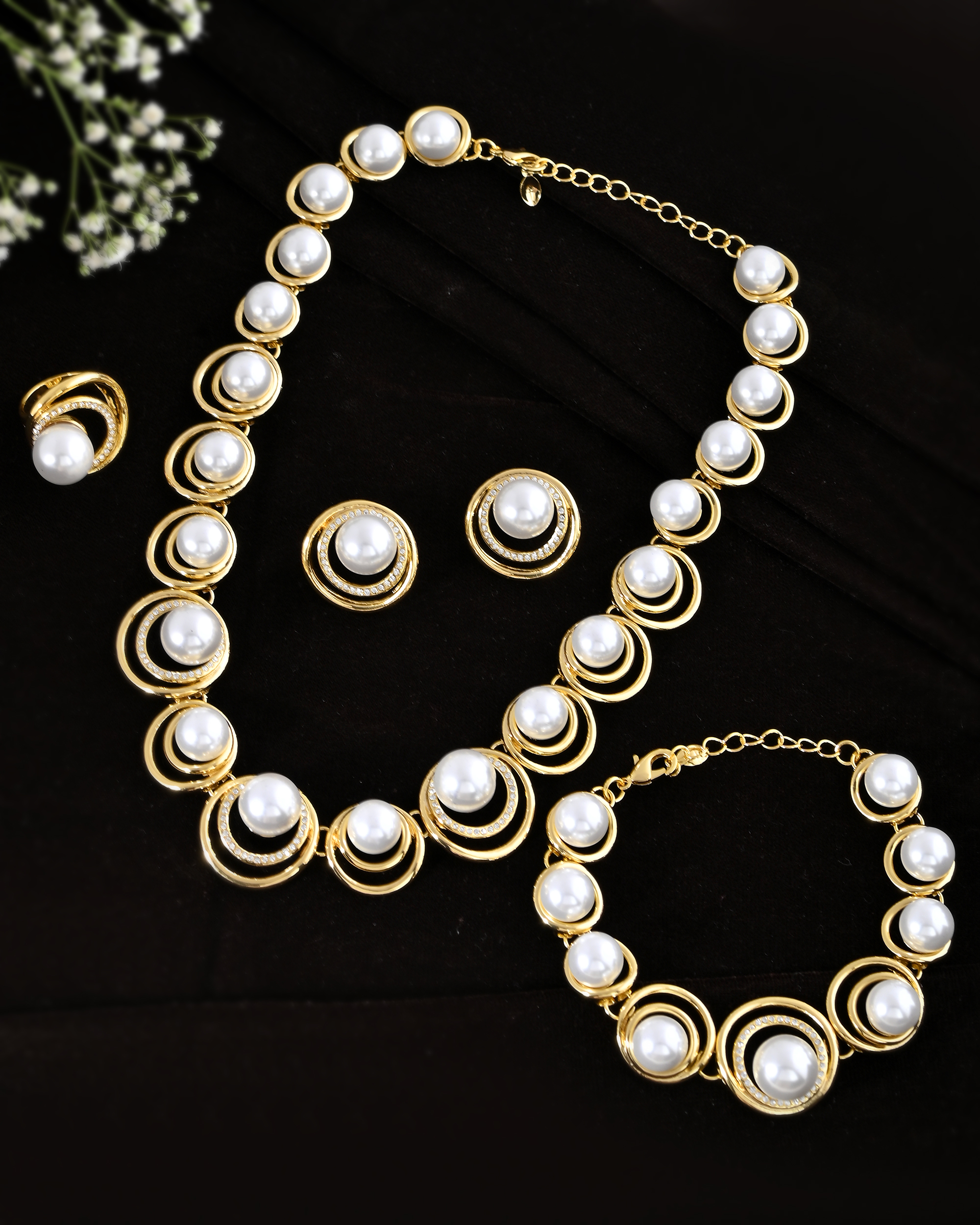 Step into timeless elegance with this classic gold-plated jewelry set, featuring luminous white faux pearls encased in concentric circular frames. The set includes a matching necklace, bracelet, ring, and stud earrings?each piece radiating sophistication with its symmetrical design and luxurious gold-tone finish. Ideal for formal gatherings, festive occasions, or bridal wear, this set combines simplicity and style to create a polished, graceful look.