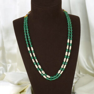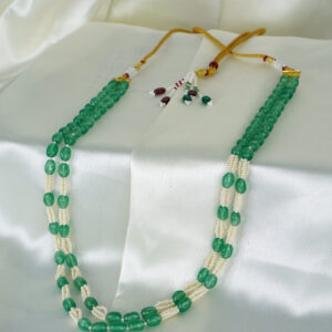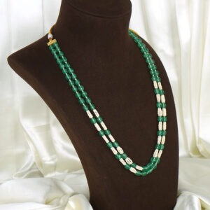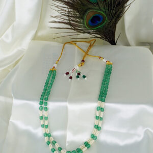 This elegant necklace is crafted with vibrant green oval beads paired with delicate white seed beads, arranged beautifully in a multi-strand design. The harmonious color combination offers a fresh and graceful look. Secured with a golden silk thread and decorative tassels, this necklace is both adjustable and comfortable. Perfect for traditional functions, festive wear, or as a graceful statement piece for day or evening events.