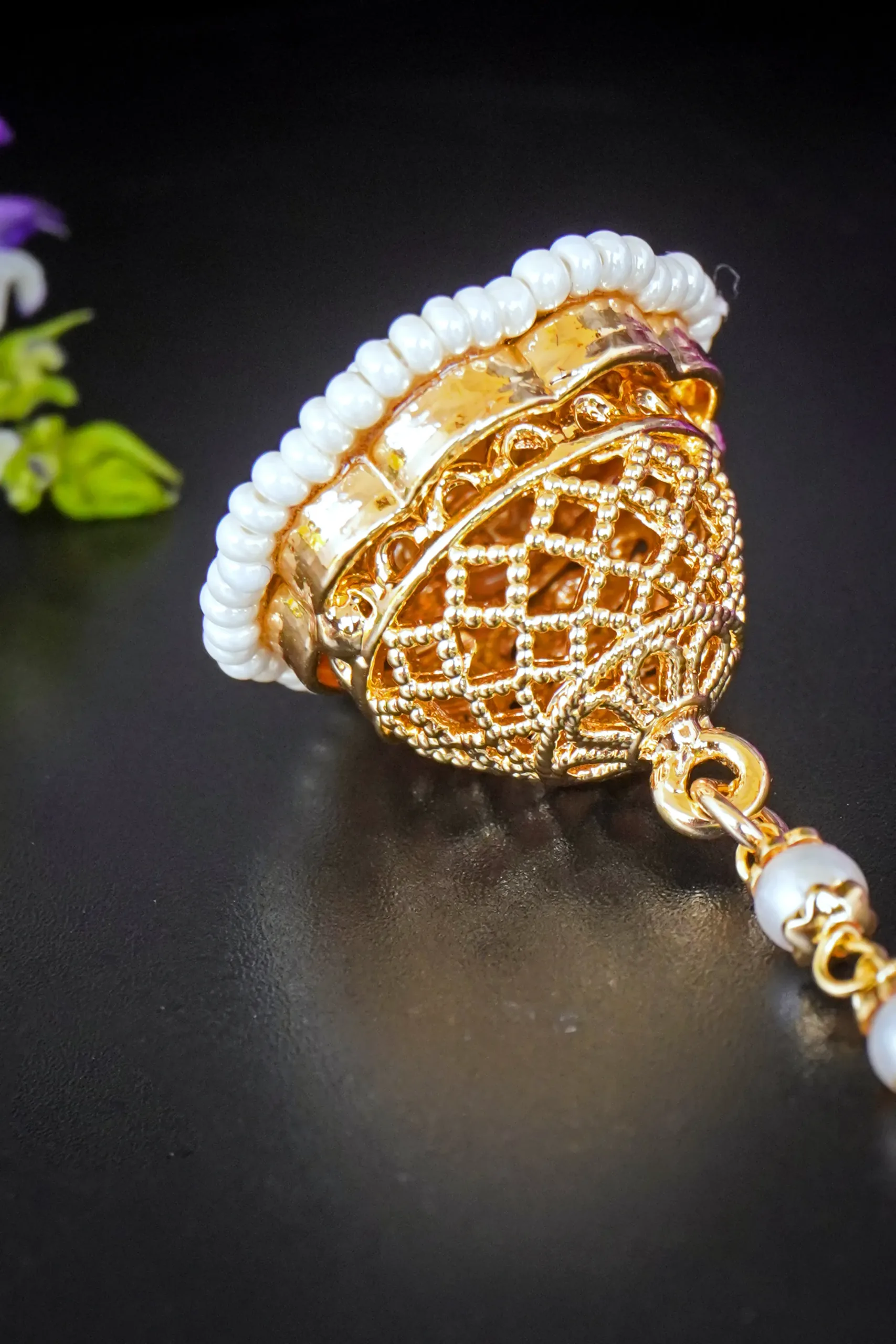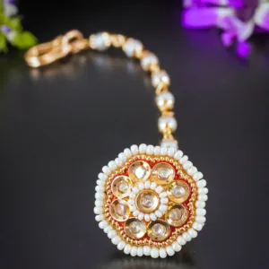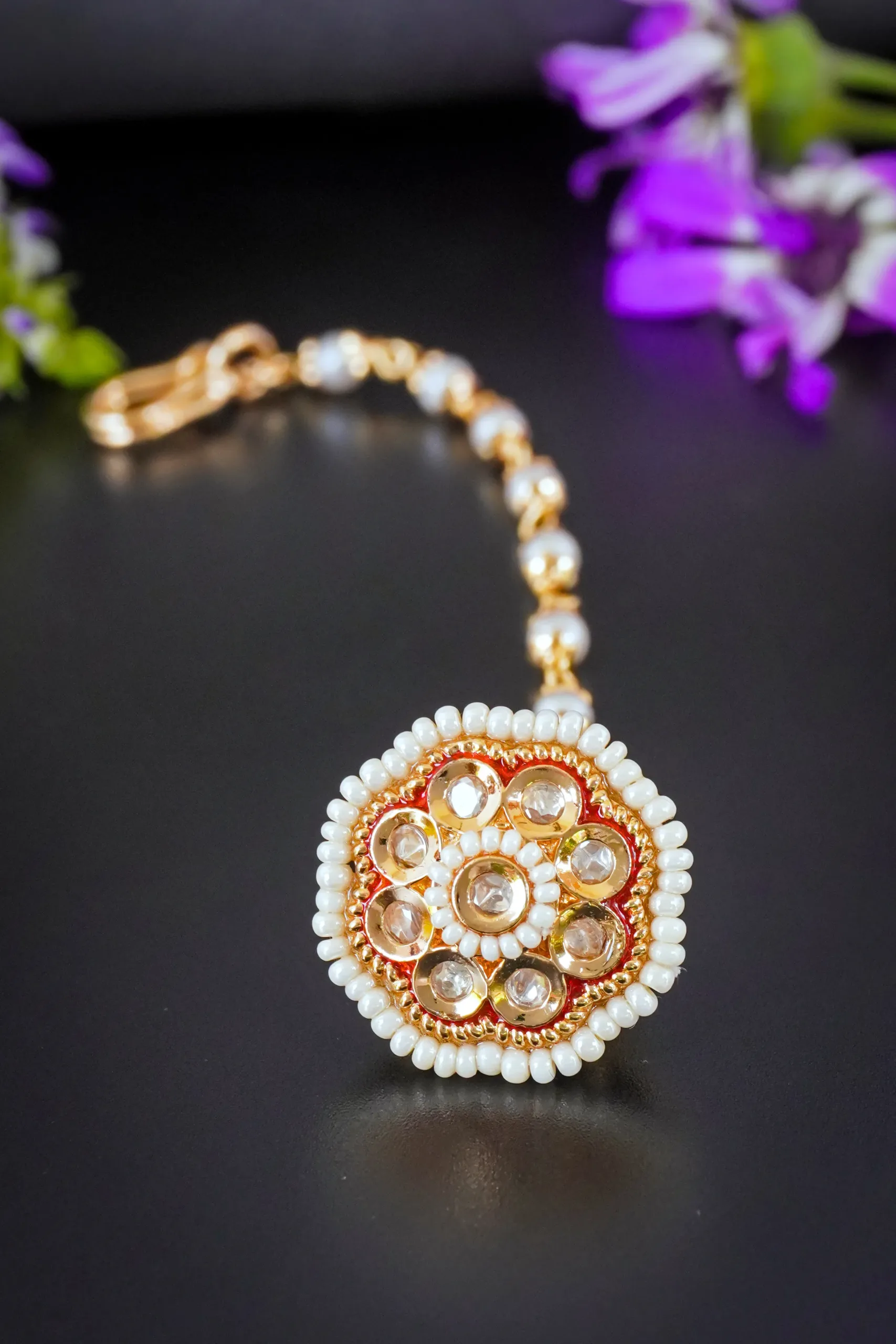 | Material | Gold-polished alloy base,Kundan stones,Faux pearls,Red enamel highlights |