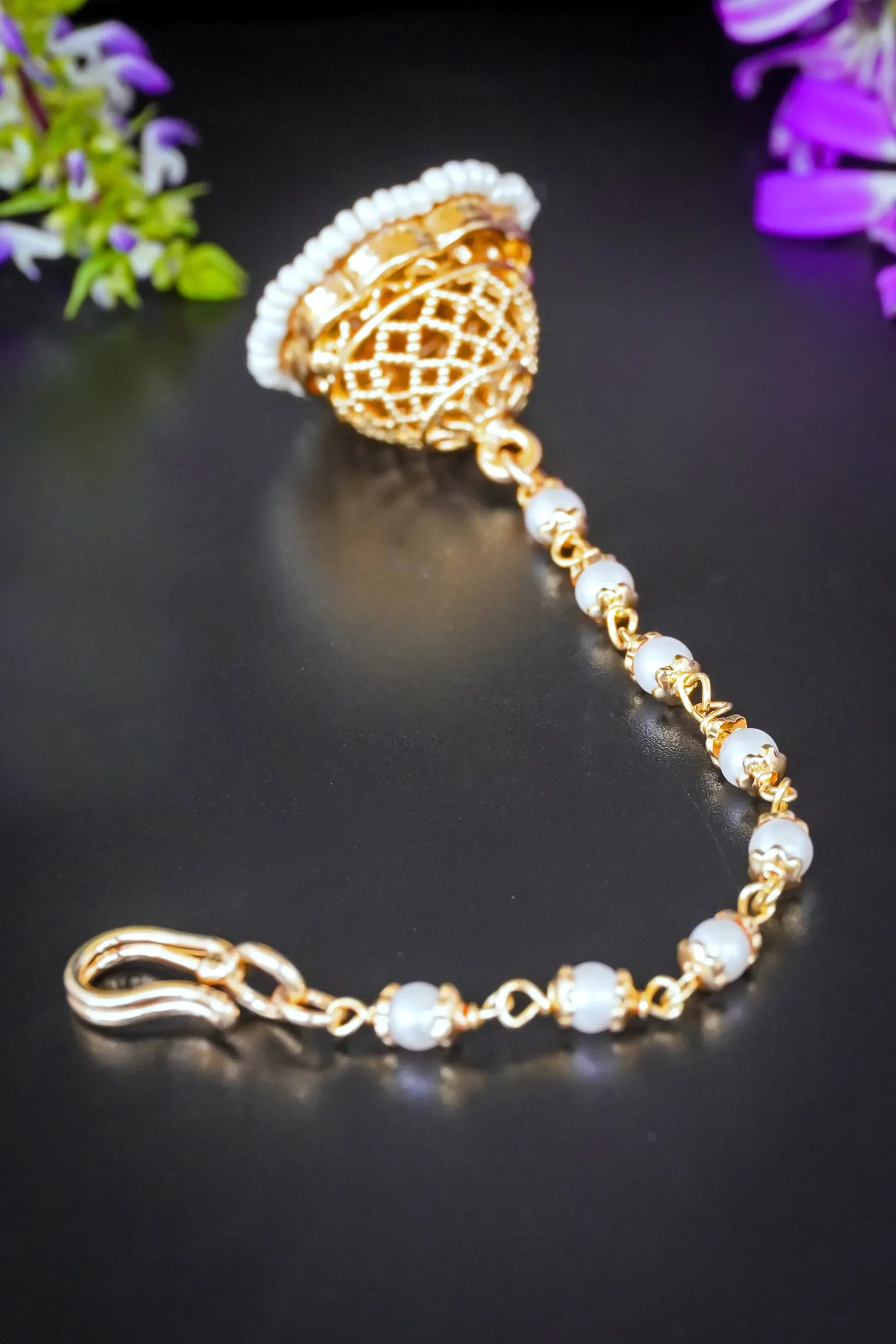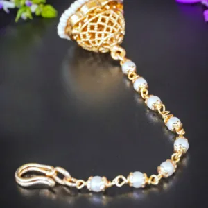 Add timeless charm to your ethnic look with this beautifully handcrafted floral rakhdi. Featuring a traditional circular design adorned with kundan stones, delicate faux pearls, and a central green accent, it radiates elegance. Ideal for weddings, festivals, and other grand occasions, this piece brings regal flair to any ensemble.