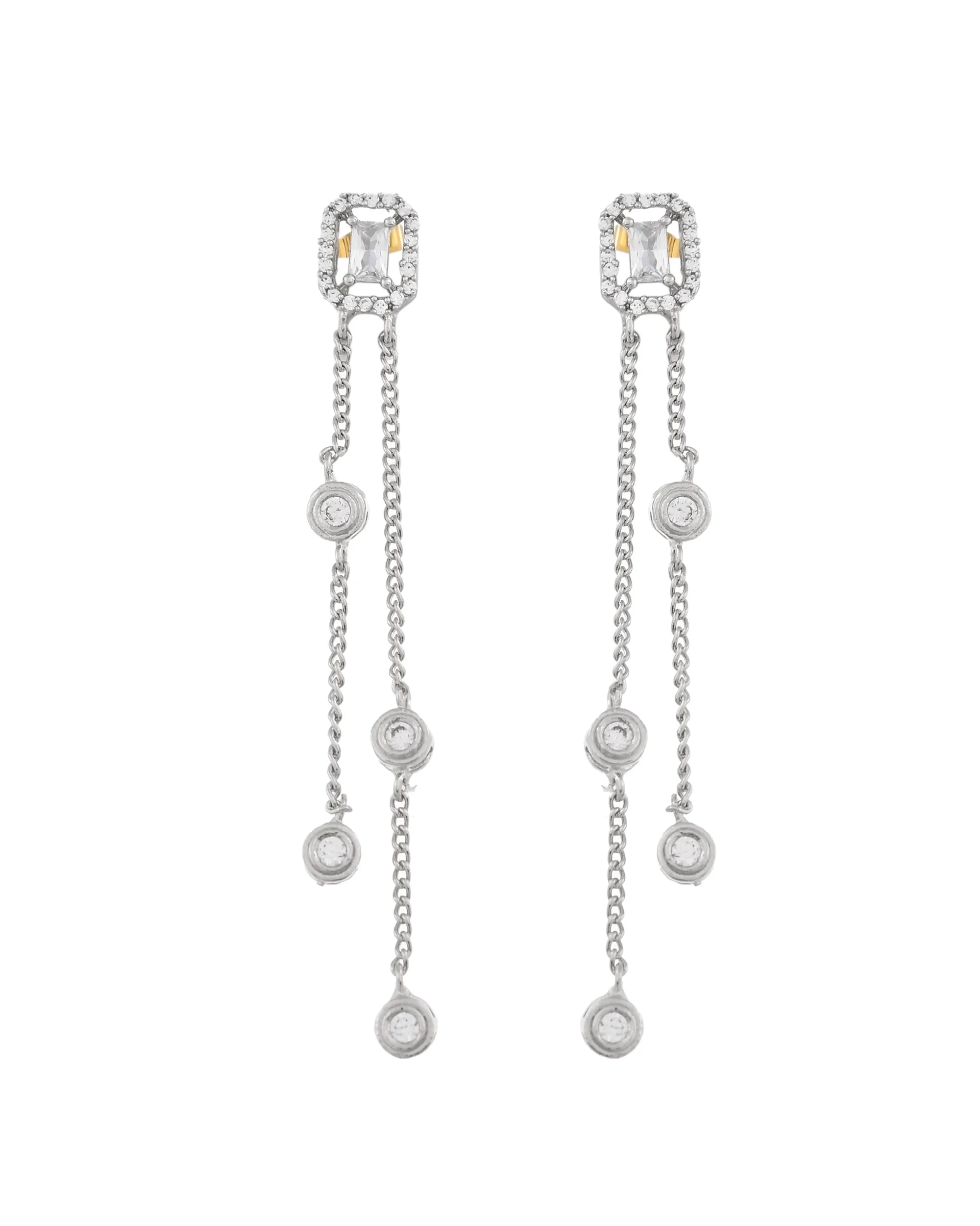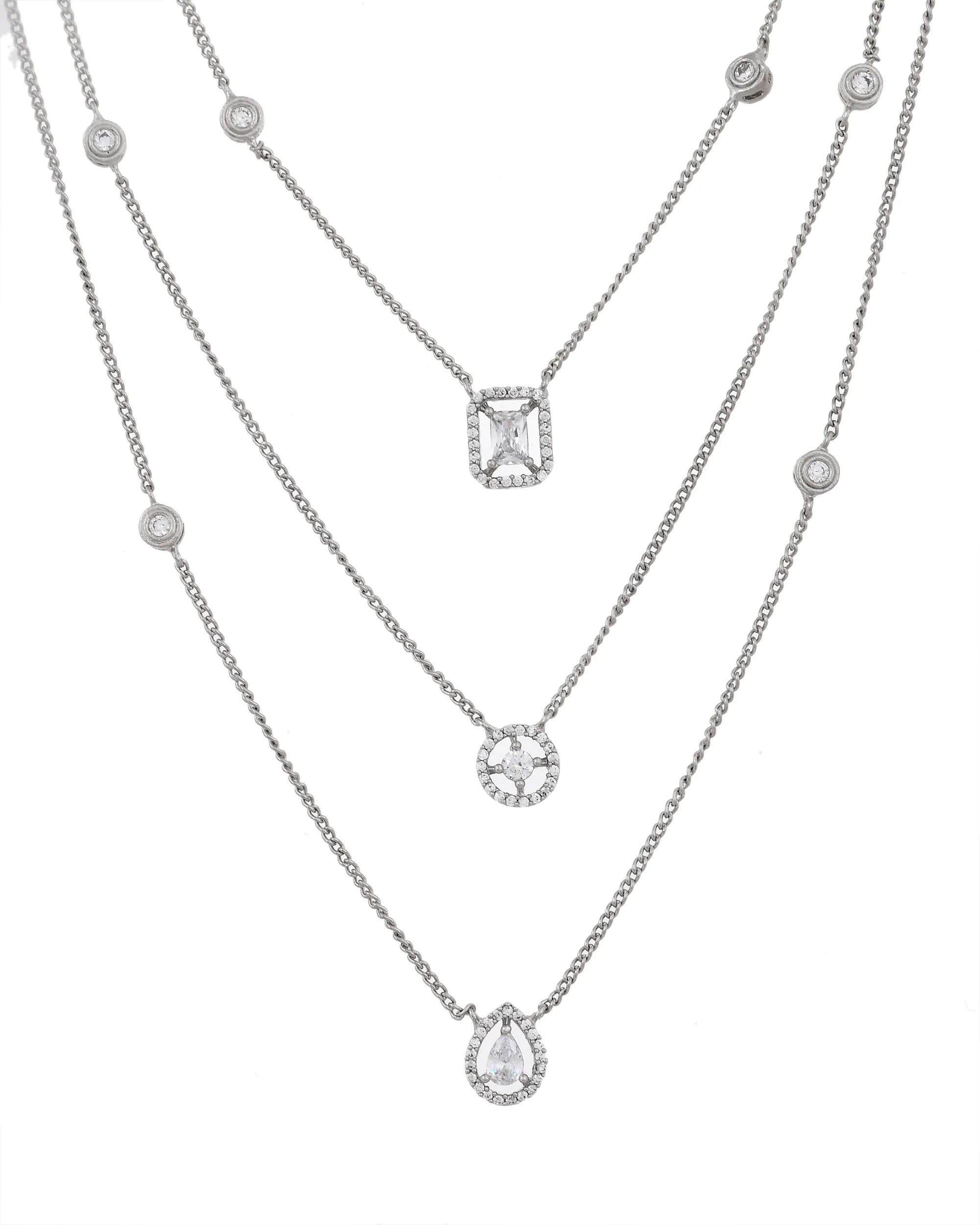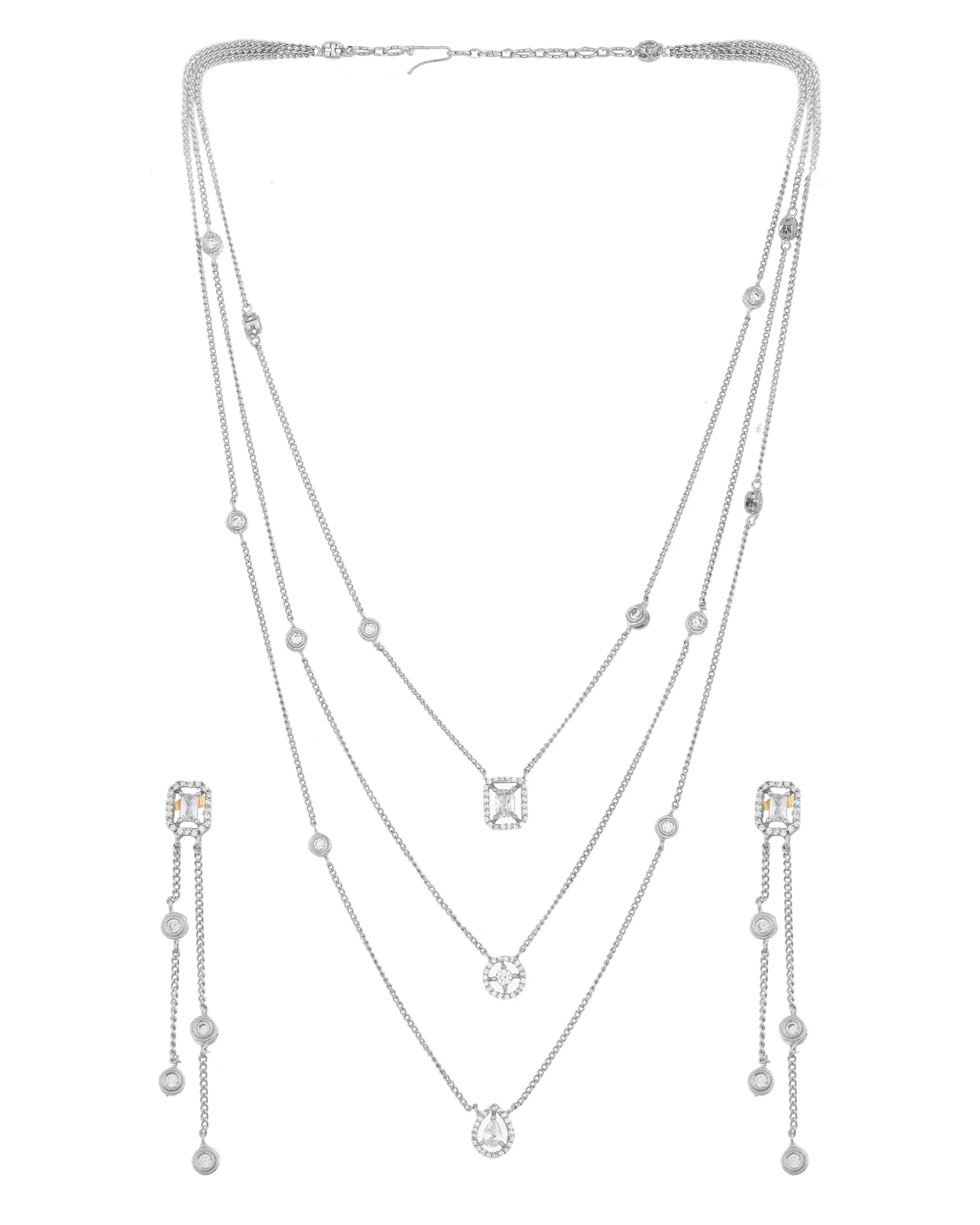 Add a touch of modern elegance to your ensemble with this sleek, multi-layer silver necklace set. Featuring fine chains adorned with bezel-set stones and minimalist geometric pendants?oval, teardrop, and rectangular?this design captures subtle sophistication. The coordinating long-drop earrings echo the necklace?s delicate chain and crystal arrangement, making this set perfect for formal evenings, cocktail parties, or a stylish upgrade to your everyday look.