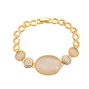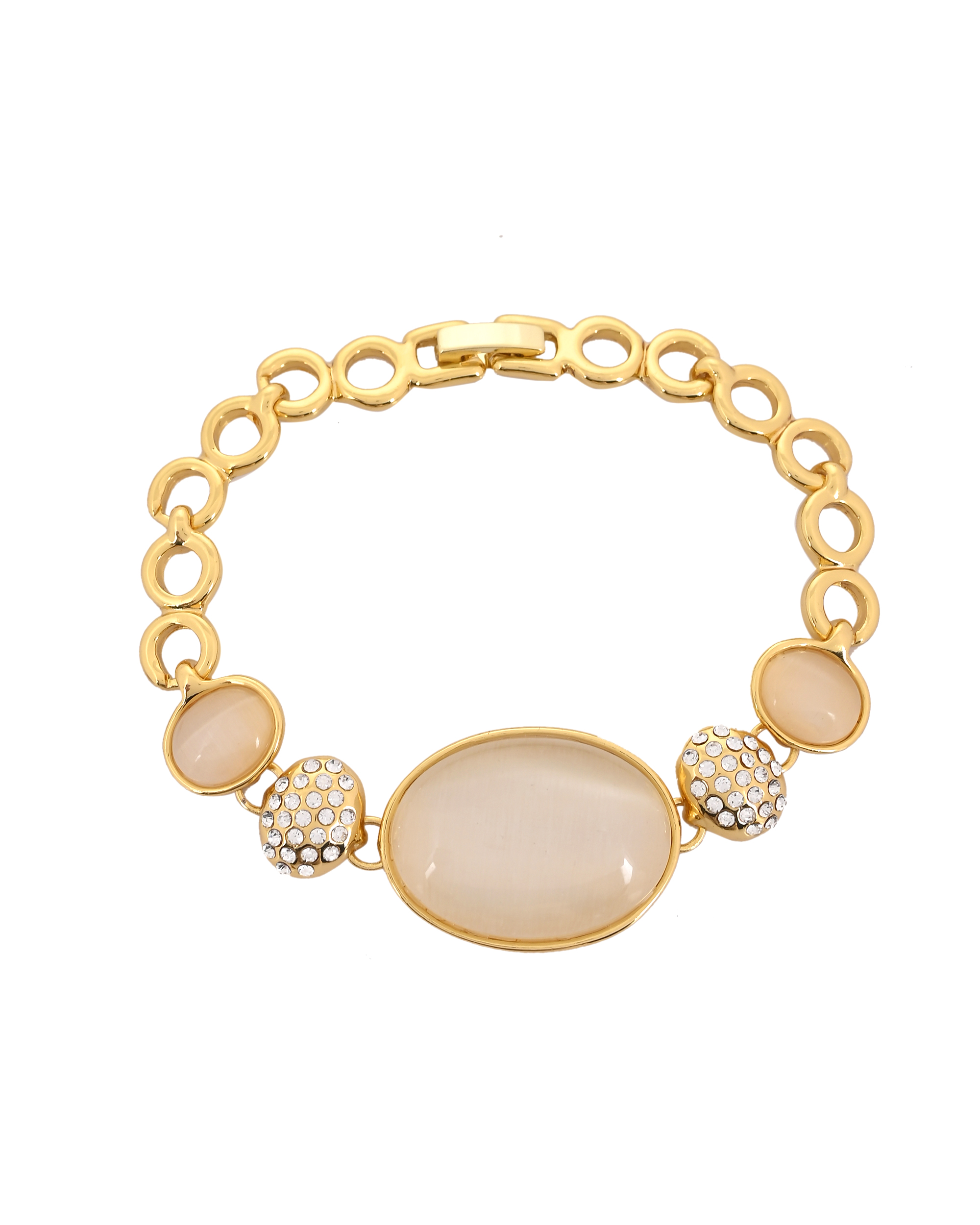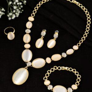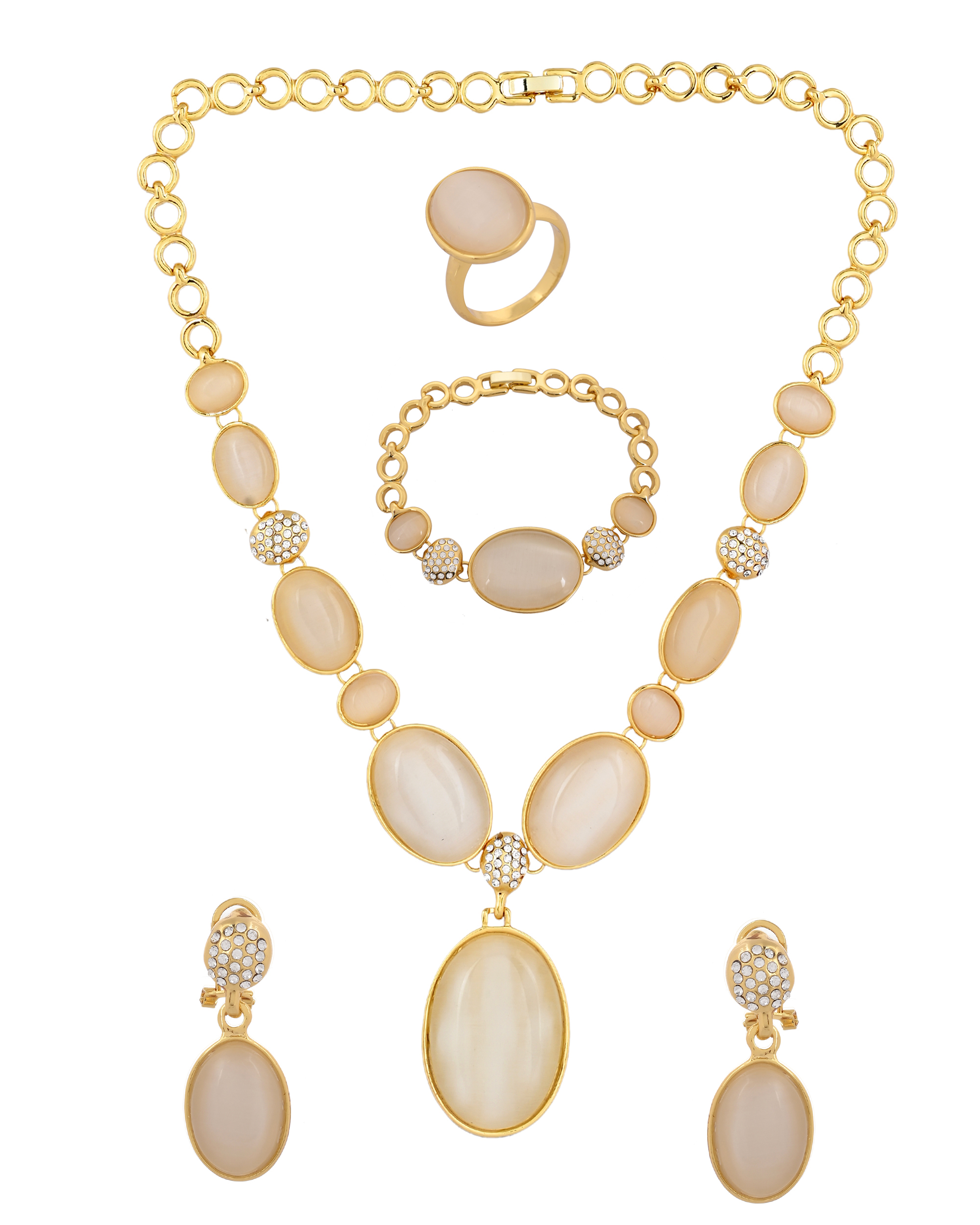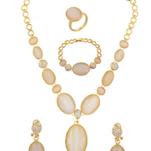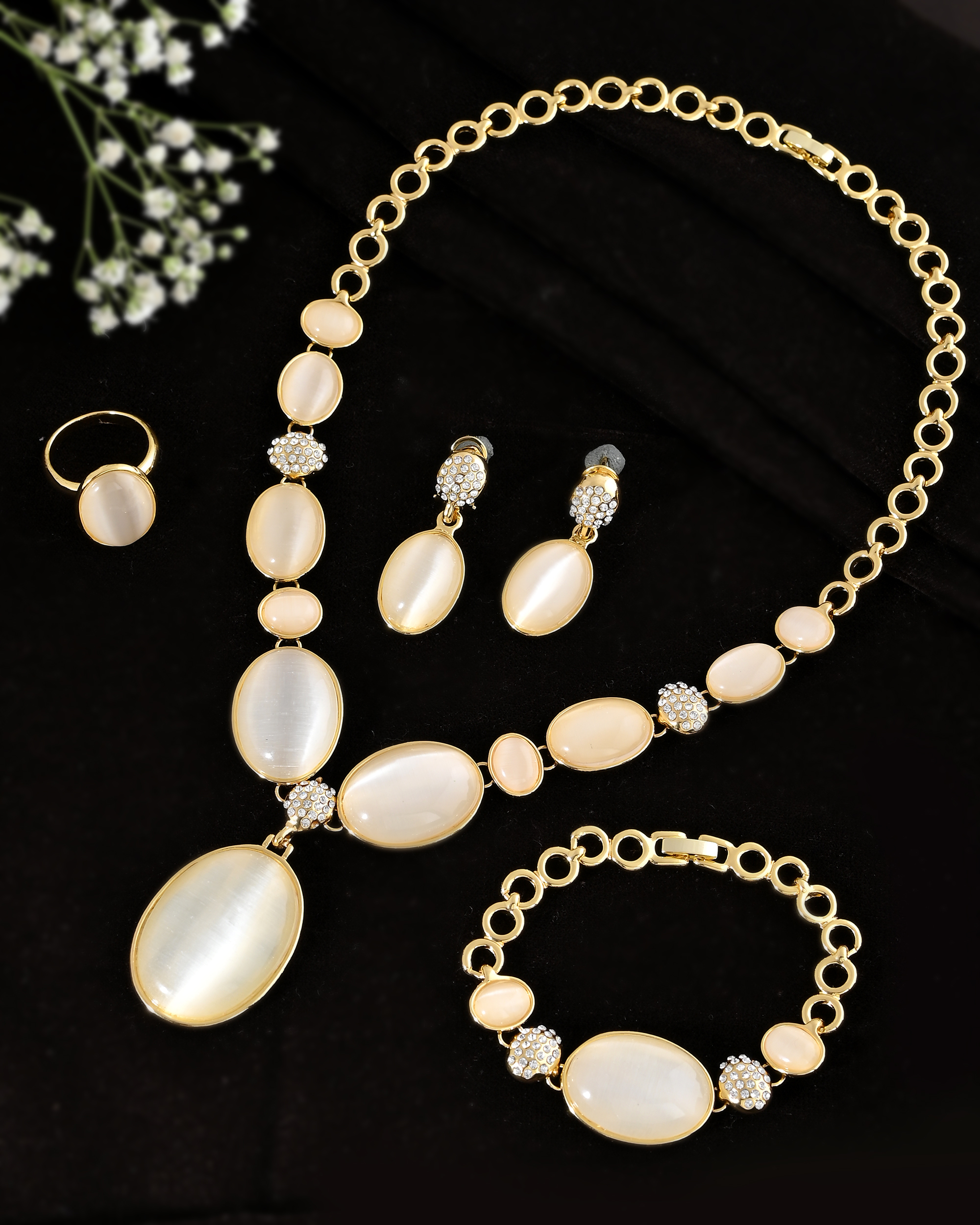 Elegant and timeless, this gold-plated jewelry set showcases smooth oval cream-toned stones that exude a soft, radiant charm. The set includes a statement necklace with a prominent central pendant, a coordinating bracelet, drop earrings, and a sleek ring. Pave-style crystal accents between the stones add a luxurious sparkle, perfect for weddings, festive celebrations, or sophisticated evening wear