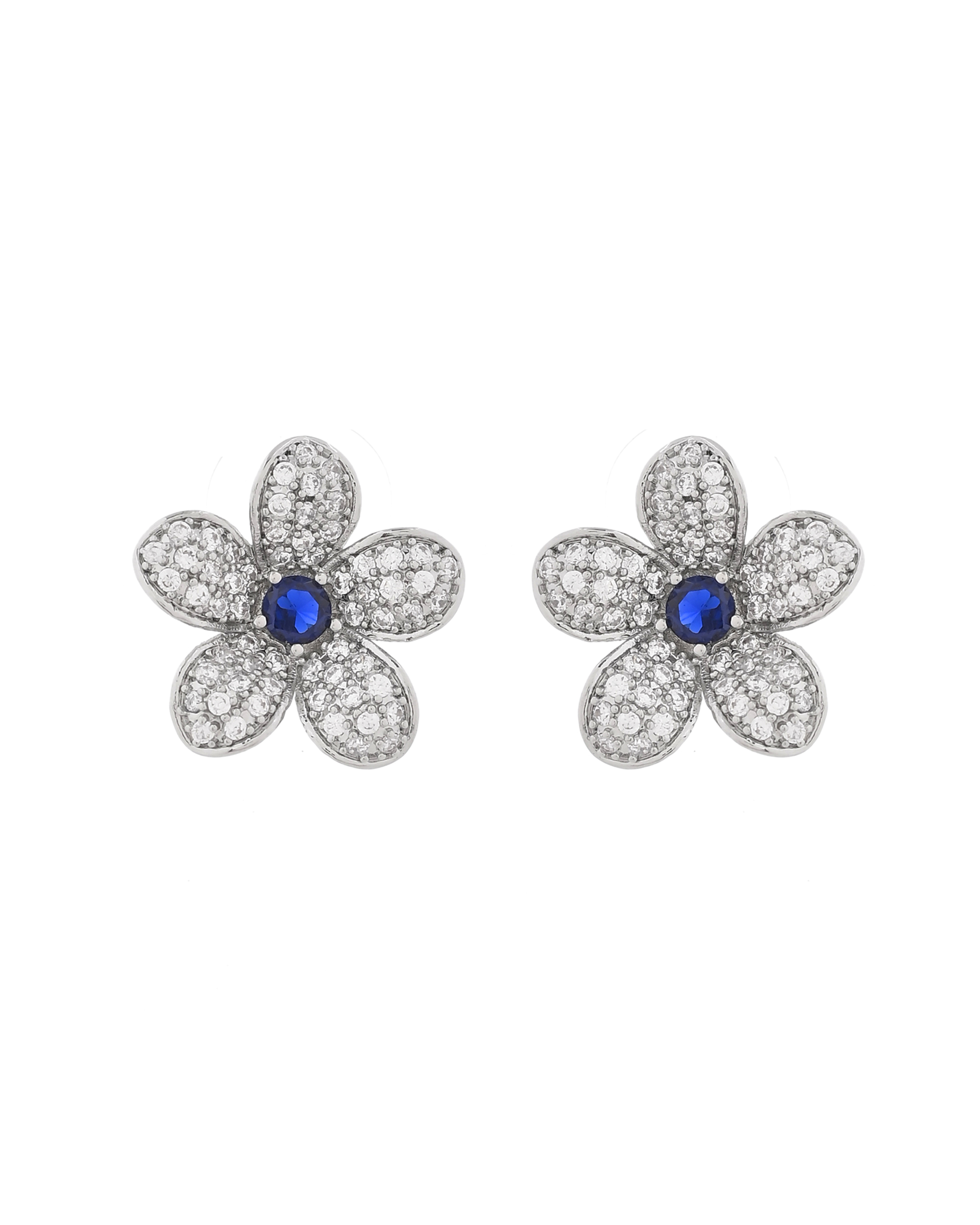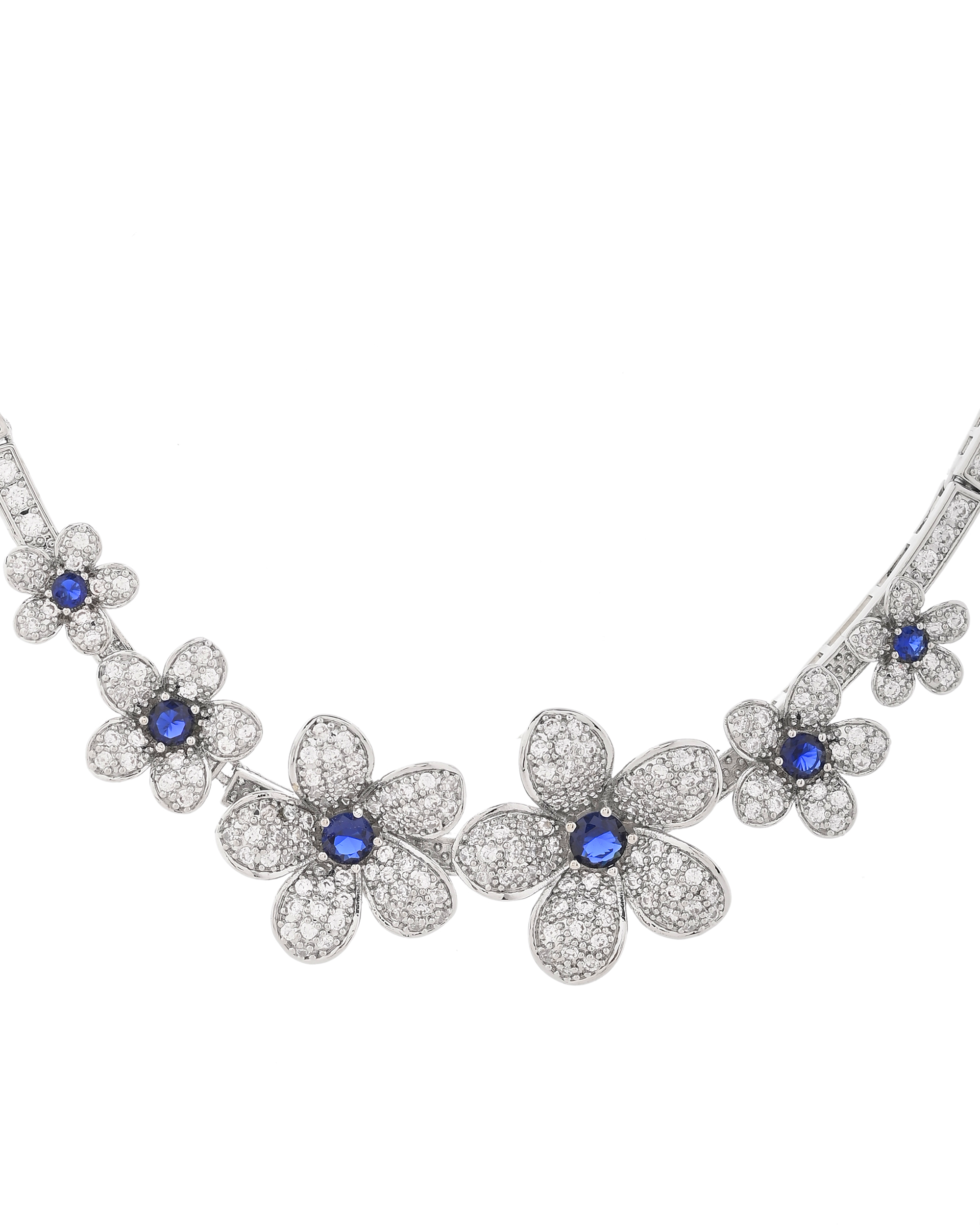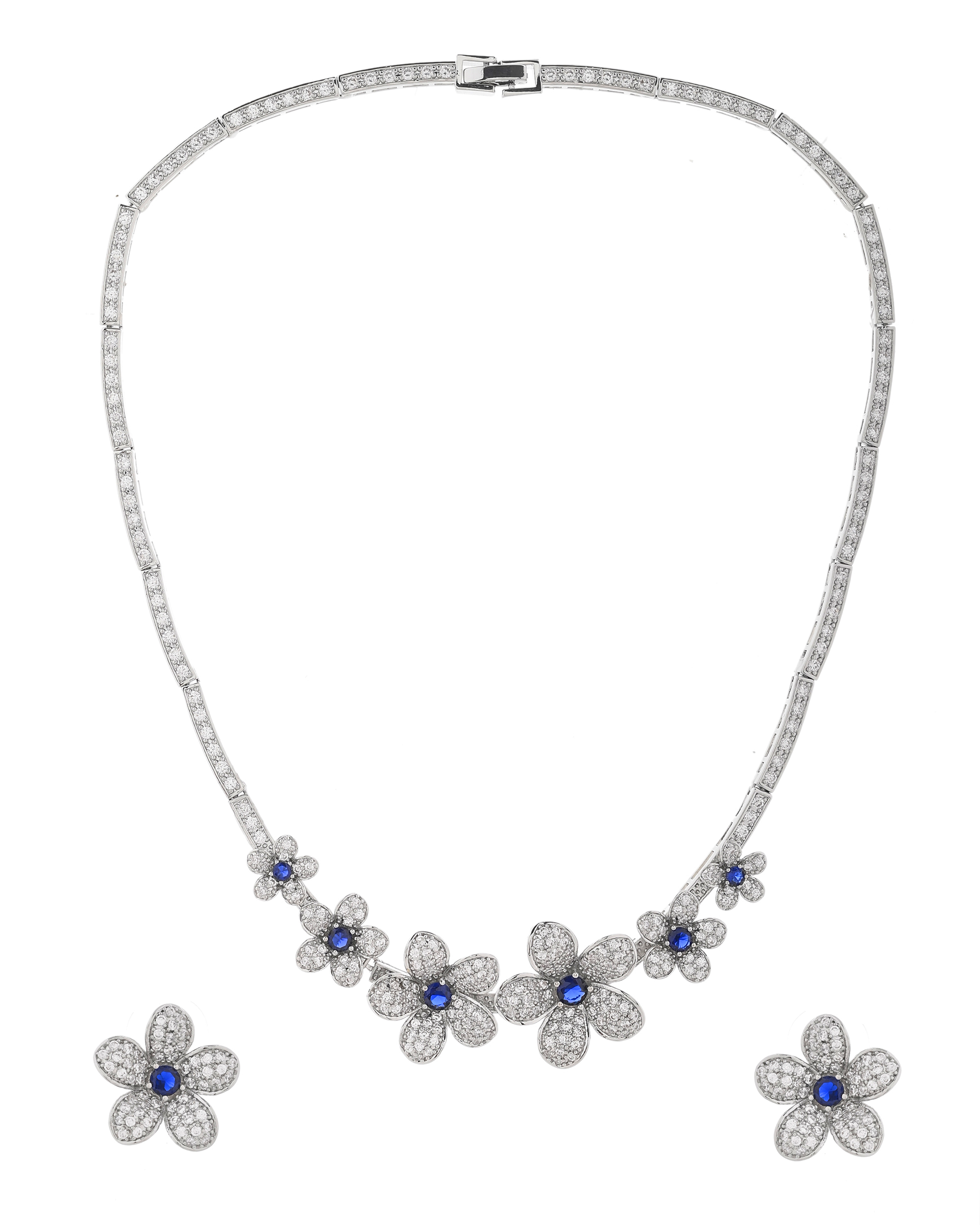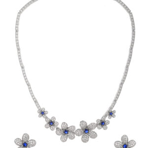 This exquisite jewelry set features a stunning diamond-encrusted necklace and matching earrings, crafted in white gold or platinum. The floral motif is elegantly designed with shimmering diamonds, each flower centered with a deep blue sapphire, adding a touch of sophistication and timeless beauty. Perfect for special occasions, this set embodies luxury and elegance.