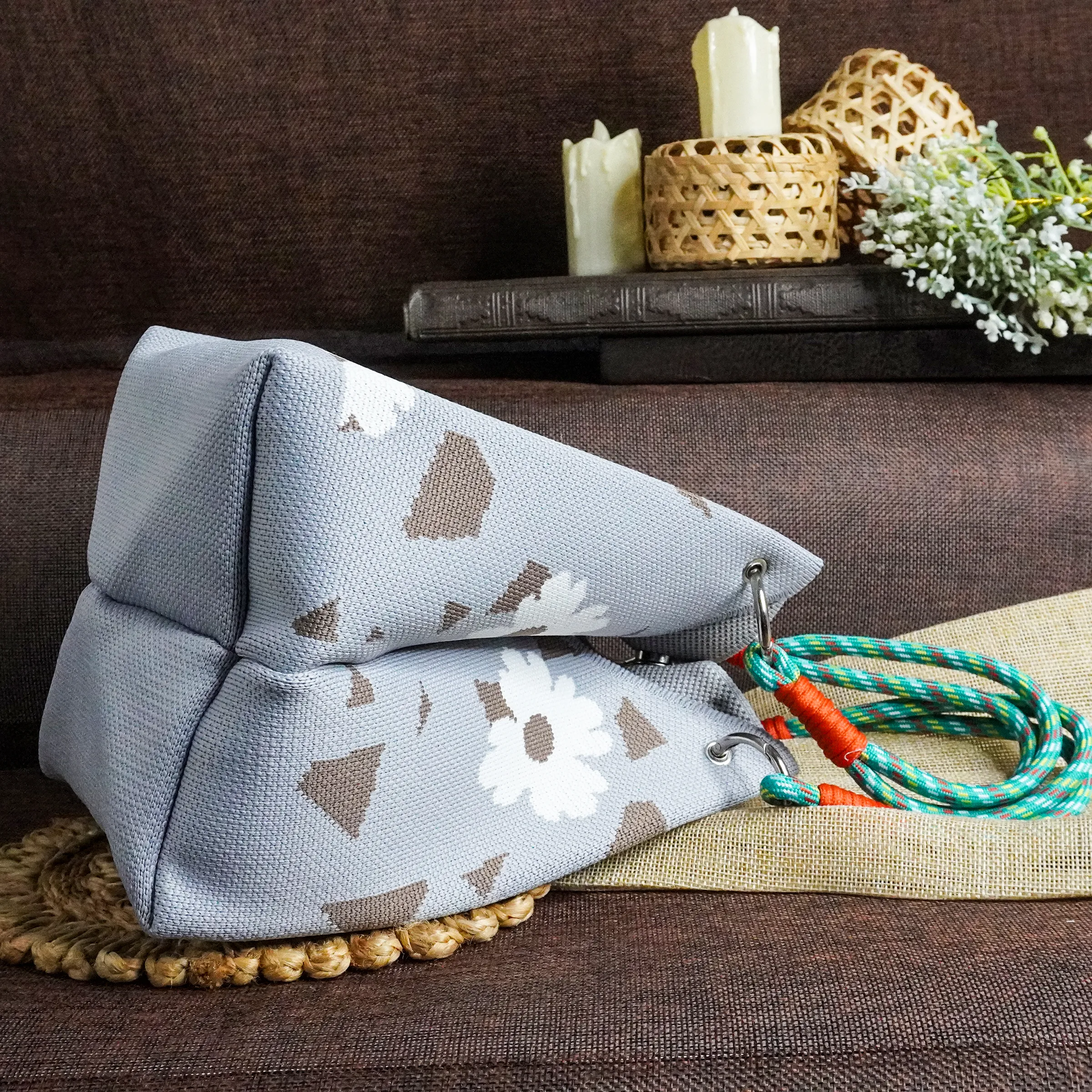 This uniquely designed tote bag features a soft gray background adorned with white daisy-like flowers and abstract brown geometric shapes. The structured silhouette is complemented by vibrant rope handles in green and blue with bold orange wrapping, adding a touch of contrast and playfulness. Silver-toned metal rings secure the handles, ensuring durability and a modern aesthetic. Perfect for everyday use, this tote blends artistic design with functionality, making it an eye-catching accessory for any outfit.