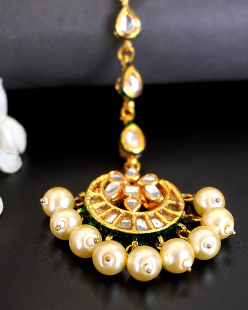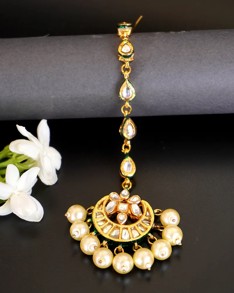Grace your traditional attire with this stunning maang tikka, intricately designed in a golden finish and adorned with tear-shaped kundan stones along the chain. The crescent-shaped pendant is beautifully accented with champagne pearls and mirror-like stones, creating a radiant, royal charm. Perfect for weddings, festive occasions, or cultural celebrations, this maang tikka adds a touch of timeless elegance to any ethnic ensemble.
