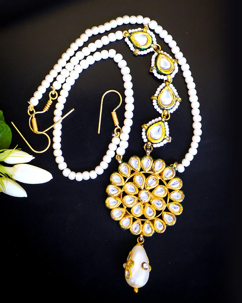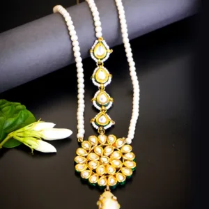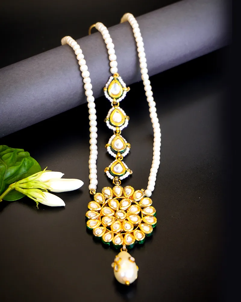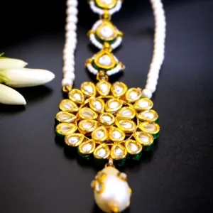 Elevate your bridal or festive look with this stunning Kundan pearl mangtikka. Featuring a radiant floral design crafted with shimmering Kundan stones, the piece is bordered by delicate pearls and complemented by a hanging pearl drop. The dual-strand pearl chain adds grace and traditional charm, making it an exquisite choice for weddings, festivals, and special occasions. A perfect blend of regal elegance and cultural richness.