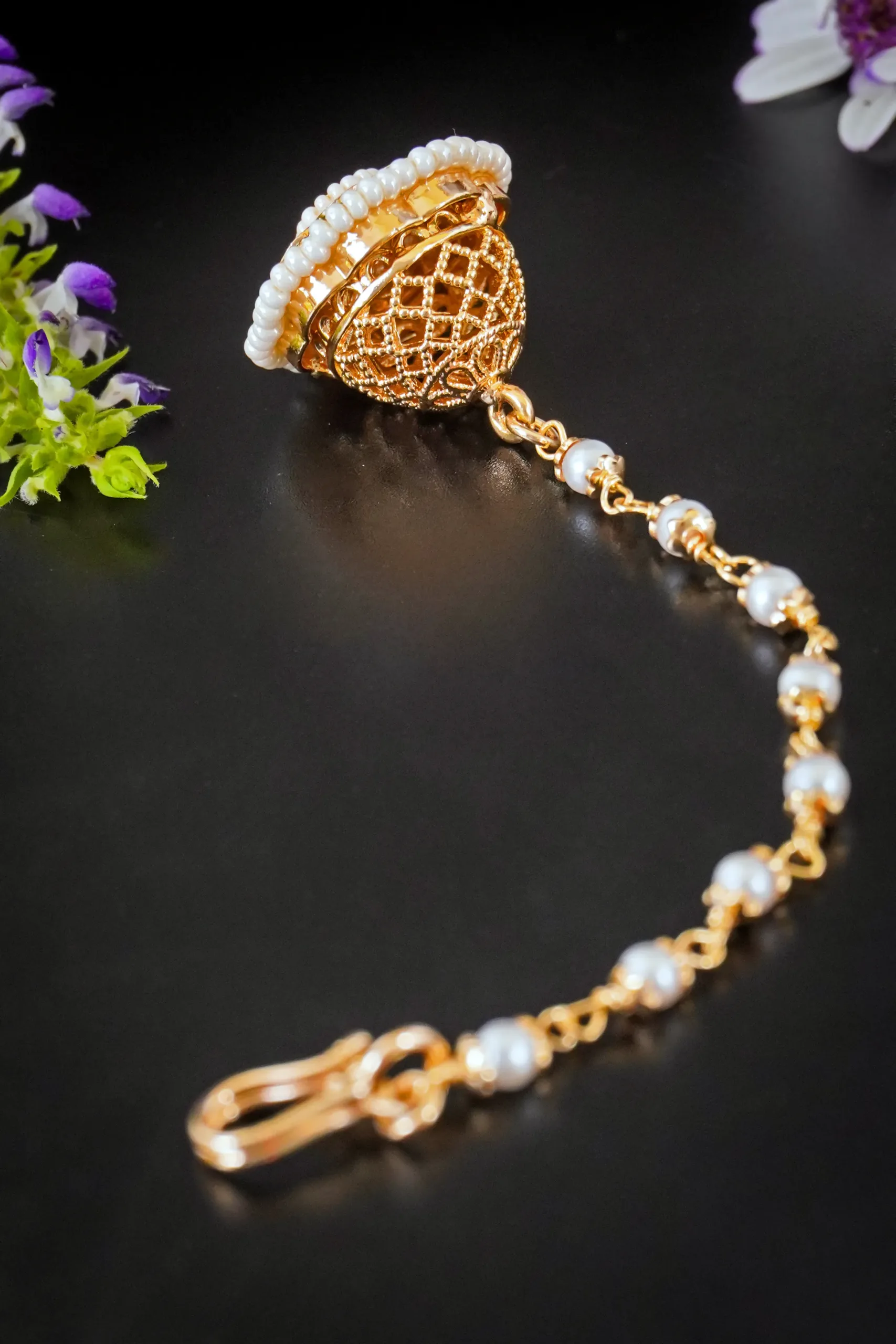 Add timeless charm to your ethnic look with this beautifully handcrafted floral rakhdi. Featuring a traditional circular design adorned with kundan stones, delicate faux pearls, and a central green accent, it radiates elegance. Ideal for weddings, festivals, and other grand occasions, this piece brings regal flair to any ensemble.