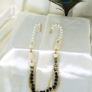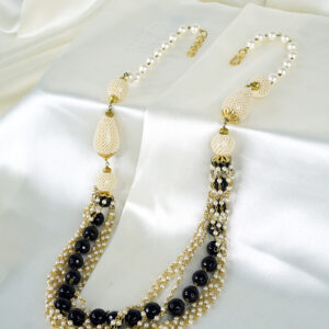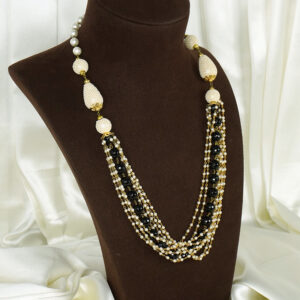 This exquisite necklace is a striking combination of traditional craftsmanship and modern elegance. Featuring multiple strands of lustrous off-white pearls intricately woven with polished black onyx gemstones, the design radiates sophistication and poise. The upper part is adorned with intricately beaded white balls and drops, handcrafted with delicate pearl work, enhancing its grandeur. The necklace is finished with gold-toned metal accents and a secure clasp, making it perfect for weddings, festive occasions, or as a luxurious gift.
