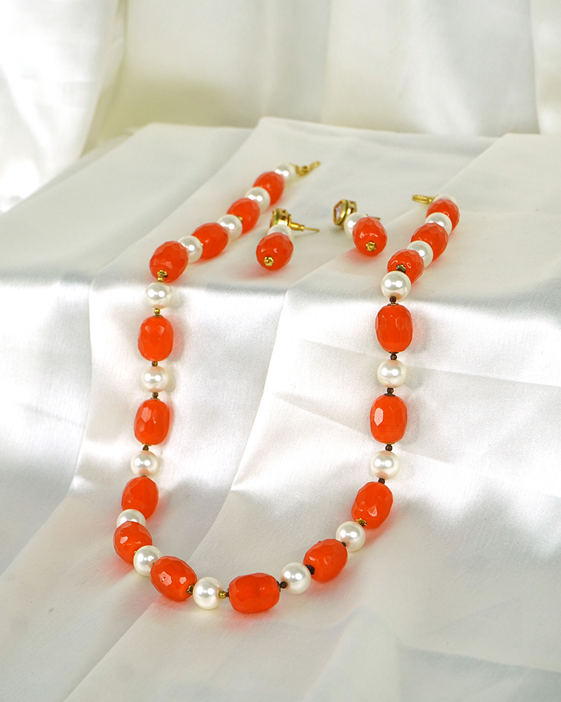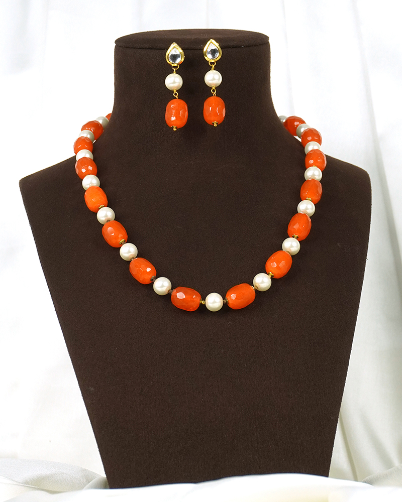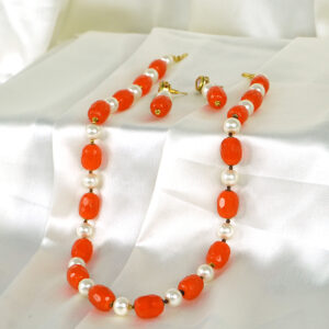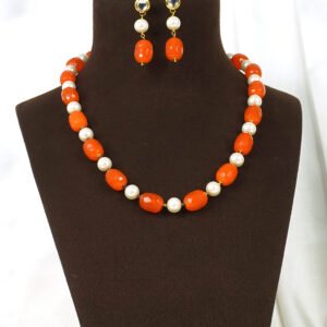 This vibrant and elegant beaded neckpiece set features alternating faceted orange beads and smooth white pearl-like beads, creating a bold and graceful aesthetic. The set includes a matching pair of earrings, perfectly coordinated for a complete look. The necklace is designed for ease of wear and pairs beautifully with both ethnic and fusion attire.