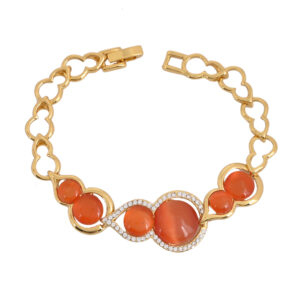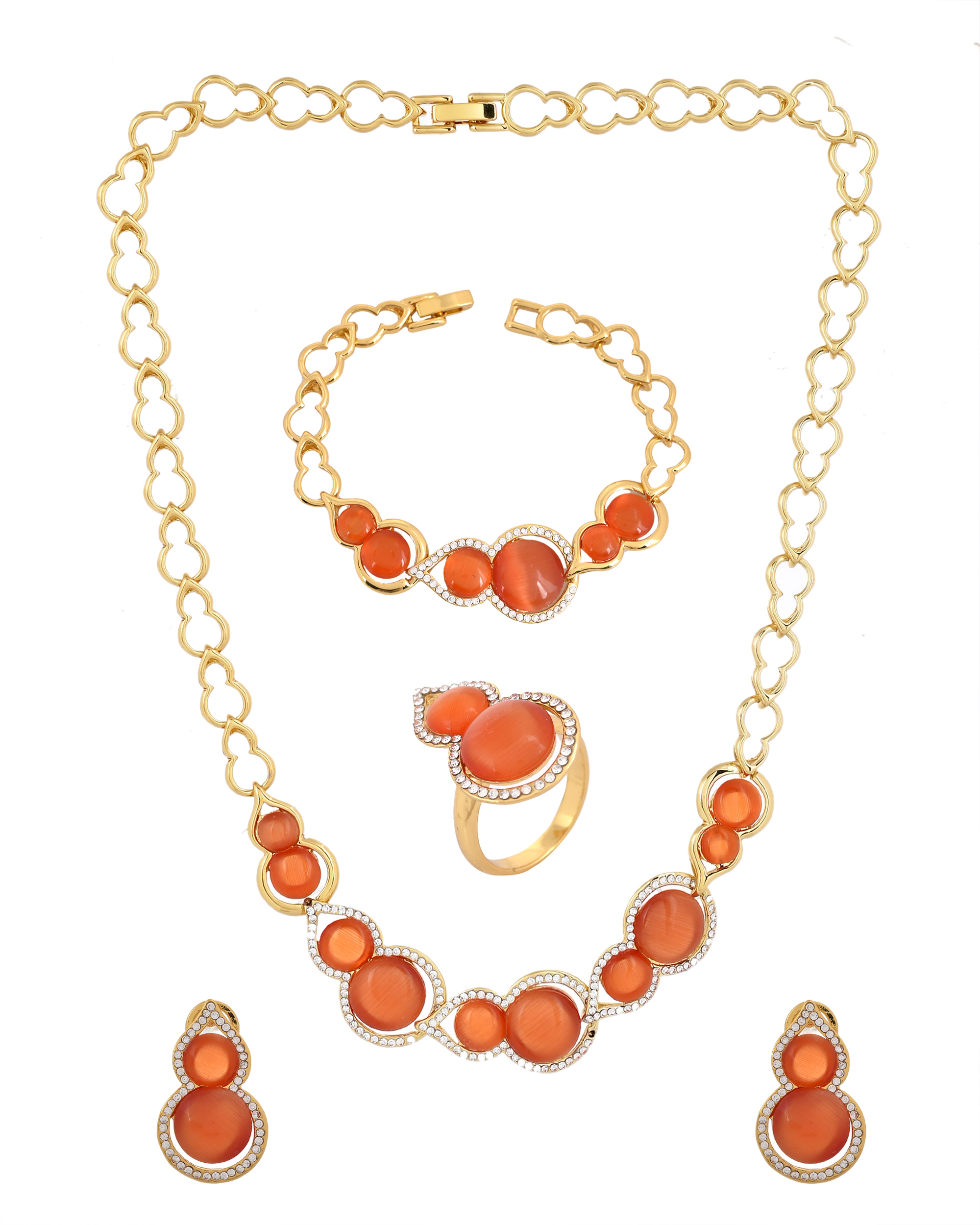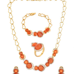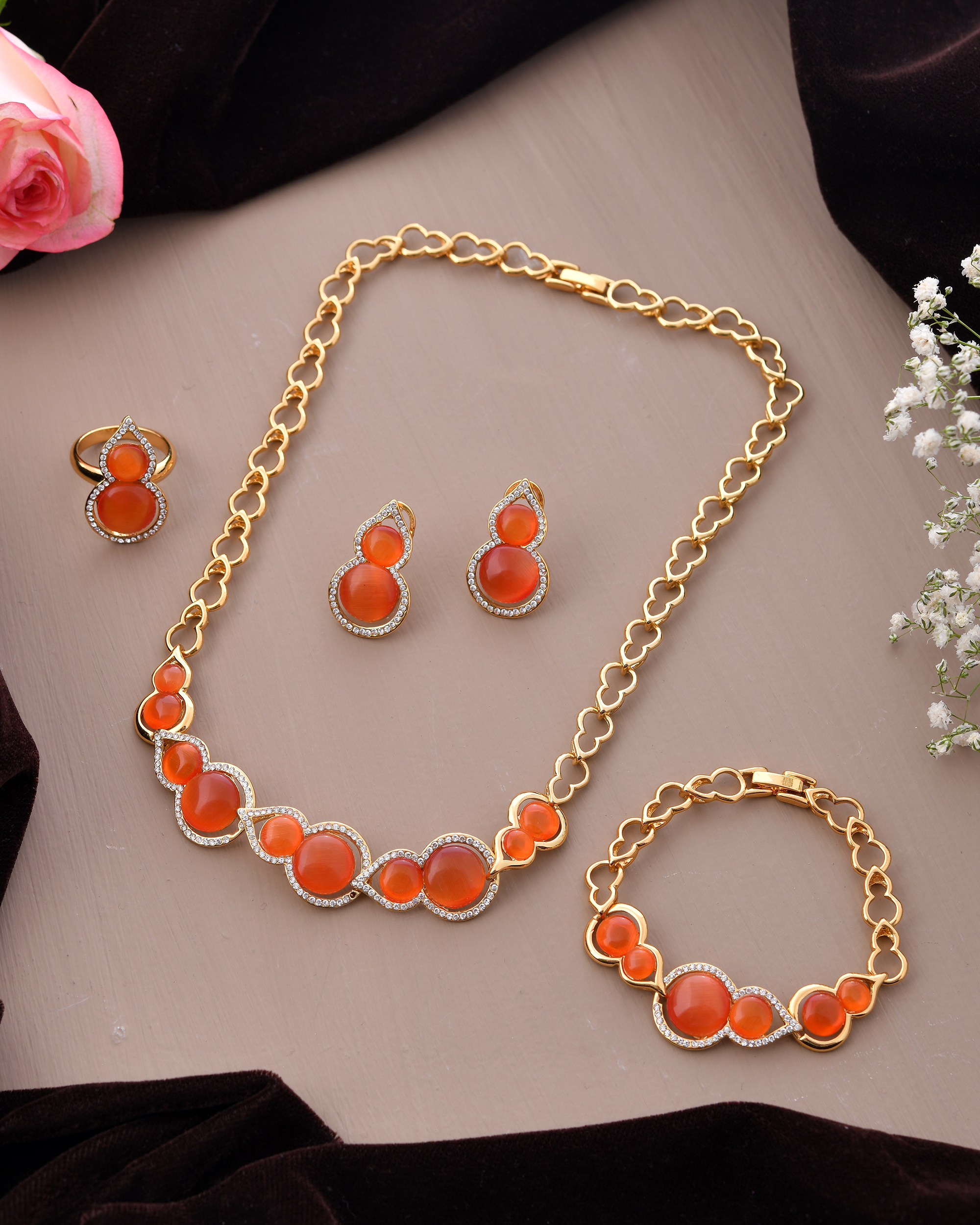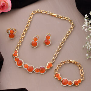 Enhance your elegance with this stunning gold-plated jewelry set featuring radiant orange stones. The set includes a beautifully crafted necklace, matching earrings, a statement ring, and a charming bracelet. Each piece is designed with heart-shaped chain links and shimmering rhinestone accents around the stones for added sparkle. Ideal for weddings, parties, and festive occasions, this jewelry set adds a bold yet graceful touch to any outfit.