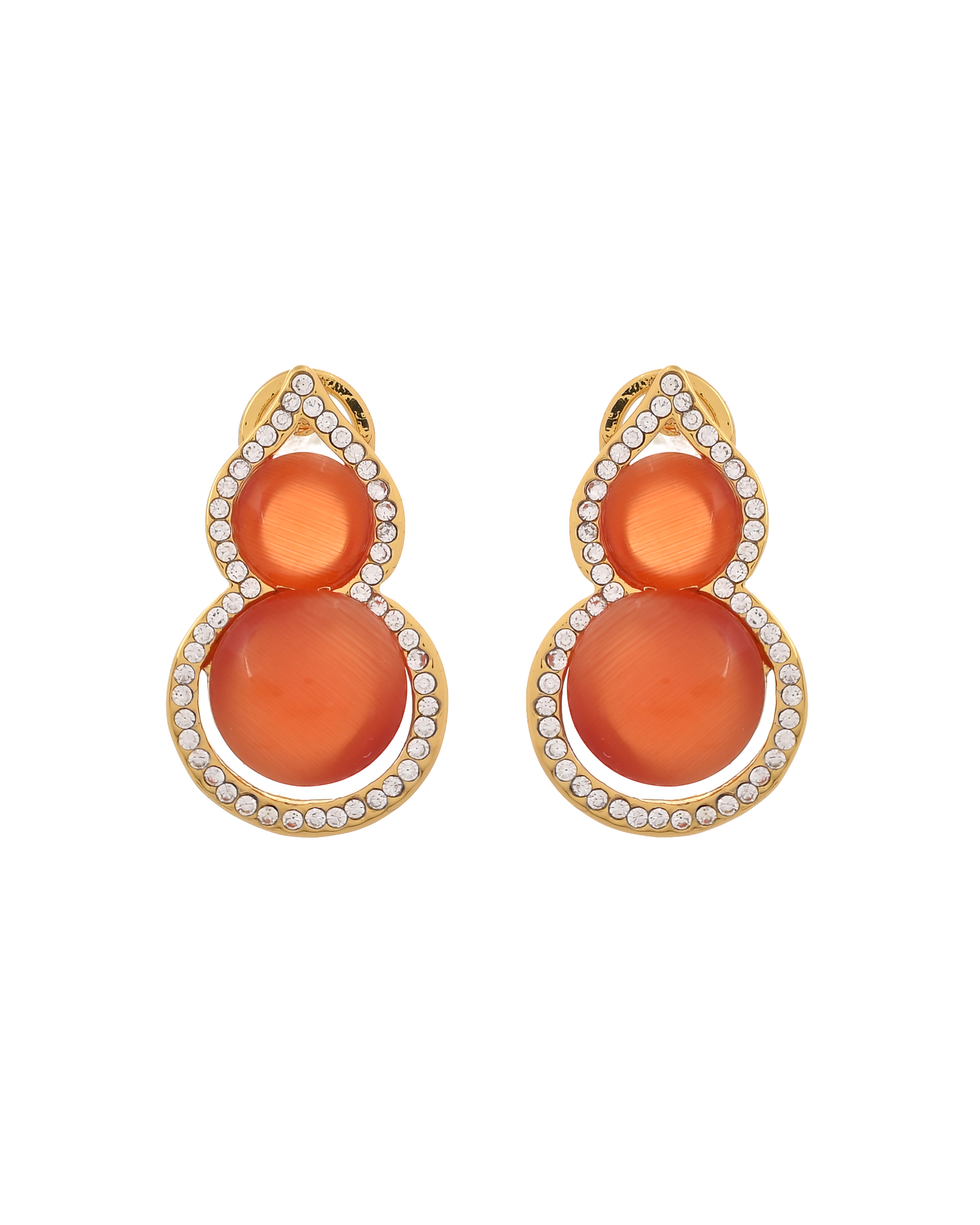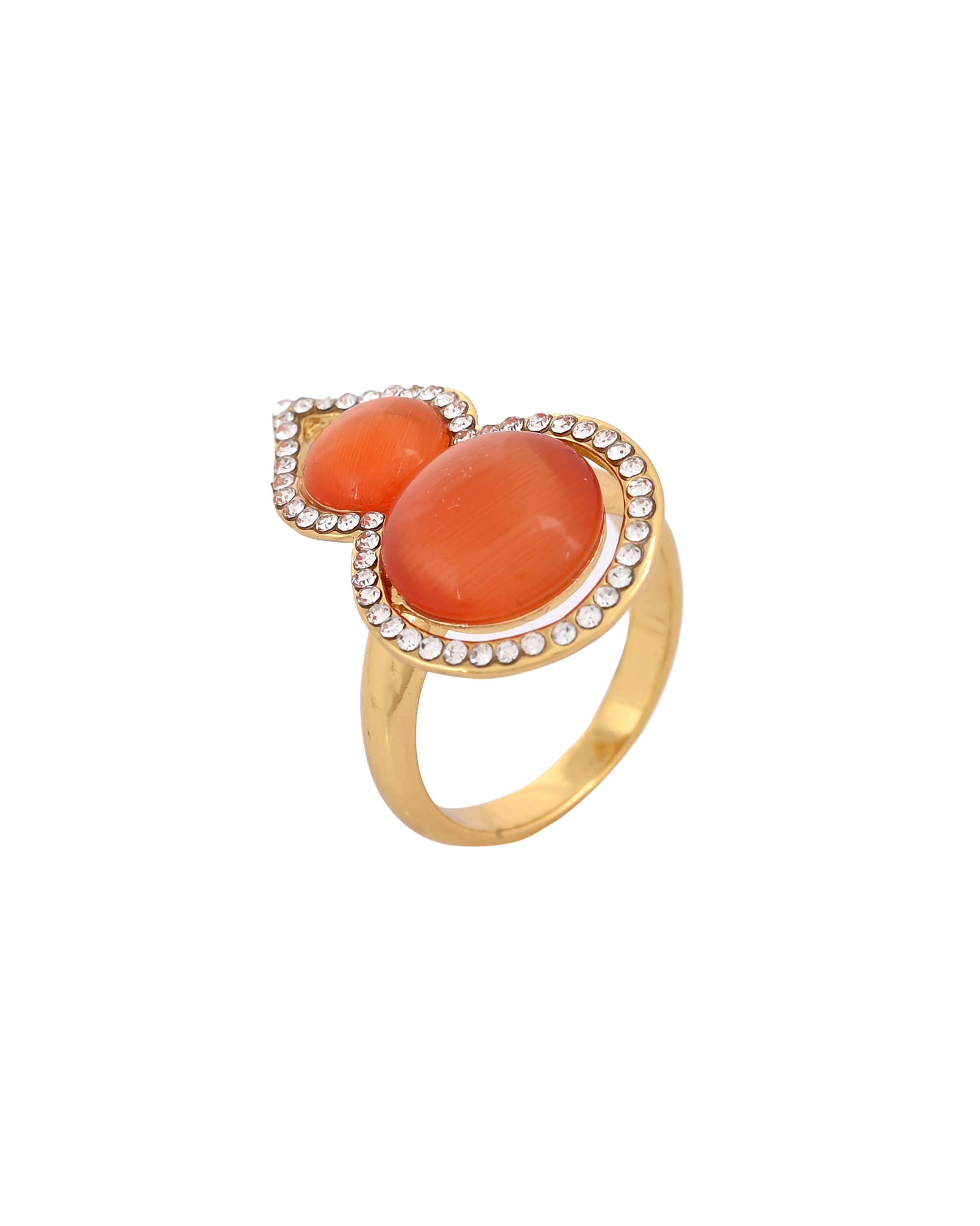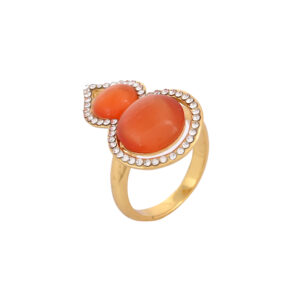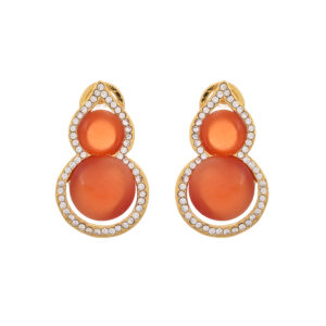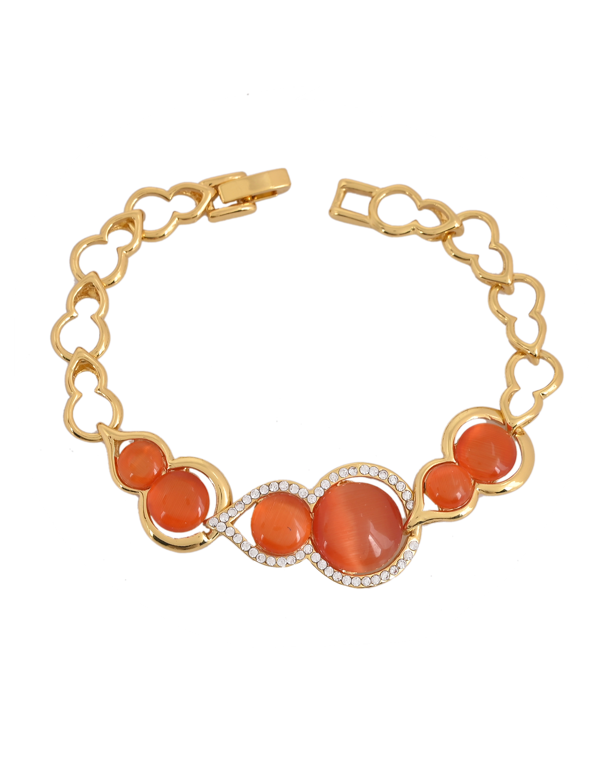 Enhance your elegance with this stunning gold-plated jewelry set featuring radiant orange stones. The set includes a beautifully crafted necklace, matching earrings, a statement ring, and a charming bracelet. Each piece is designed with heart-shaped chain links and shimmering rhinestone accents around the stones for added sparkle. Ideal for weddings, parties, and festive occasions, this jewelry set adds a bold yet graceful touch to any outfit.