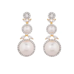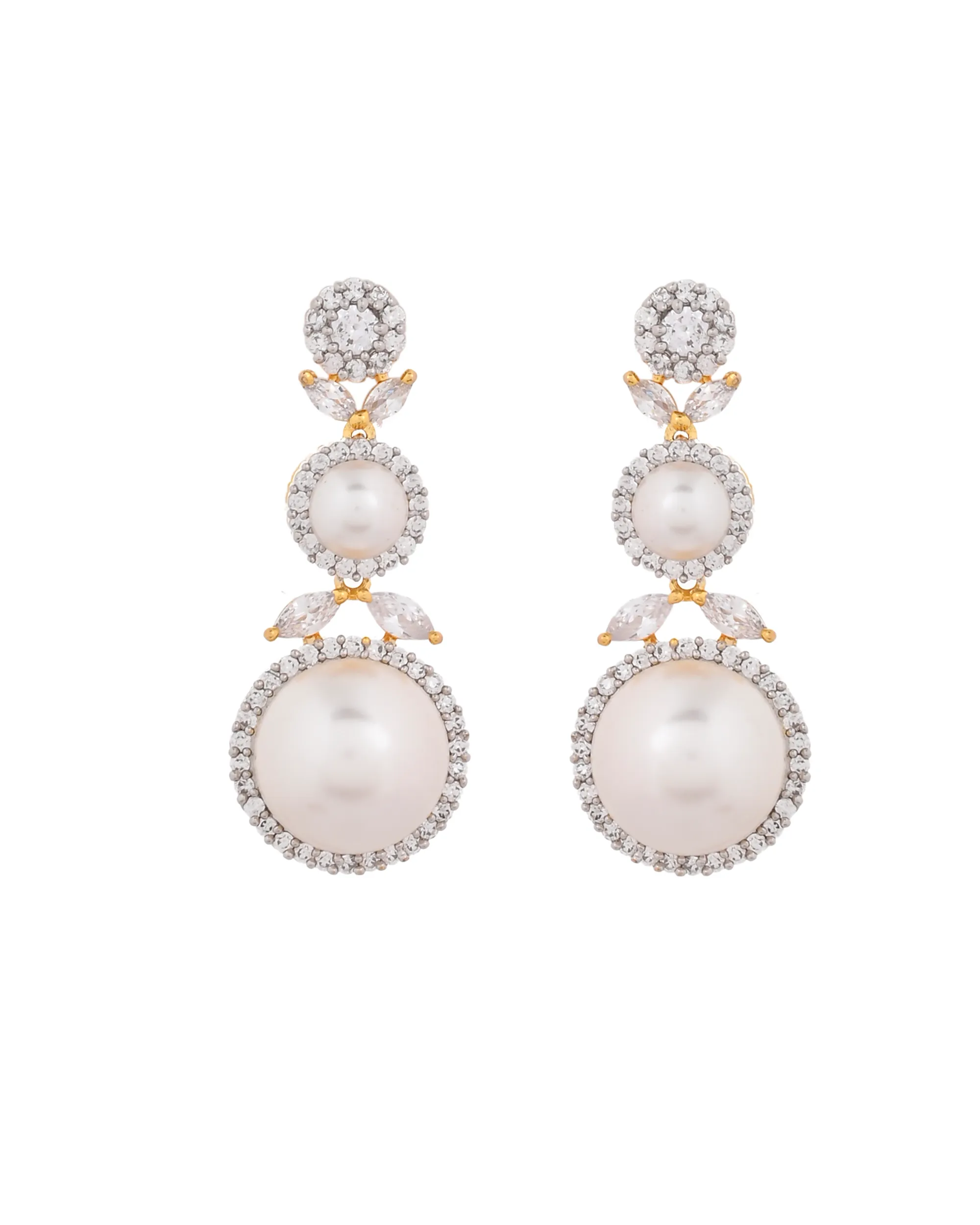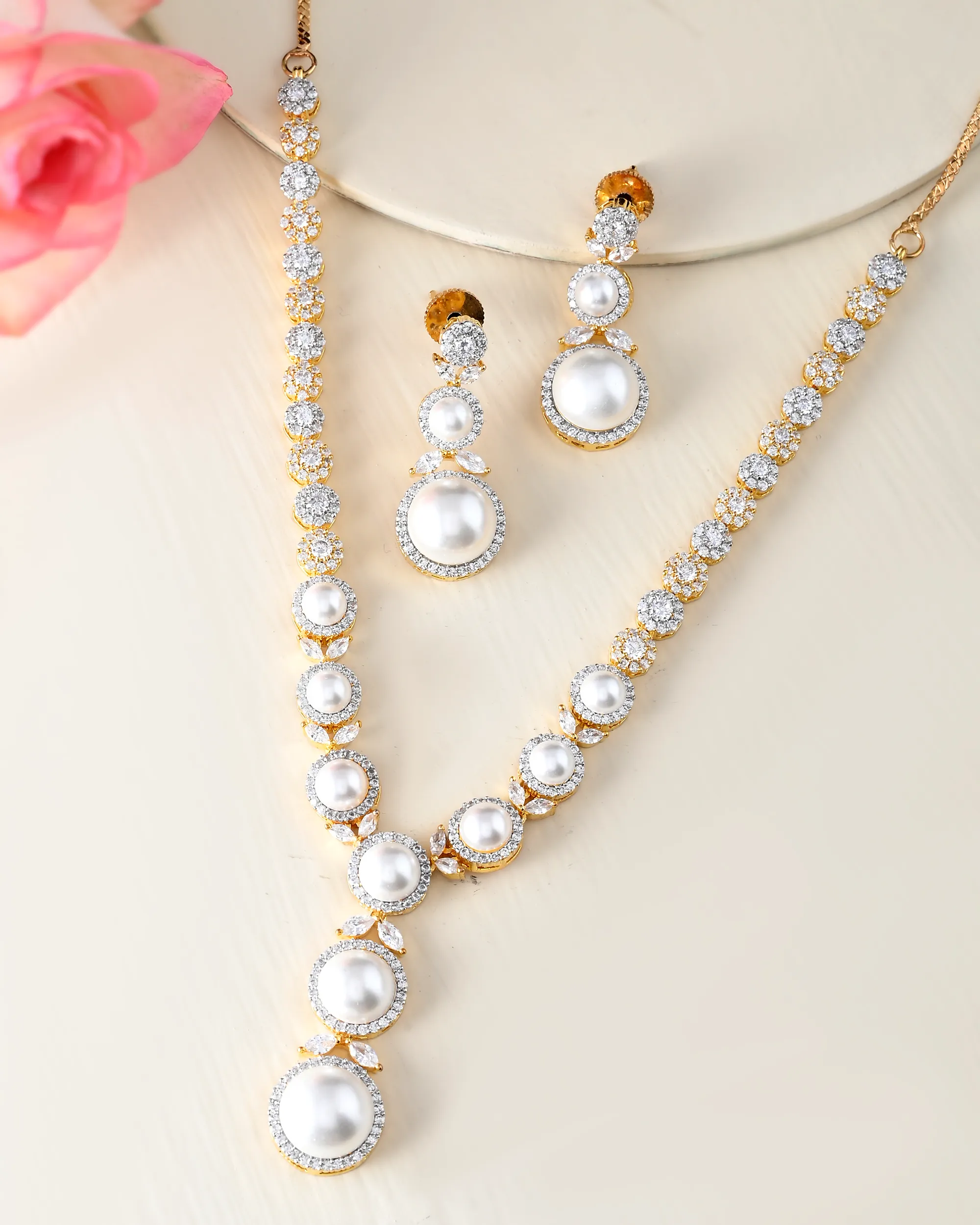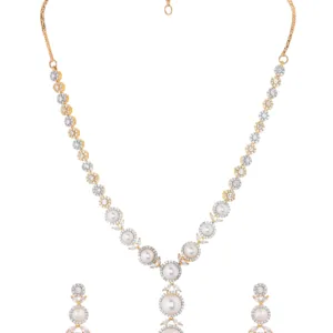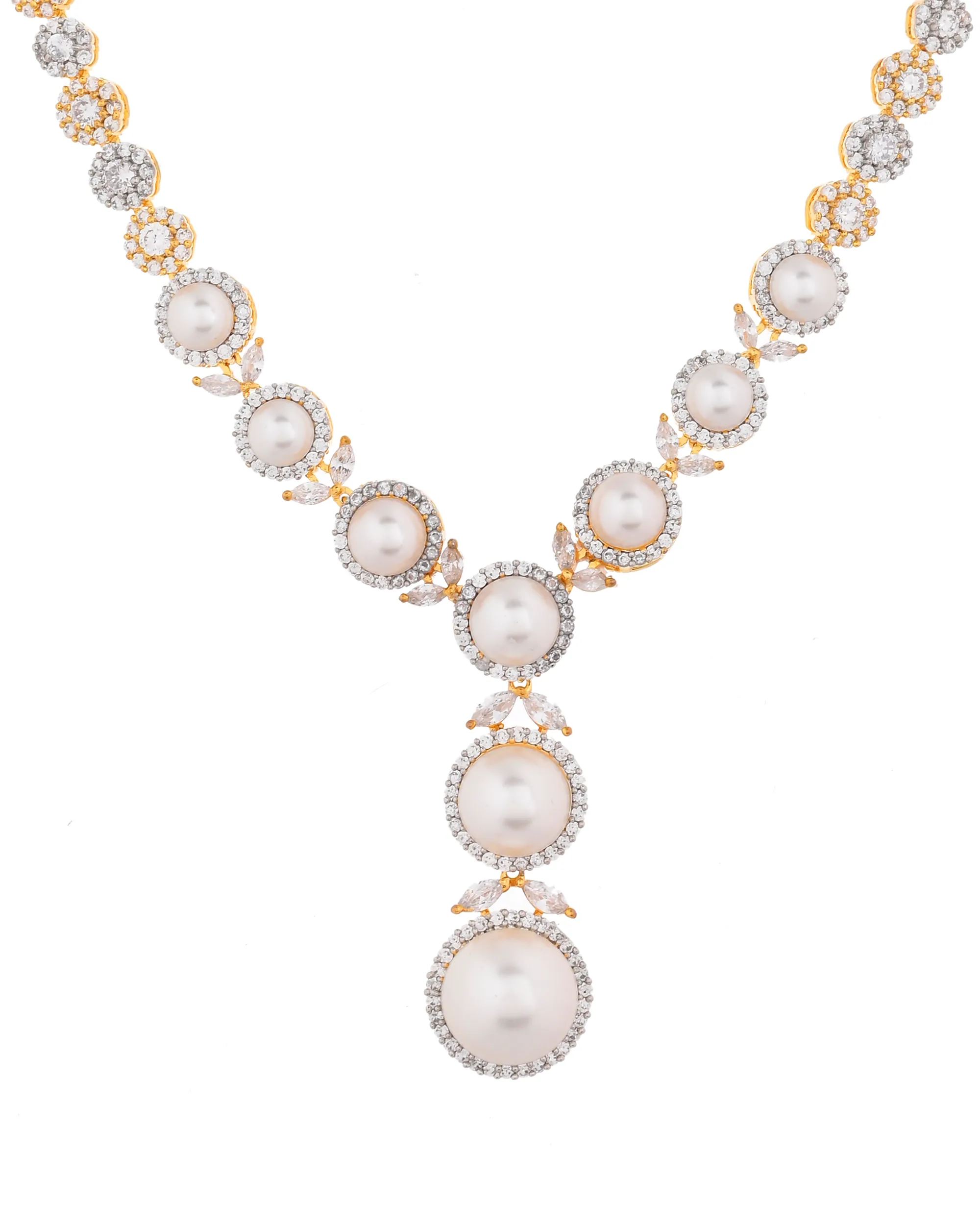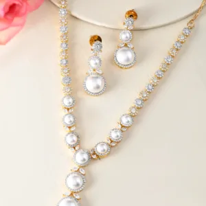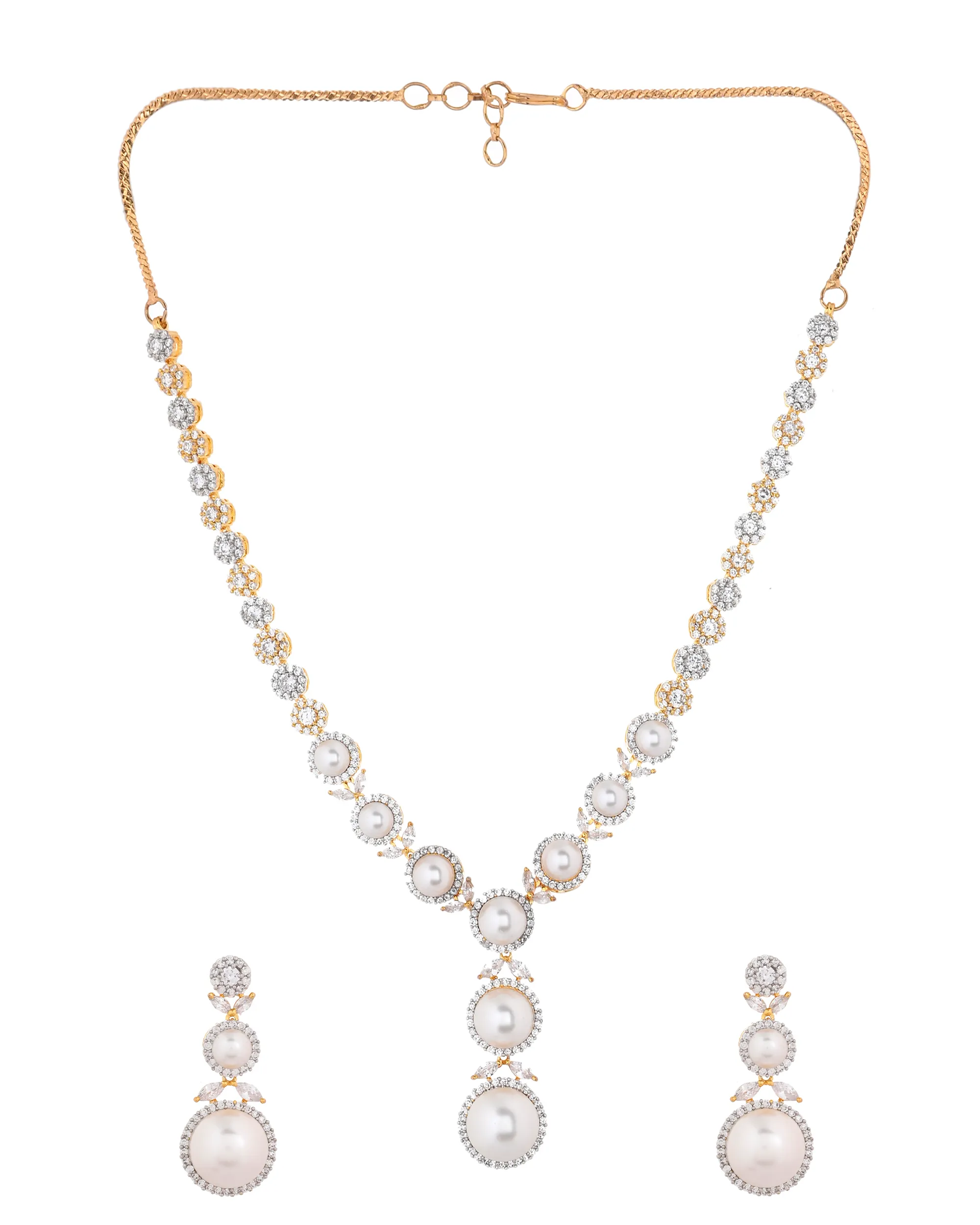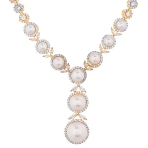This exquisite necklace set features a luxurious design adorned with radiant white pearls and sparkling diamonds set in a gold-toned base. The set includes a beautifully crafted necklace and a matching pair of drop earrings. Each pearl is encircled by dazzling stones, creating a timeless and sophisticated look perfect for weddings, parties, or special occasions. Enhance your elegance with this statement jewelry piece that blends classic charm with modern allure.