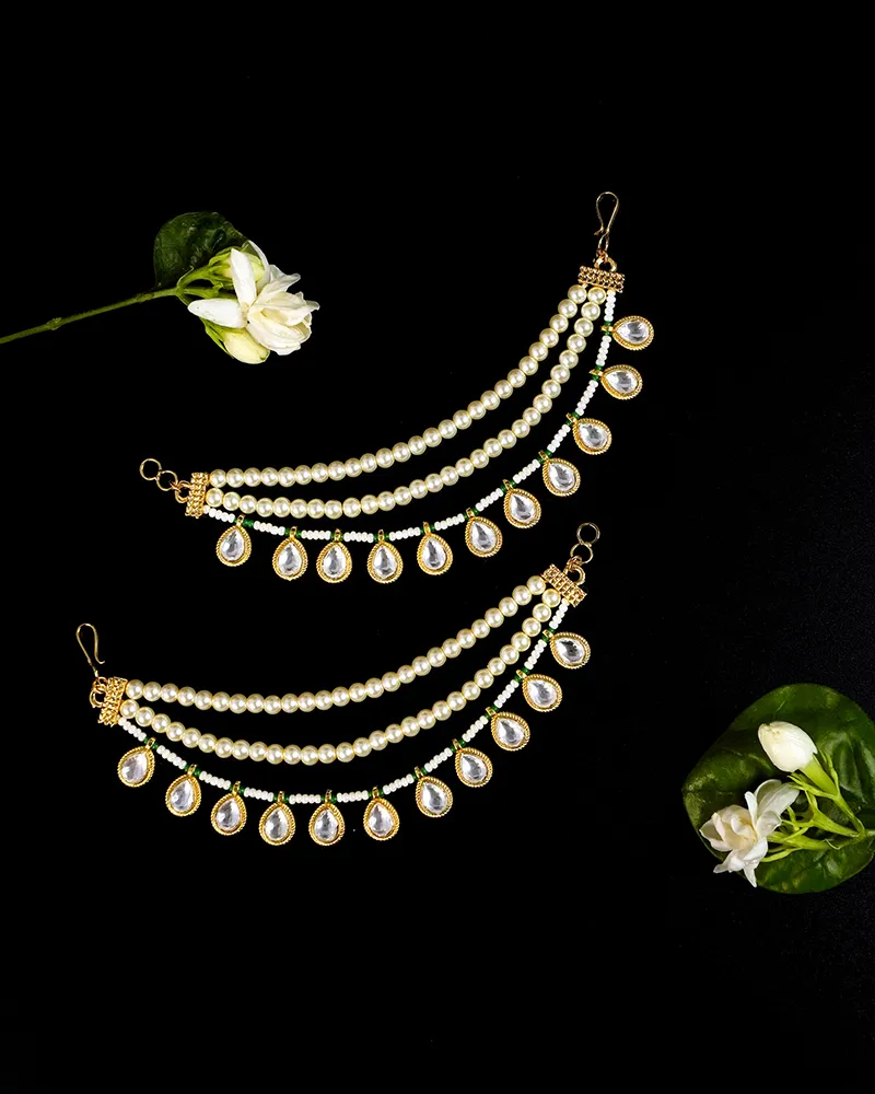 These exquisite ear chains are a stunning blend of traditional craftsmanship and elegant design. Featuring dual strands of luminous pearls, each ear chain is adorned with intricately set teardrop-shaped Kundan stones framed in golden accents. The delicate green bead detailing adds a touch of vibrant contrast, enhancing the overall aesthetic. Perfect for weddings, festive occasions, or traditional events, these ear chains beautifully complement ethnic attire, lending an air of regal charm and timeless beauty.