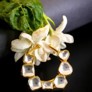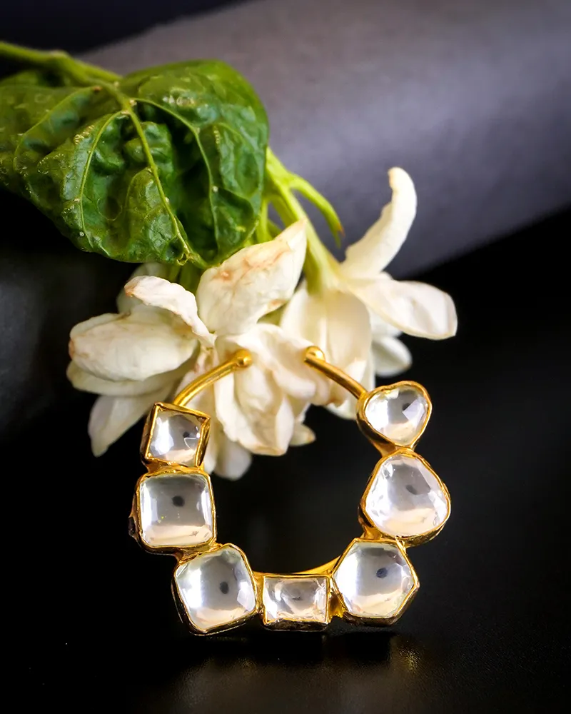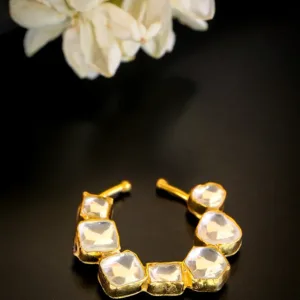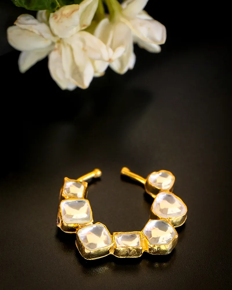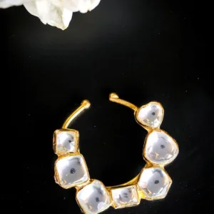 A beautiful handcrafted nose ring adorned with a stunning array of polki kundan stones in varied shapes, set in a rich gold-tone finish. This traditional yet stylish piece adds an ethereal charm to bridal and festive looks, offering a perfect blend of heritage and contemporary appeal.