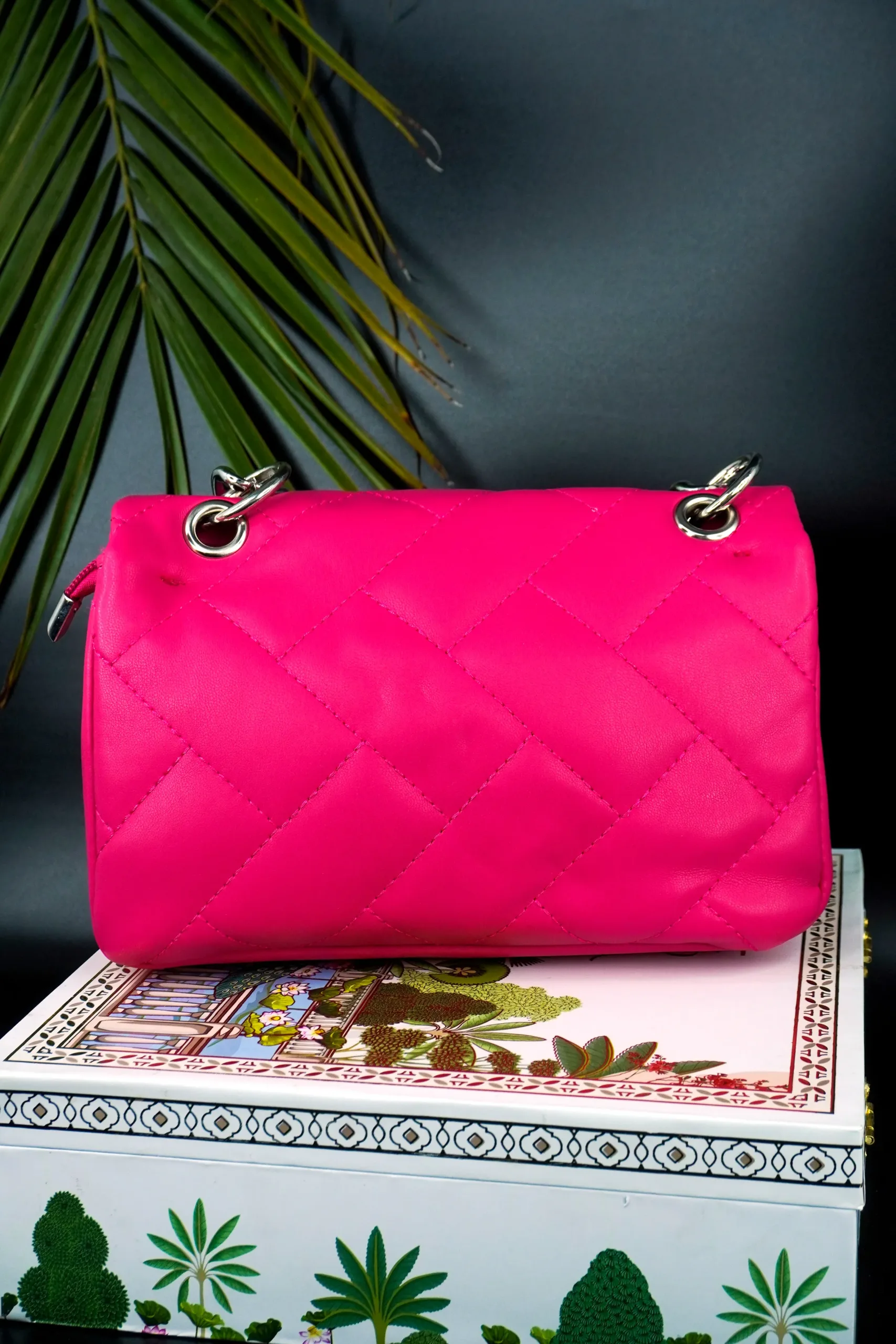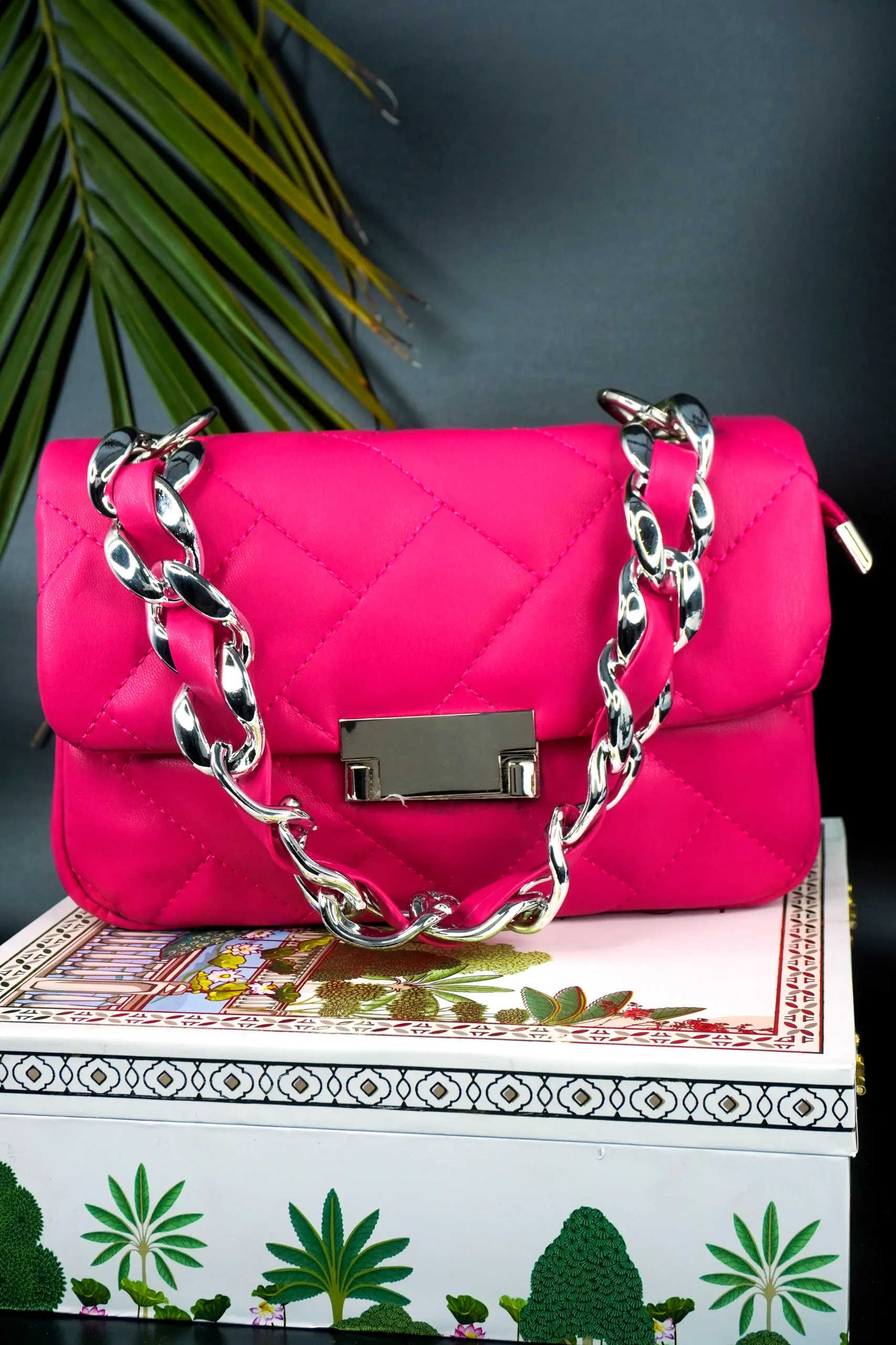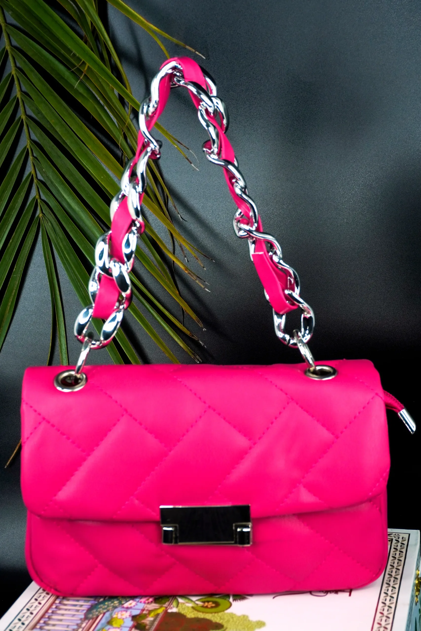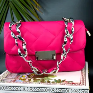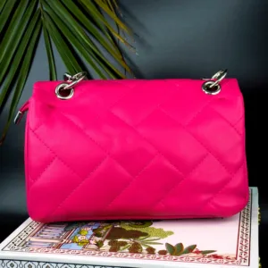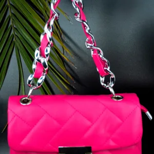 This stylish quilted handbag features a sophisticated stitched pattern and a sleek metallic clasp on the front flap. Designed with a striking chain strap interwoven with matching material, it effortlessly blends modern flair with timeless elegance. Perfect for day-to-night transitions, this compact accessory adds a chic touch to any outfit.