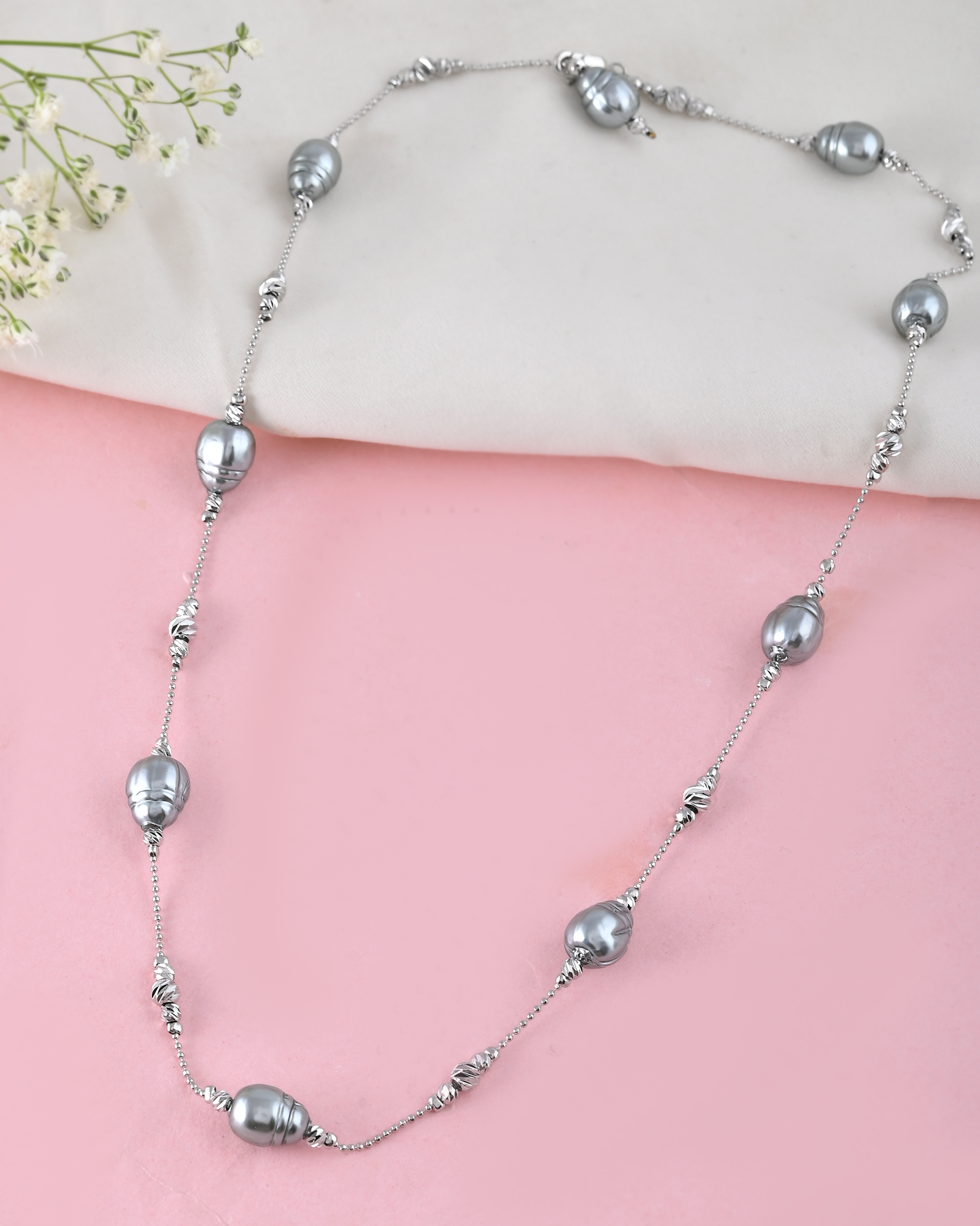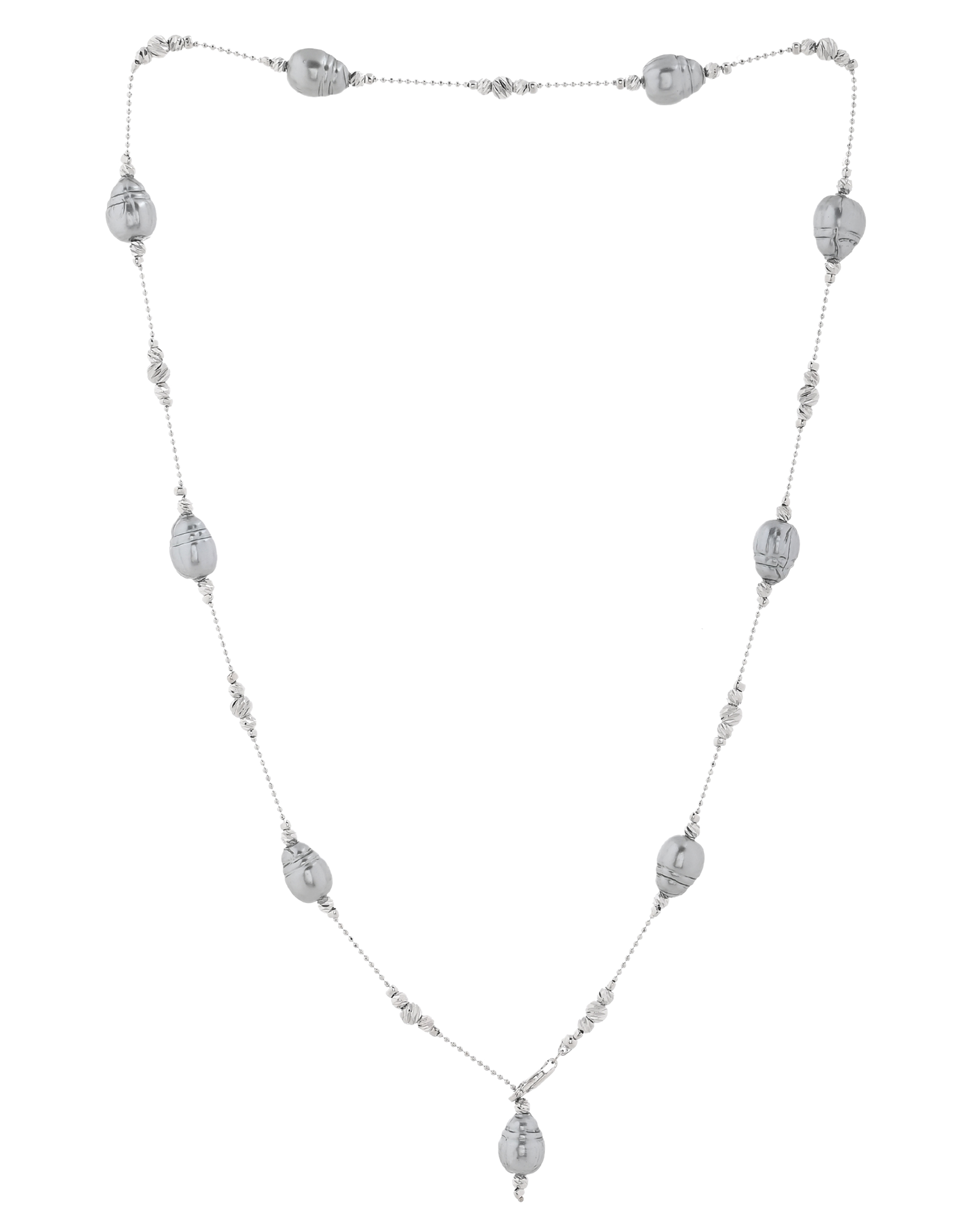 A stunning blend of silver-toned baroque pearls and intricate silver beadwork. This necklace is perfect for those who love a modern yet timeless aesthetic.