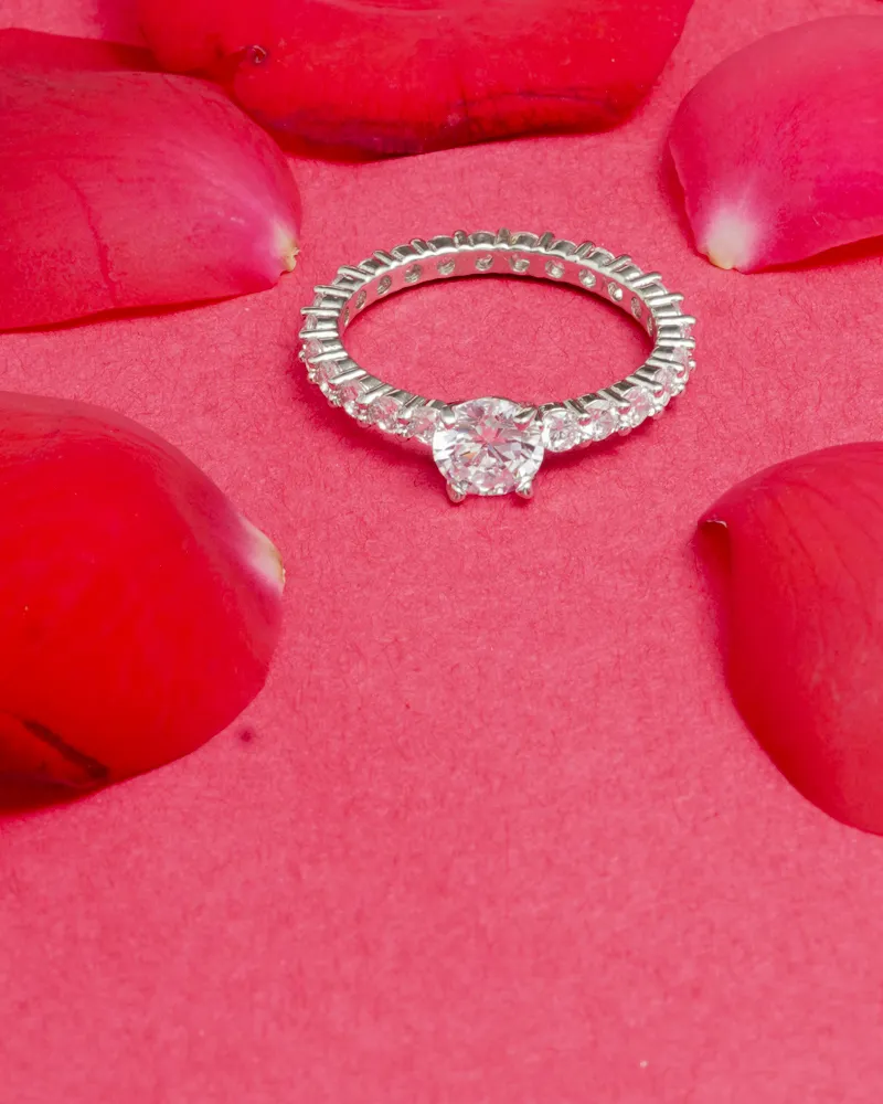 This ring is fully studded with tiny shining stones and features a large center stone, giving it a rich and classy look ? perfect for parties and wedding functions.