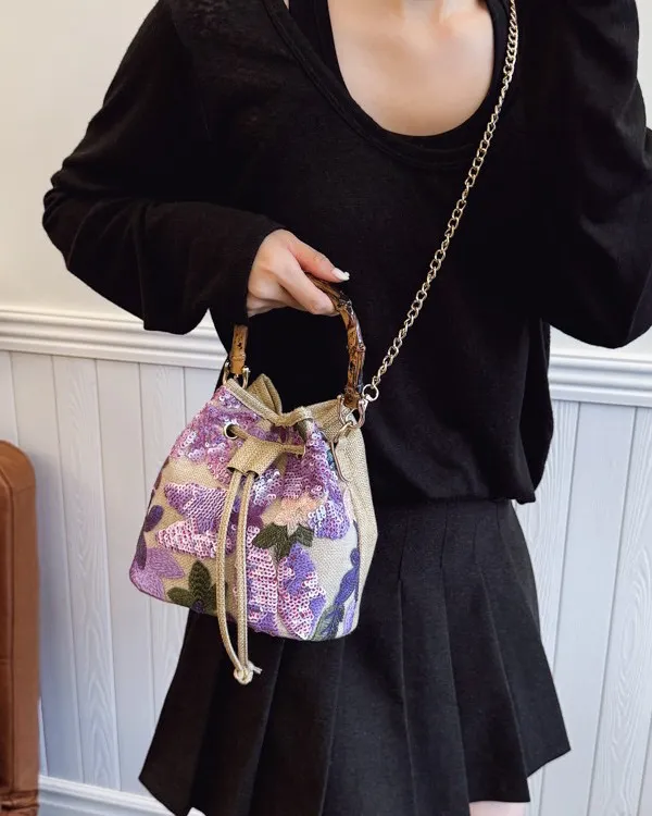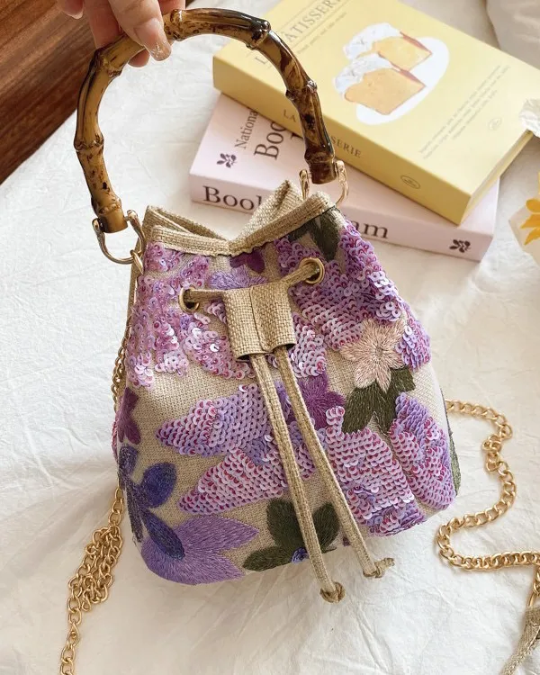 A stylish jute with floral embroide and the sturdy hundel and also having a chain