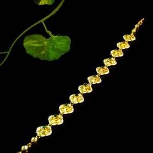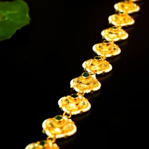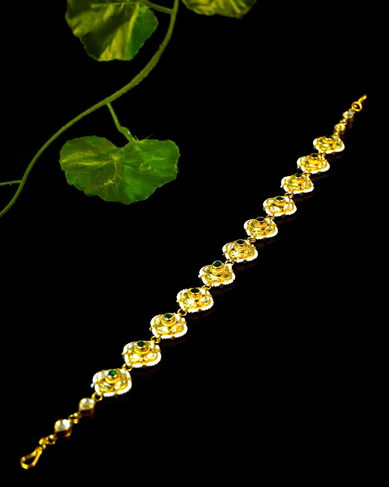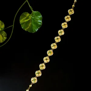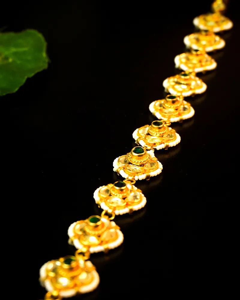 Add a splash of royal elegance to your ensemble with the Emerald Glow Floral Matha patti. This exquisite headpiece features a chain of delicate floral motifs, each adorned with radiant green stones at the center, surrounded by shimmering kundan work and micro pearls. The symmetrical design and gold-toned finish evoke a timeless charm, perfect for enhancing your traditional look. Ideal for bridal wear or festive occasions, this piece adds a graceful touch of luxury and vibrant color to your forehead adornment collection.