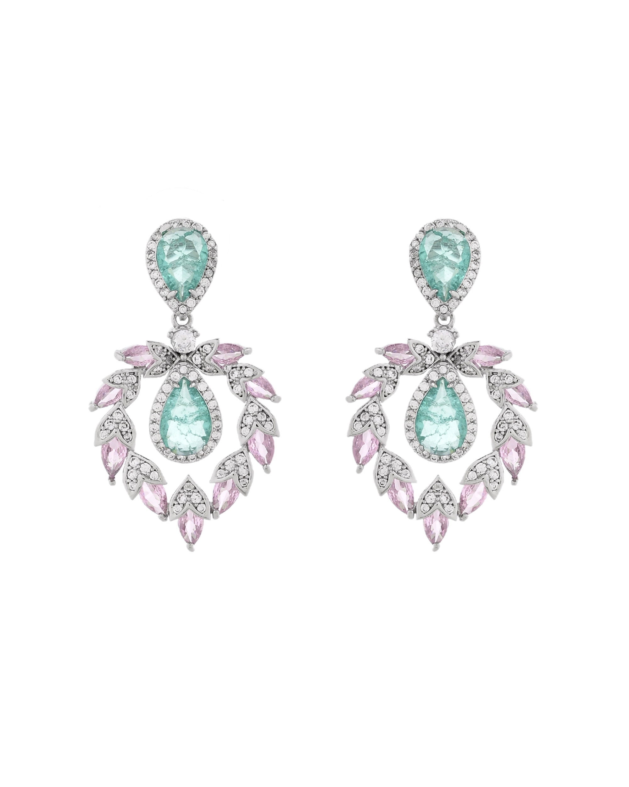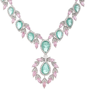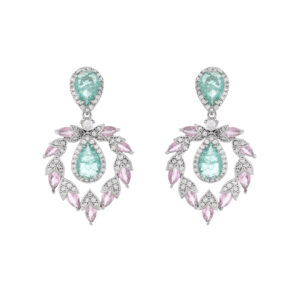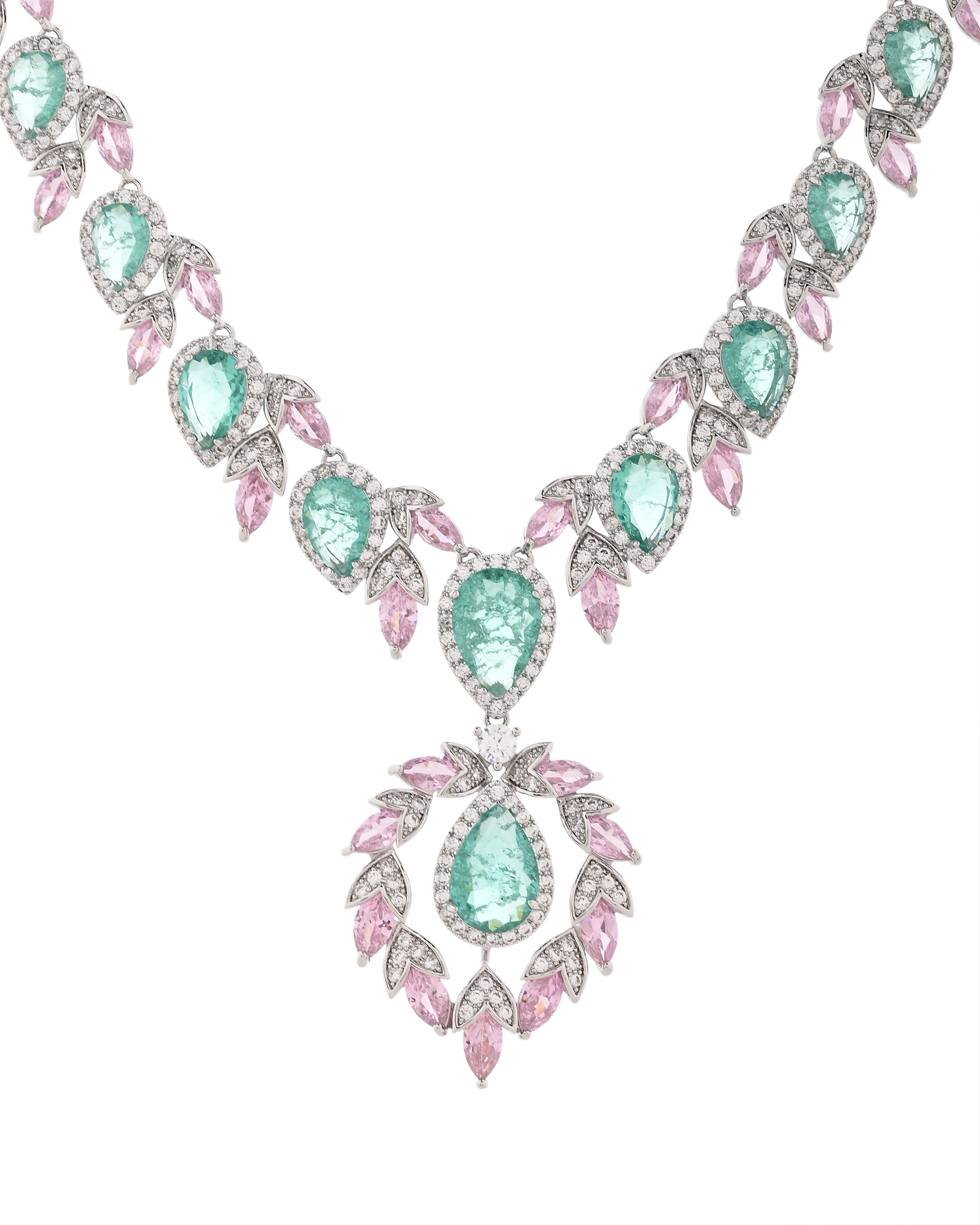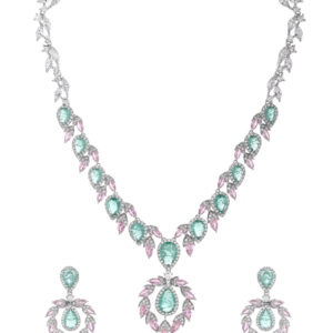 Make a statement of sheer elegance with this enchanting necklace set, beautifully adorned with pear-shaped emerald green stones encircled by delicate pink and white crystal leaves. The intricate floral-inspired design extends through the necklace and matching earrings, radiating charm and sophistication. Perfect for bridal wear, festive celebrations, or upscale gatherings, this set offers a graceful blend of color and sparkle that captures attention effortlessly. Let this dazzling creation elevate your every special moment.