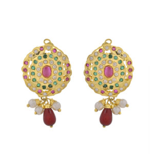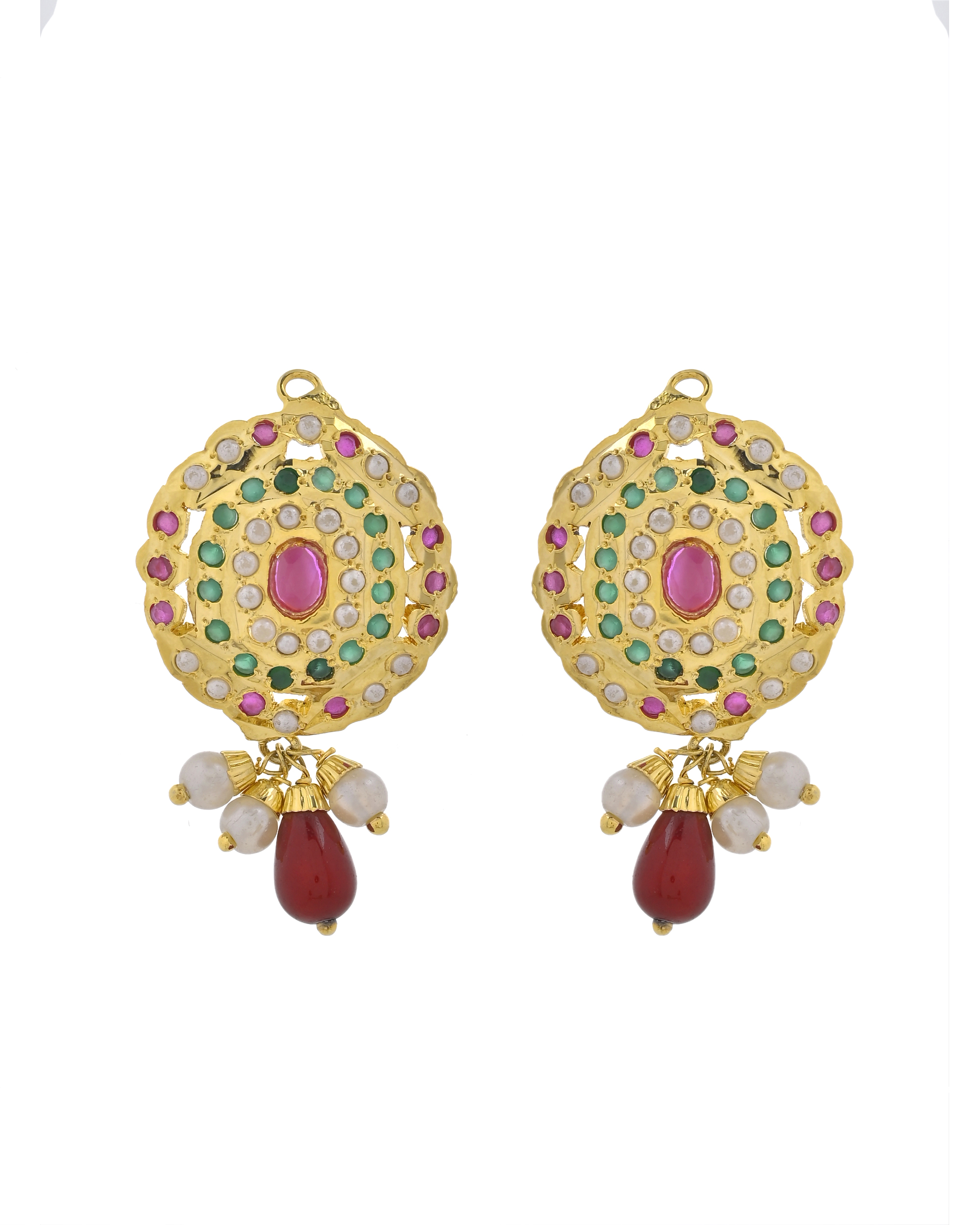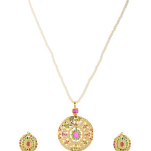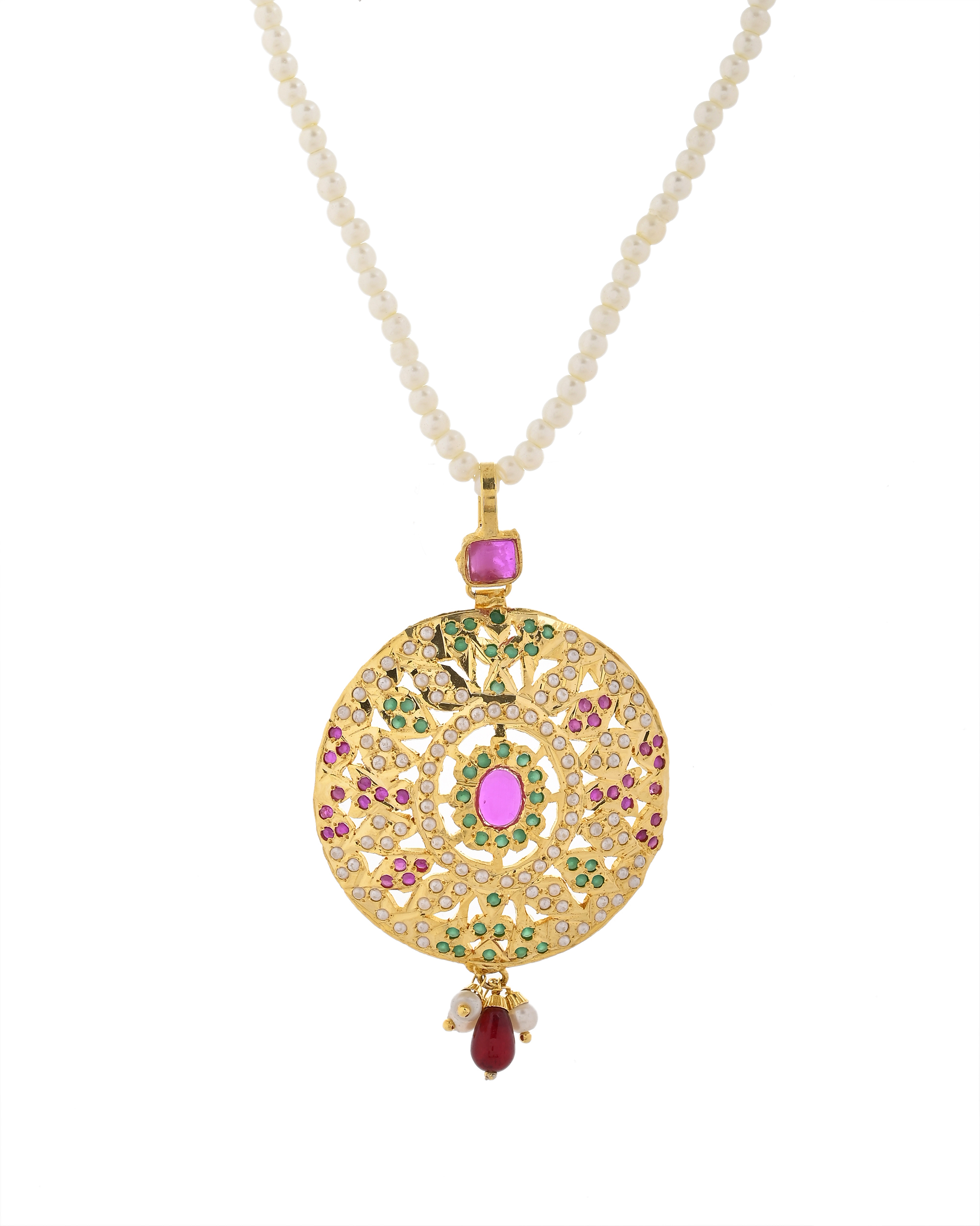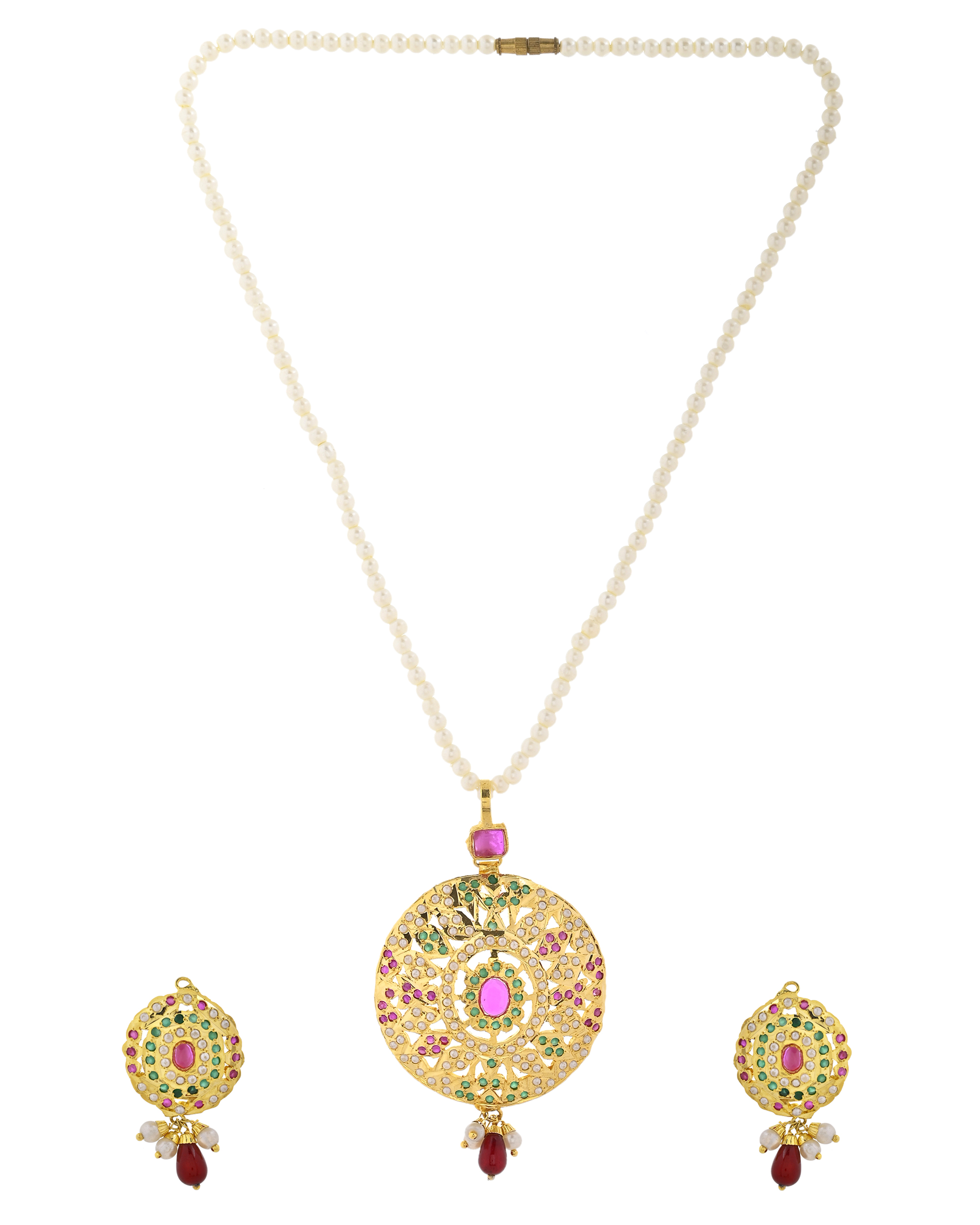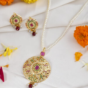 A beautifully handcrafted pearl necklace with a gold-toned pendant, adorned with colorful stones and intricate Kundan detailing. Comes with matching earrings, ideal for a traditional and regal look.