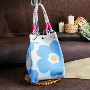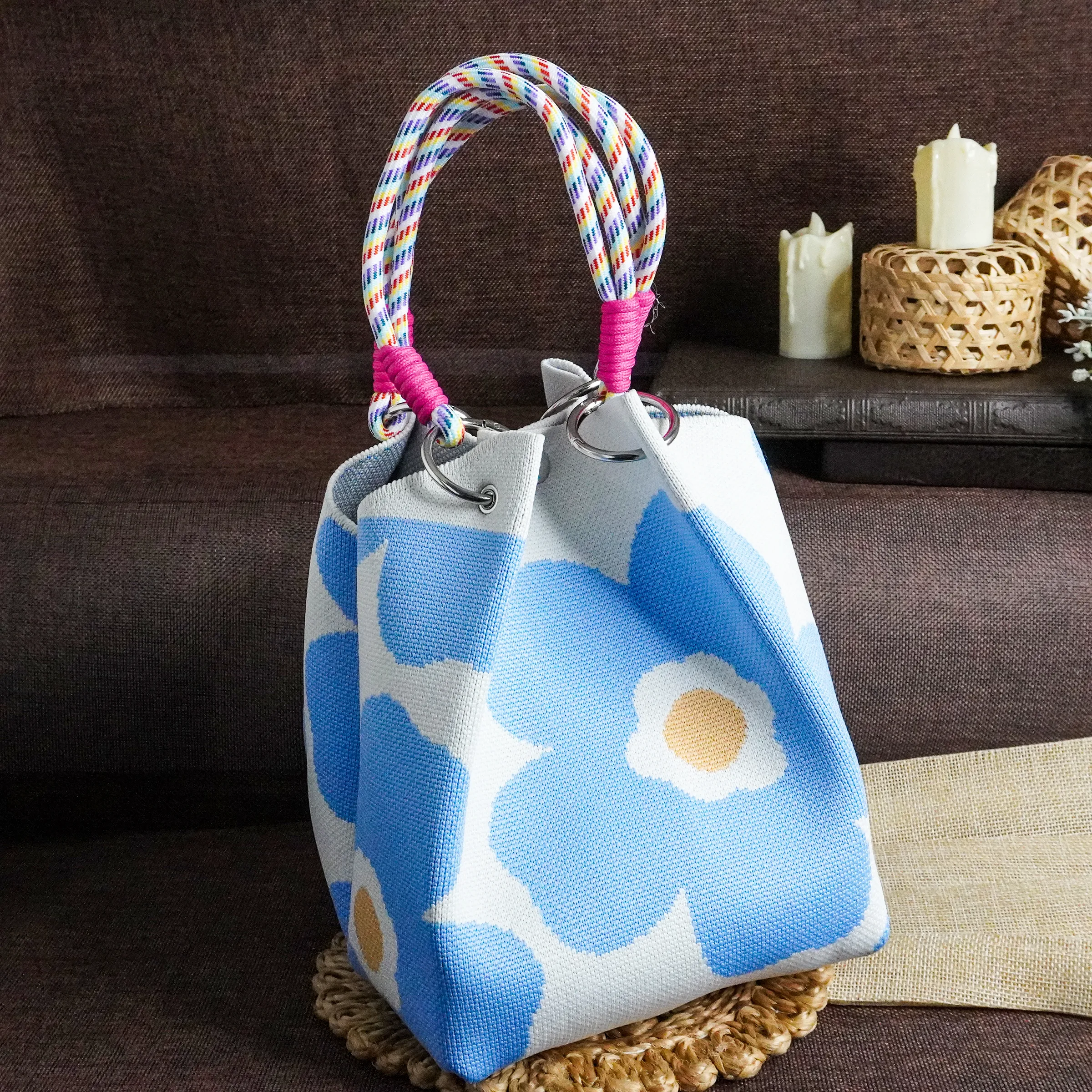This charming handmade tote bag showcases a bold floral pattern with large blue flowers and soft beige centers on a light background. The structured design is complemented by colorful, braided rope handles wrapped in pink accents, adding a playful touch. Silver-toned metal rings secure the handles, enhancing durability and style. This trendy and functional tote is perfect for casual outings, making a statement with its fresh and cheerful aesthetic. The rustic backdrop with woven elements and candles enhances its artisanal charm.