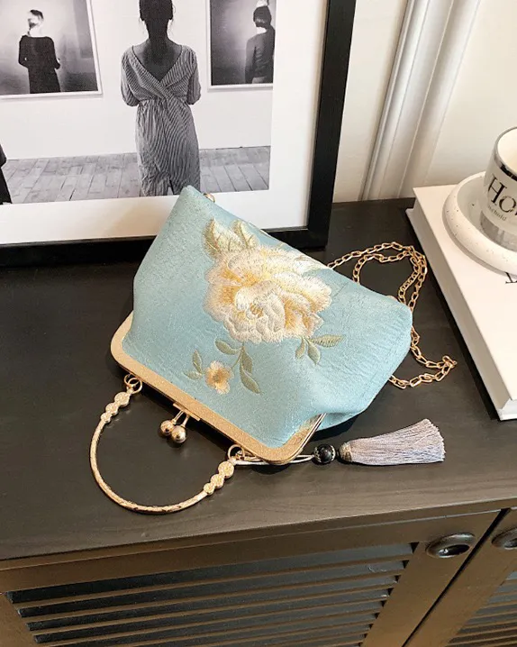 Elegant hand bag with a pearl chain and meatalic handel. Perfect for any event or party