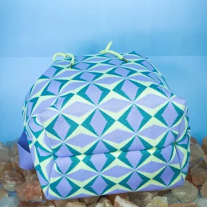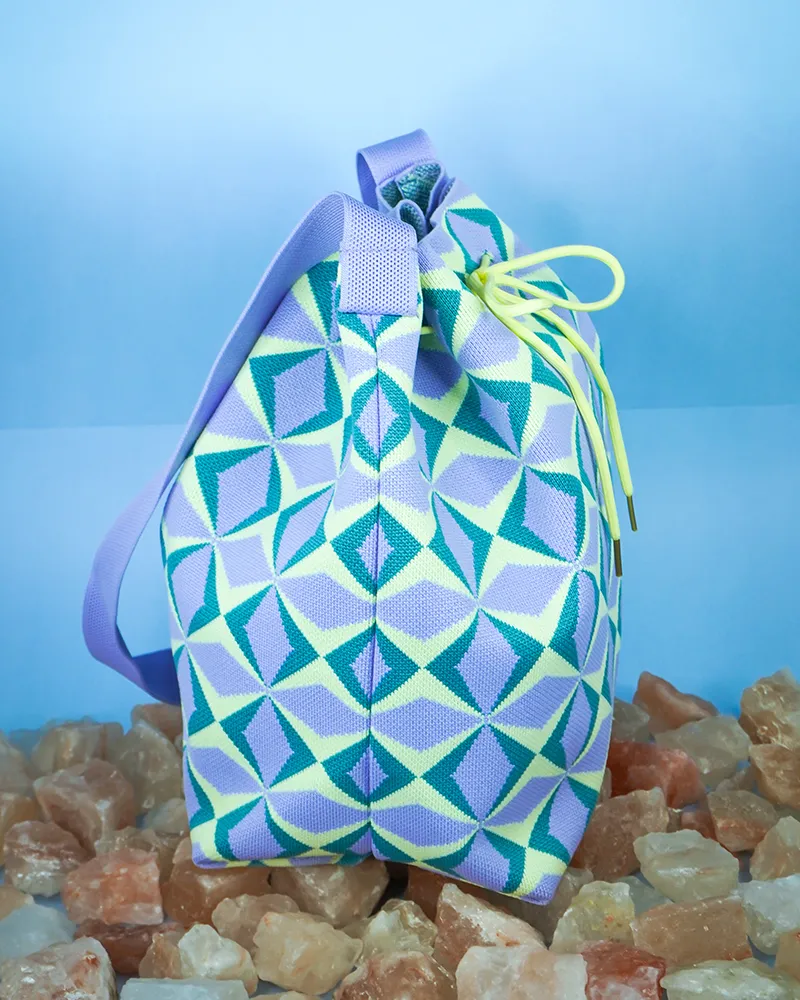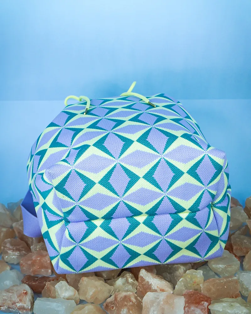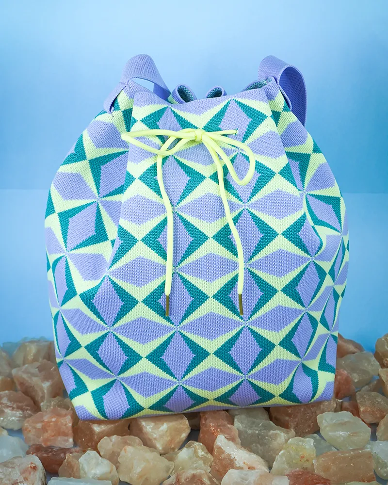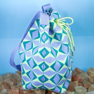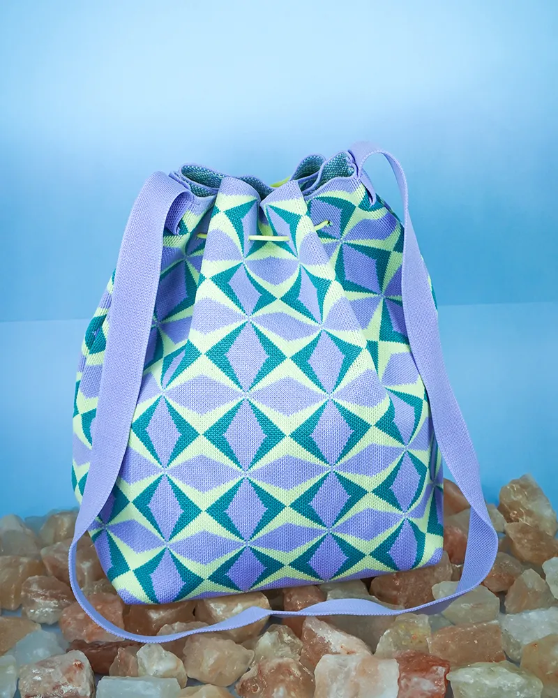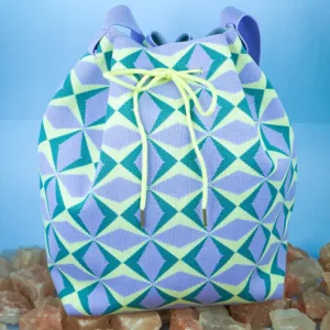 This bucket bag stands out with its bold geometric pattern that adds a lively and modern flair to any outfit. The drawstring closure provides a secure and adjustable opening, while the relaxed yet structured shape offers generous space for daily essentials. A perfect mix of fashion and function for those who love expressive accessories.