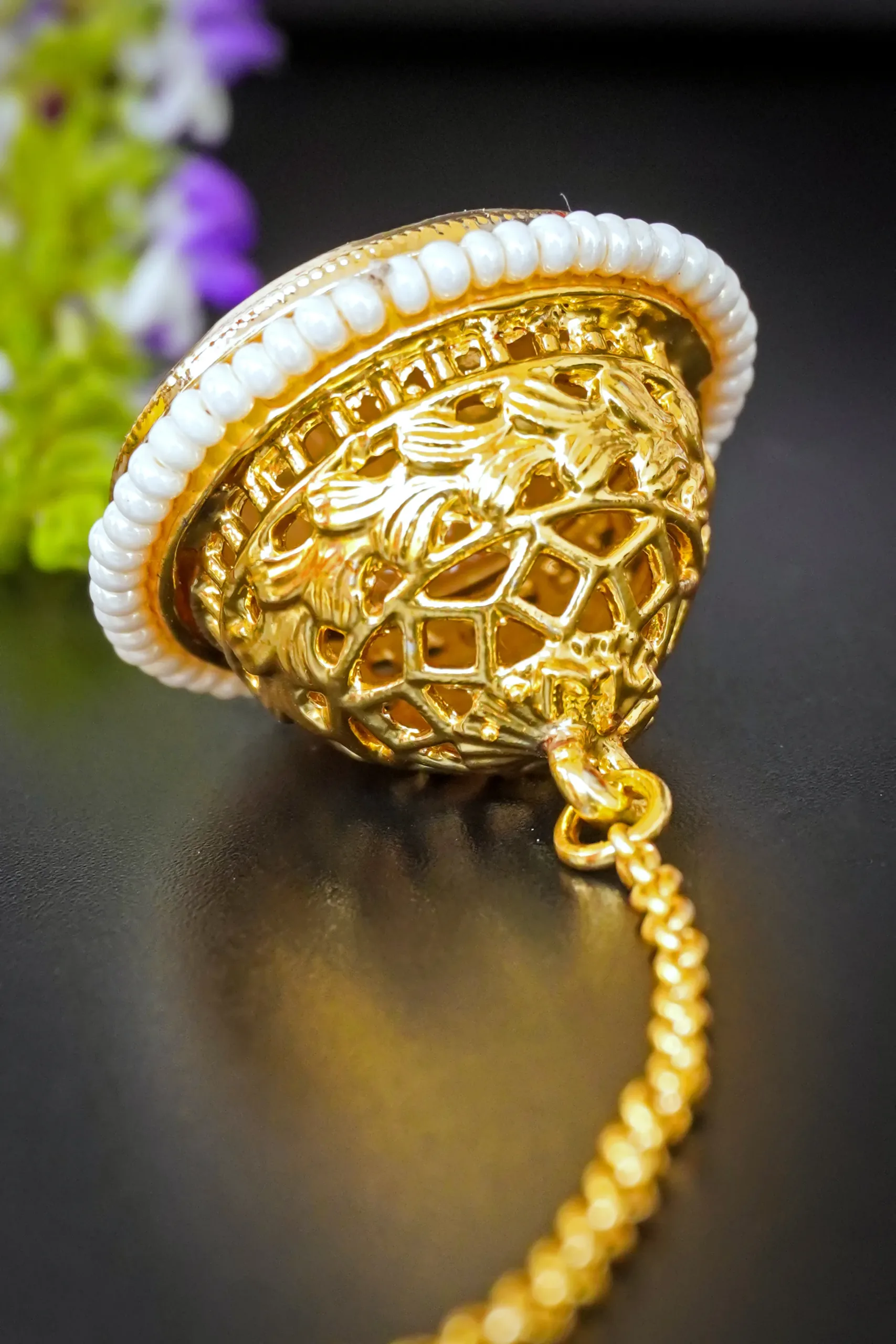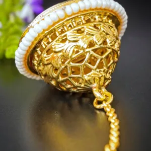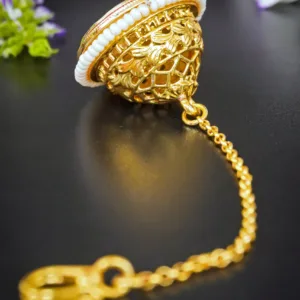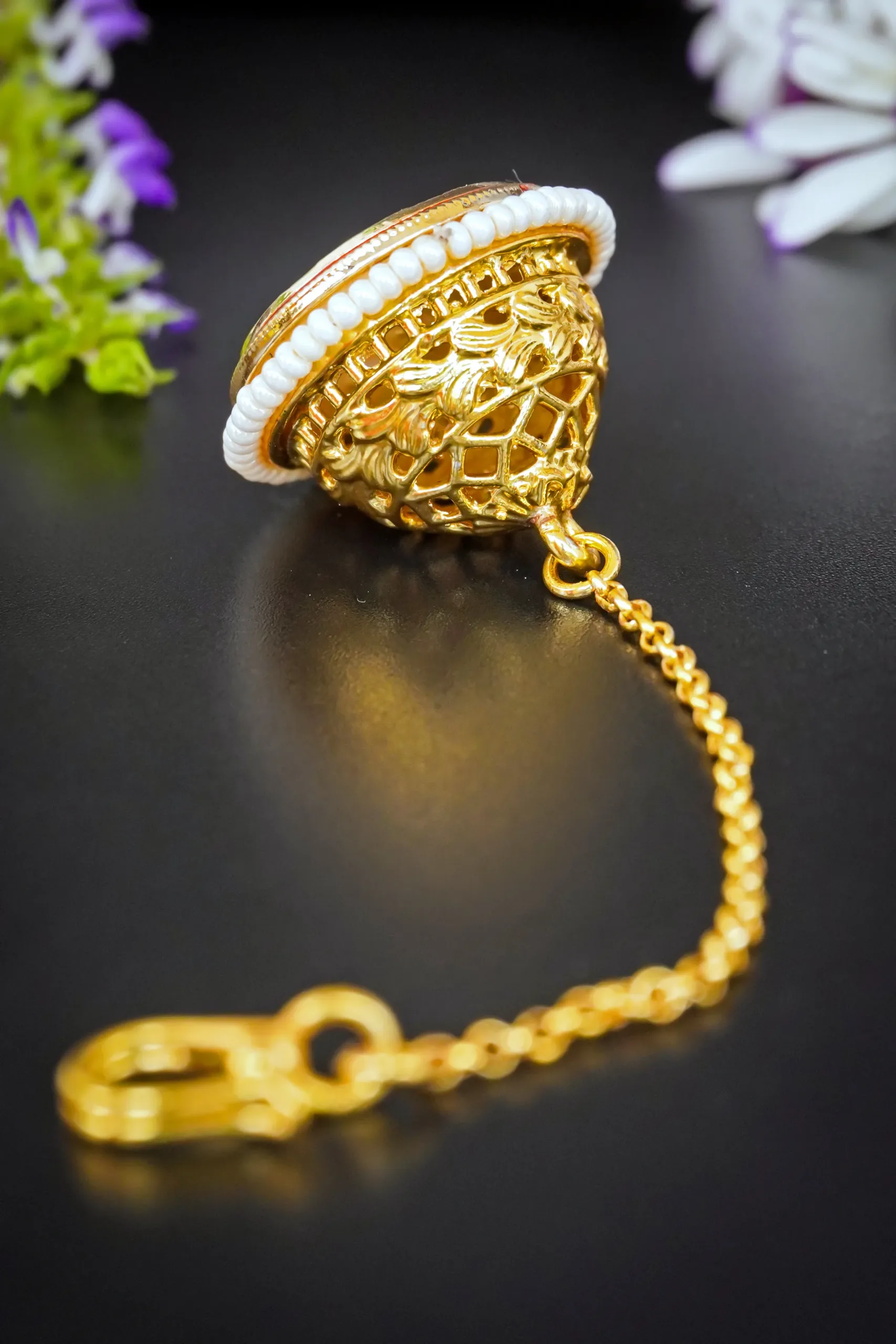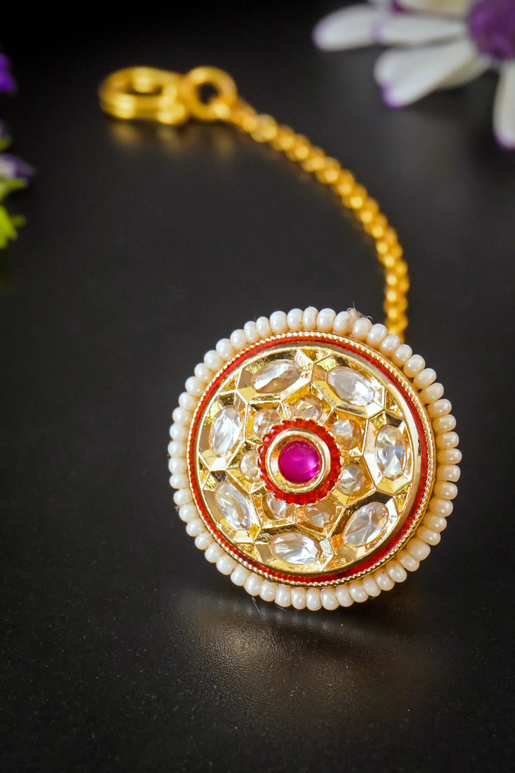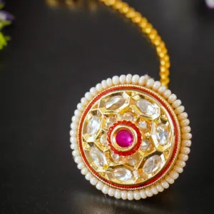 Make a majestic statement with this regal rakhdi, designed to capture timeless elegance. A radiant red stone takes center stage, surrounded by a symmetrical arrangement of kundan stones and encased in detailed gold-polished framework. Faux pearls delicately line the edges, while subtle red enamel accents complete the royal aesthetic. A perfect match for bridal or festive attire