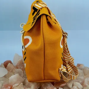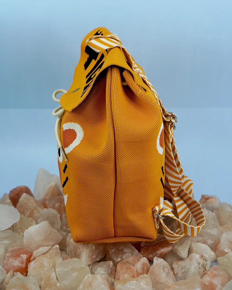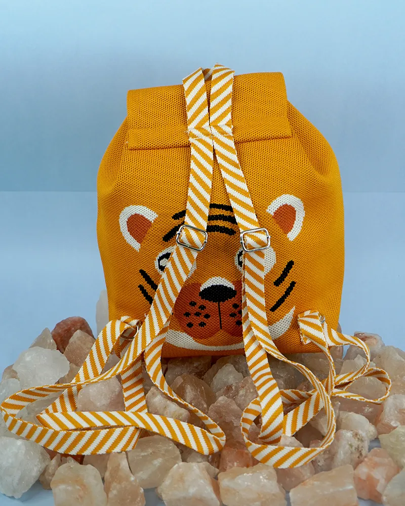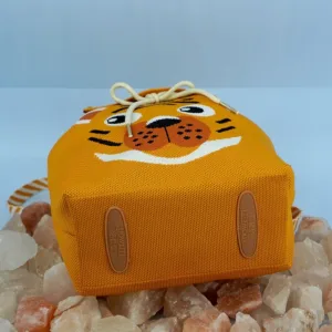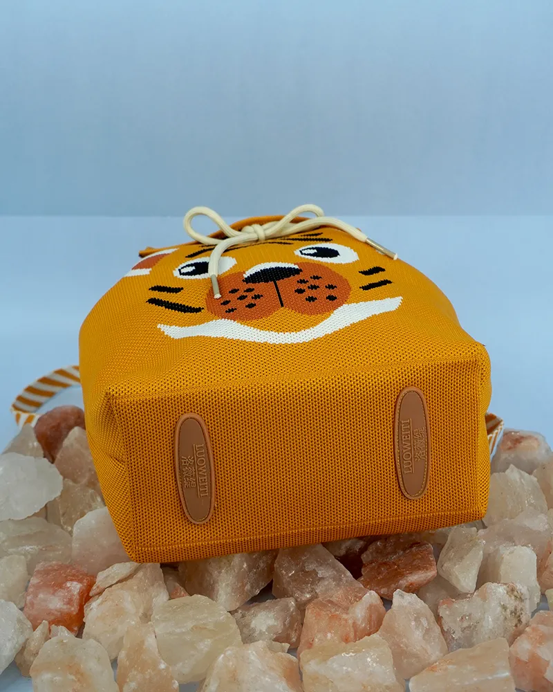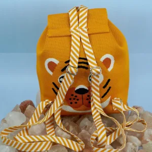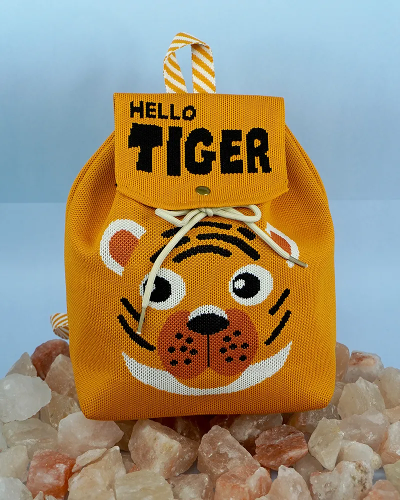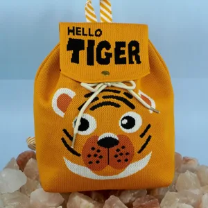 This vibrant orange backpack features a playful tiger face design with bold black stripes and white accents. The flap is adorned with the text “HELLO TIGER” in striking black font, adding a fun and energetic vibe. Crafted from durable fabric, the bag includes a striped handle loop and a drawstring closure, making it both functional and adorable?perfect for kids or the young at heart.