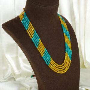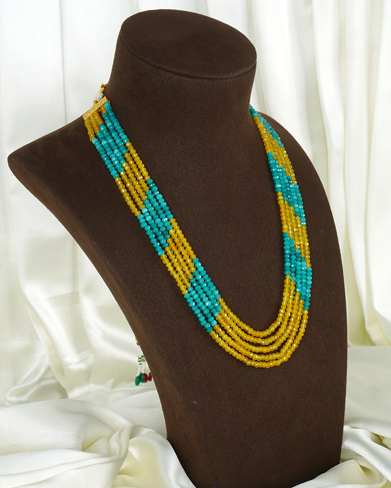 Add a vibrant pop of color to your ensemble with this multi-strand faceted bead necklace in striking teal and yellow hues. The seamless transition between colors creates a dynamic pattern that exudes contemporary charm while rooted in traditional aesthetics. The necklace features a traditional dori (thread) tie with pearl and bead detailing, offering adjustability and ethnic elegance in one piece.
