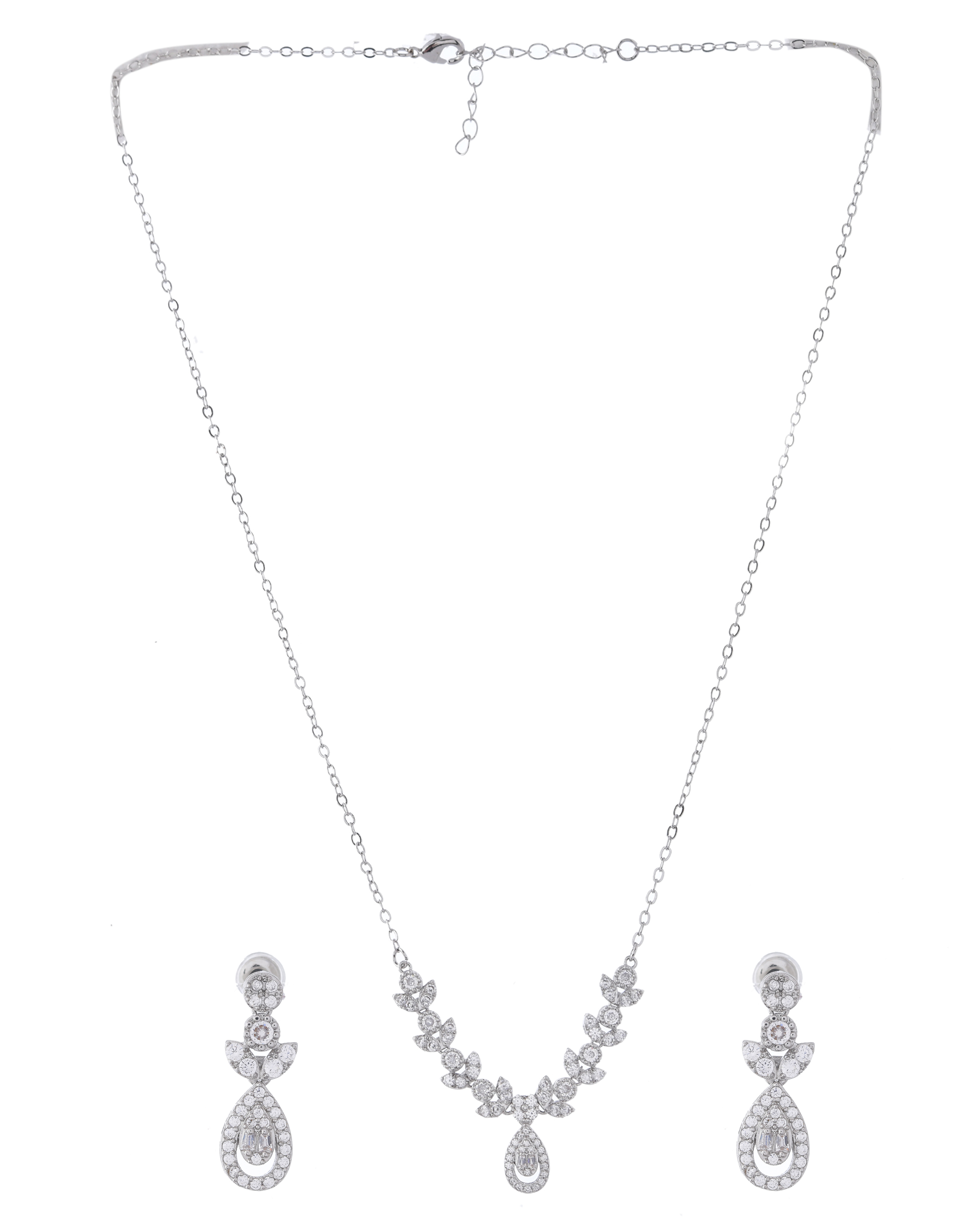 Dazzle in sophistication with this stunning silver-tone jewellery set, featuring a gracefully designed necklace adorned with marquise and round-cut cubic zirconia. The matching earrings mirror the intricate teardrop motif, making this set a perfect choice for brides, evening events, and special celebrations.