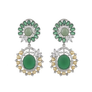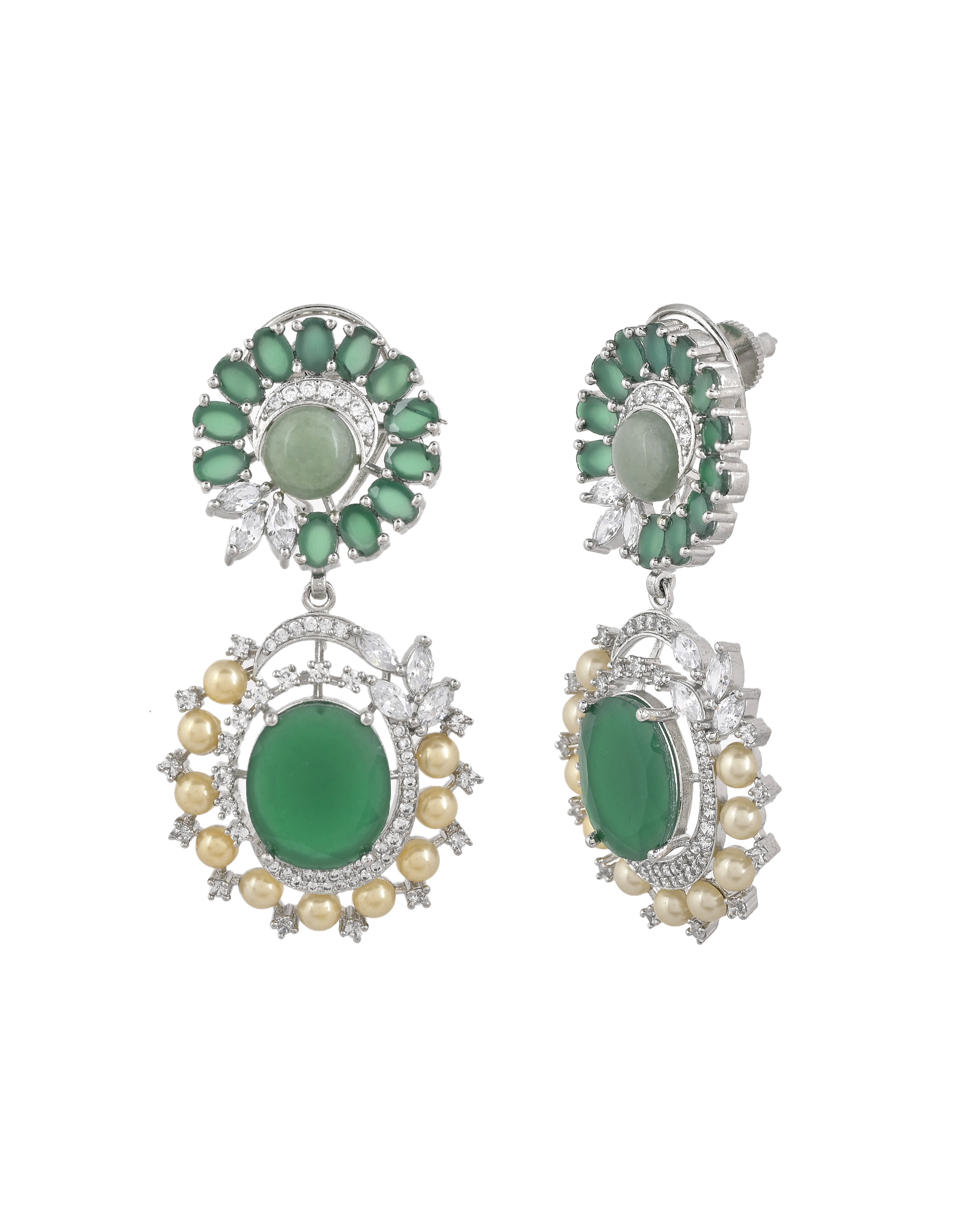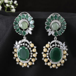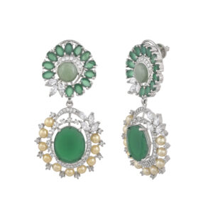 Elevate your style with these captivating statement earrings, featuring a vibrant green gem cluster at the top and a matching oval centerpiece below. Encircled by a halo of lustrous pearls and shimmering crystals, each piece exudes refined elegance. Perfect for weddings, festive celebrations, or any occasion that calls for a touch of glamour, these earrings beautifully blend modern allure with timeless sophistication.
