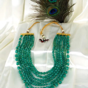 Command attention with this grand statement necklace featuring multiple strands of vibrant green beads arranged in a layered waterfall design. The beads vary slightly in shape, adding dimension and texture, while their polished surface reflects light beautifully. Anchored with golden rectangular connectors and finished with a traditional golden thread and beaded tassels, this necklace is perfect for festive attire, weddings, or cultural celebrations. A striking piece that brings both opulence and traditional craftsmanship to the forefront.