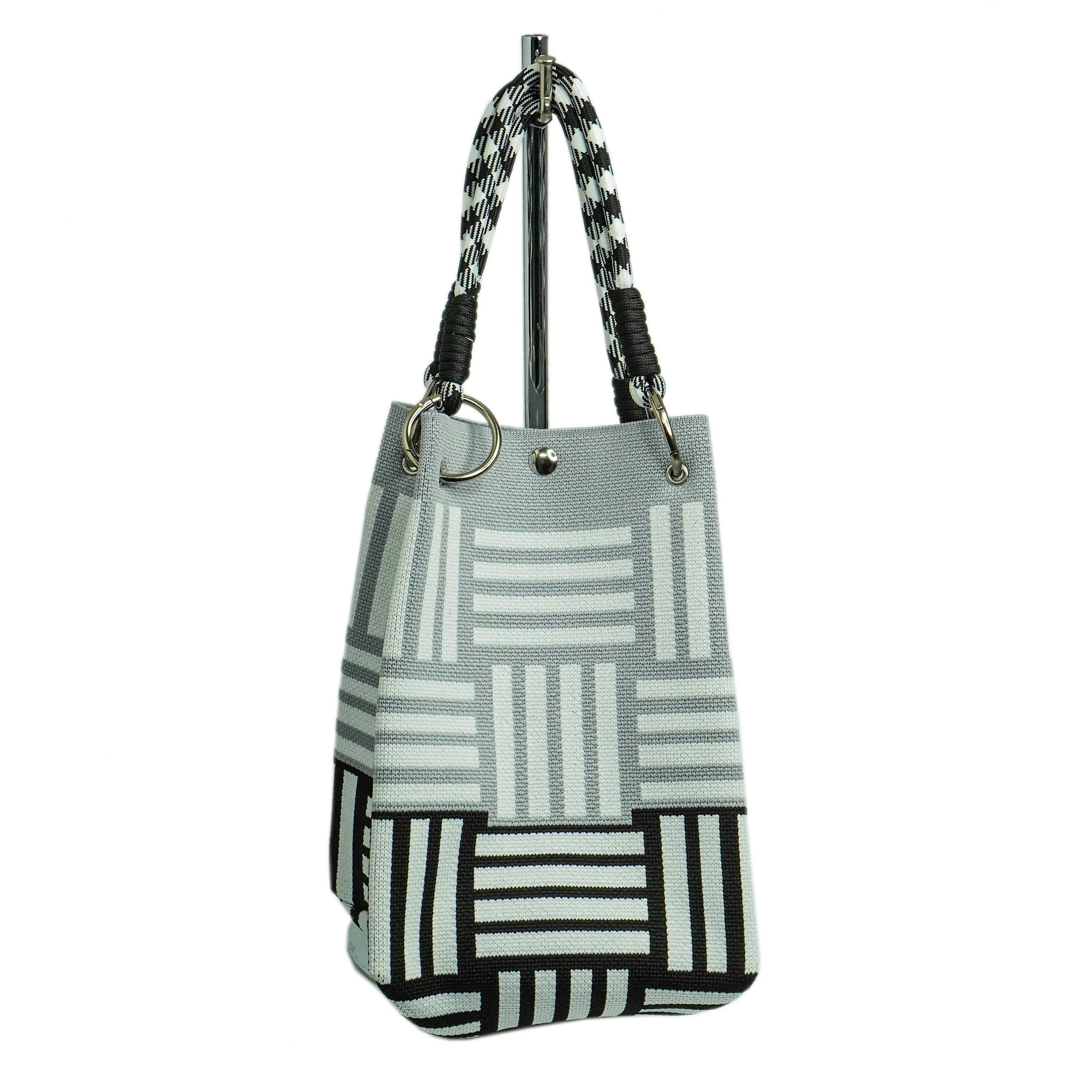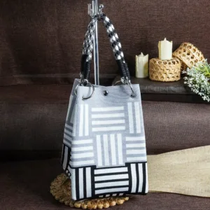 This stylish handmade tote bag features a modern black, white, and gray geometric pattern that exudes sophistication. The sturdy woven fabric is complemented by unique black-and-white braided handles, secured with metal rings for added durability. With its structured shape and contemporary design, this tote is a perfect blend of elegance and functionality, ideal for both casual and formal outings. The background setting with woven accents and candles enhances its artisanal charm.