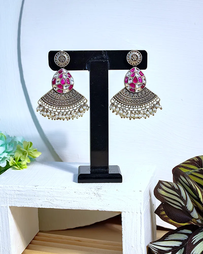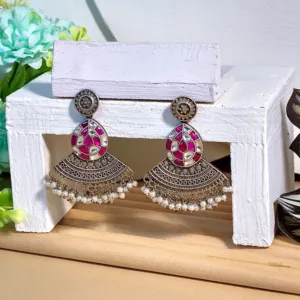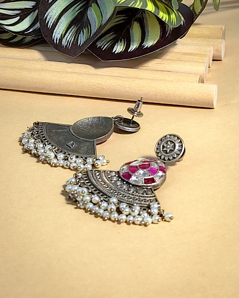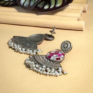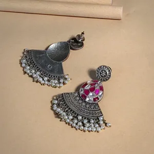 Beautiful oxidised work earring featuring intricate temple-style motifs, smooth gemstone drops, and delicate pearl accents?crafted to give an elegant traditional touch.