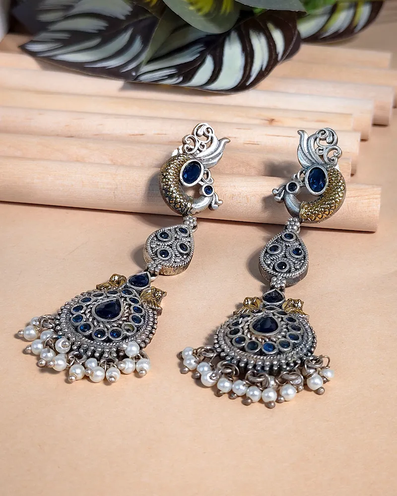 Traditional oxidised work earrings featuring a detailed peacock designperfect for adding a traditional touch.