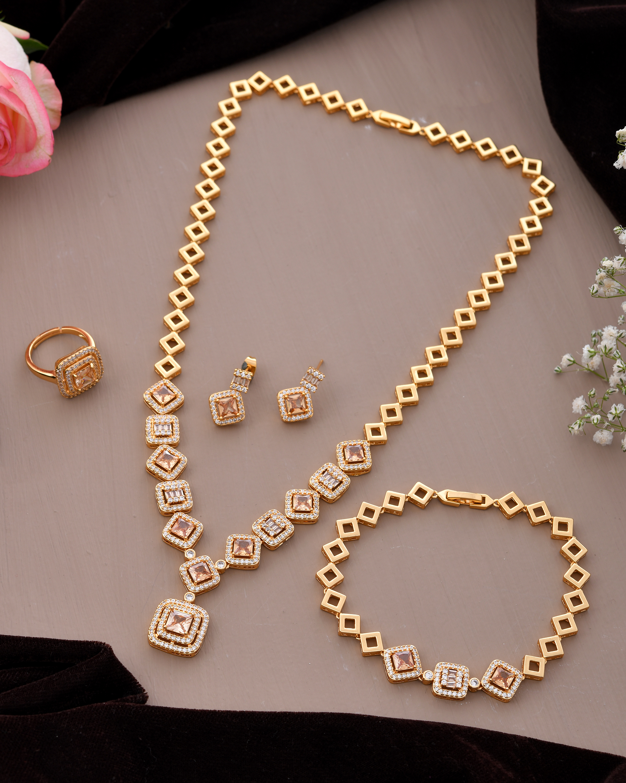 This glamorous gold-tone jewelry set features a coordinated necklace, bracelet, ring, and earrings, all adorned with sparkling champagne-hued cubic zirconia stones. The bold square motifs are framed with clear accents and paired with open square-link chains, blending traditional elegance with modern design. Ideal for weddings, festive events, and upscale evenings, this set adds warmth and brilliance to any outfit.
