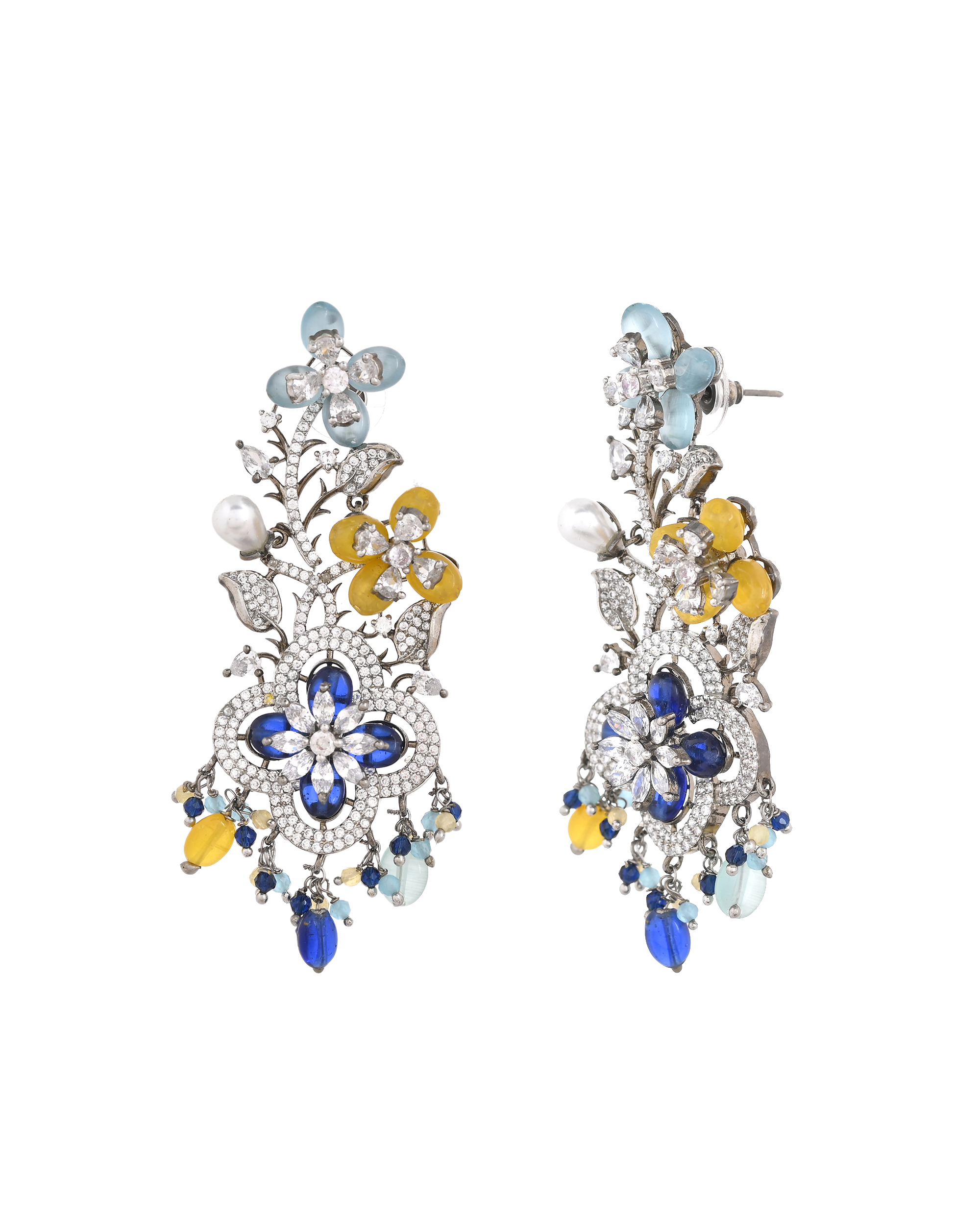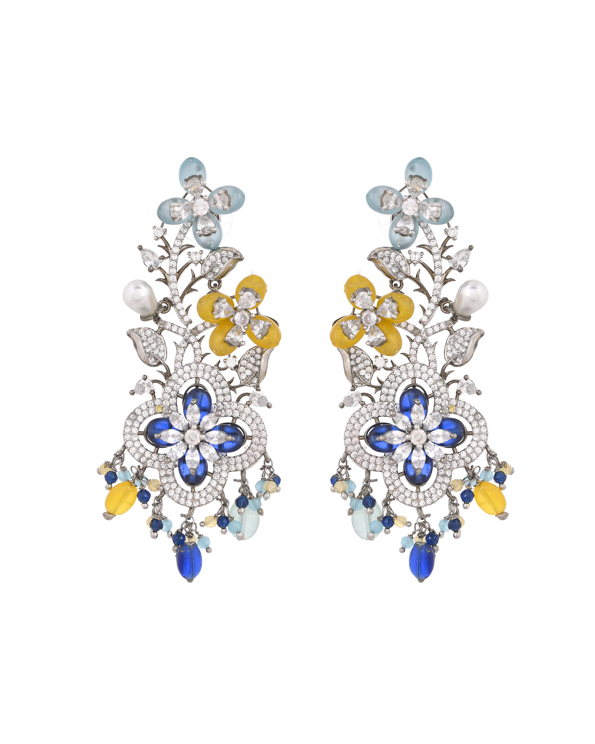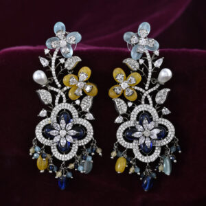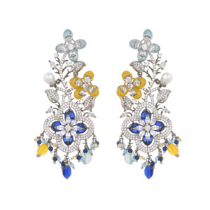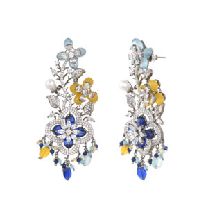 Make a grand entrance with these show-stopping drop earrings, featuring a vibrant array of floral motifs in aqua, yellow, and sapphire hues. Each bloom is adorned with sparkling crystals, while delicate pearl drops add a graceful finishing touch. Perfect for weddings, evening soirées, or any special celebration, these earrings seamlessly blend modern flair with timeless elegance, ensuring all eyes are on you.