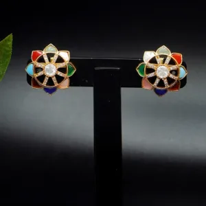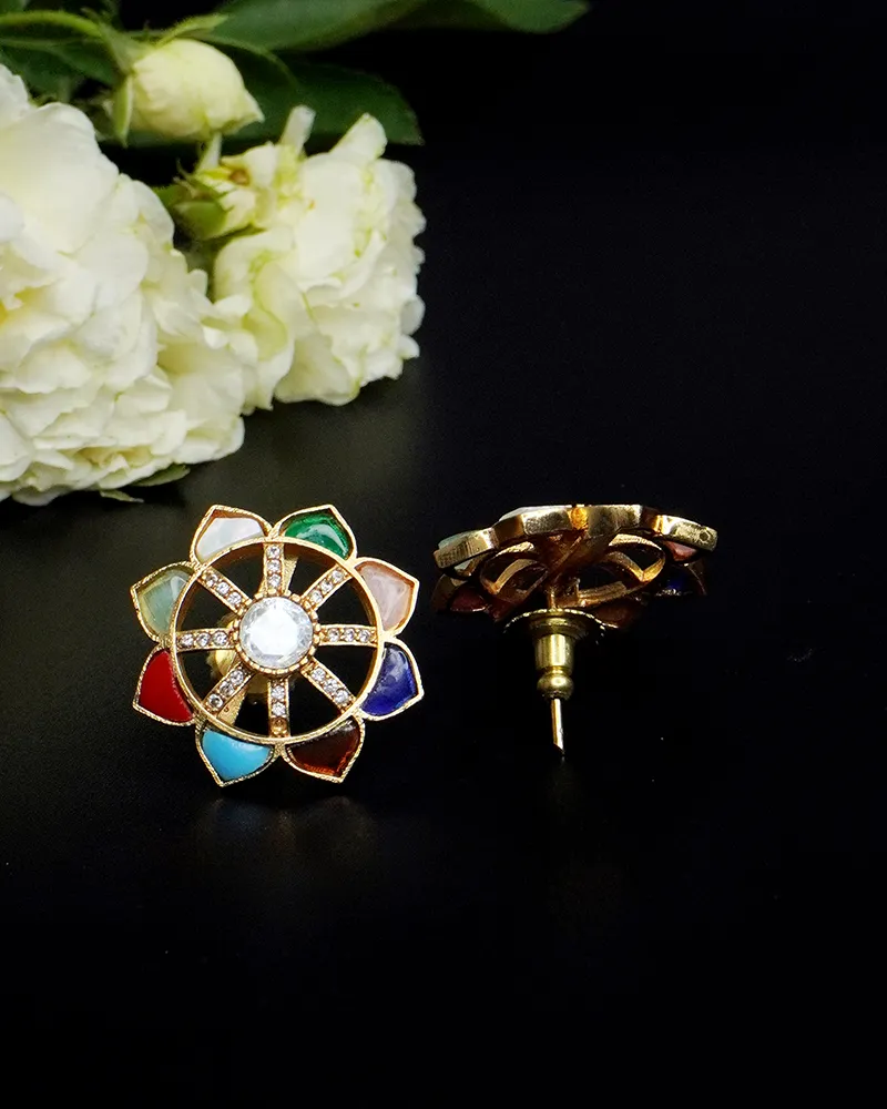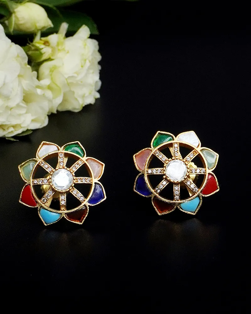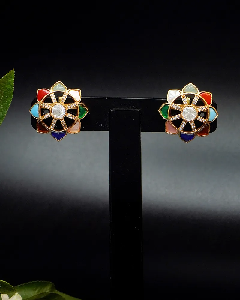 Inspired by the elegance of blooming petals, these earrings highlight a central gleaming stone surrounded by a harmonious petal-like pattern. Each segment is delicately outlined and inlaid with subtle accents, creating a balanced fusion of charm and sophistication. Ideal for festive gatherings or refined daywear, these earrings radiate grace with every glance.