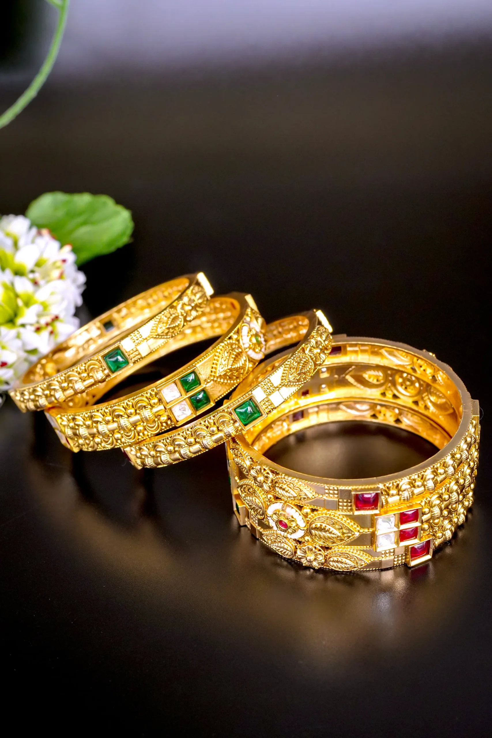 Elevate your traditional look with this exquisite set of antique gold-plated bangles. Crafted with precision, these bangles feature intricate floral and geometric patterns, adorned with radiant red, green, and white stones. The combination of thin and broad bangles allows for versatile styling, making them perfect for grand occasions like weddings, festivals, and cultural celebrations. A statement piece for those who appreciate timeless elegance and heritage craftsmanship.
