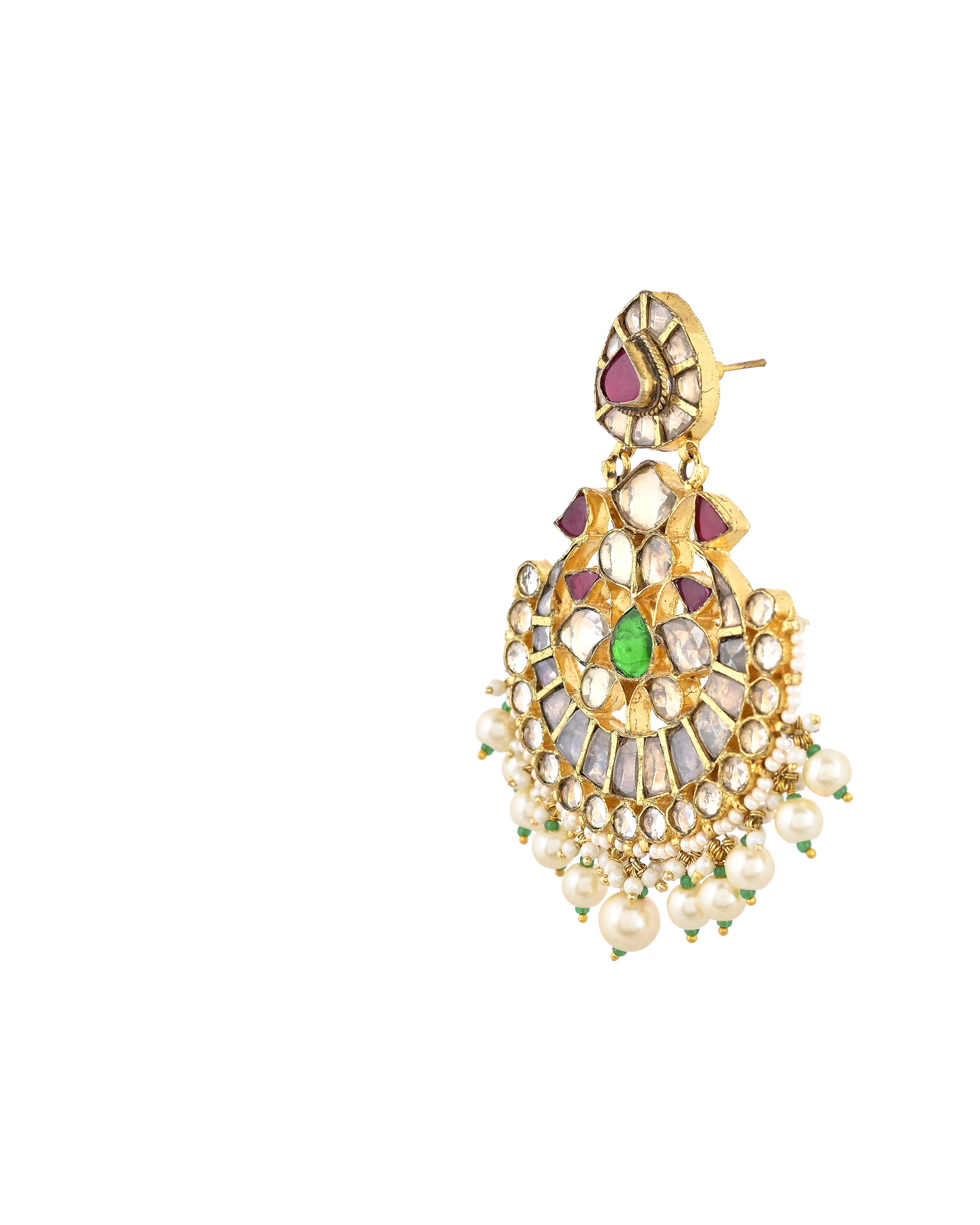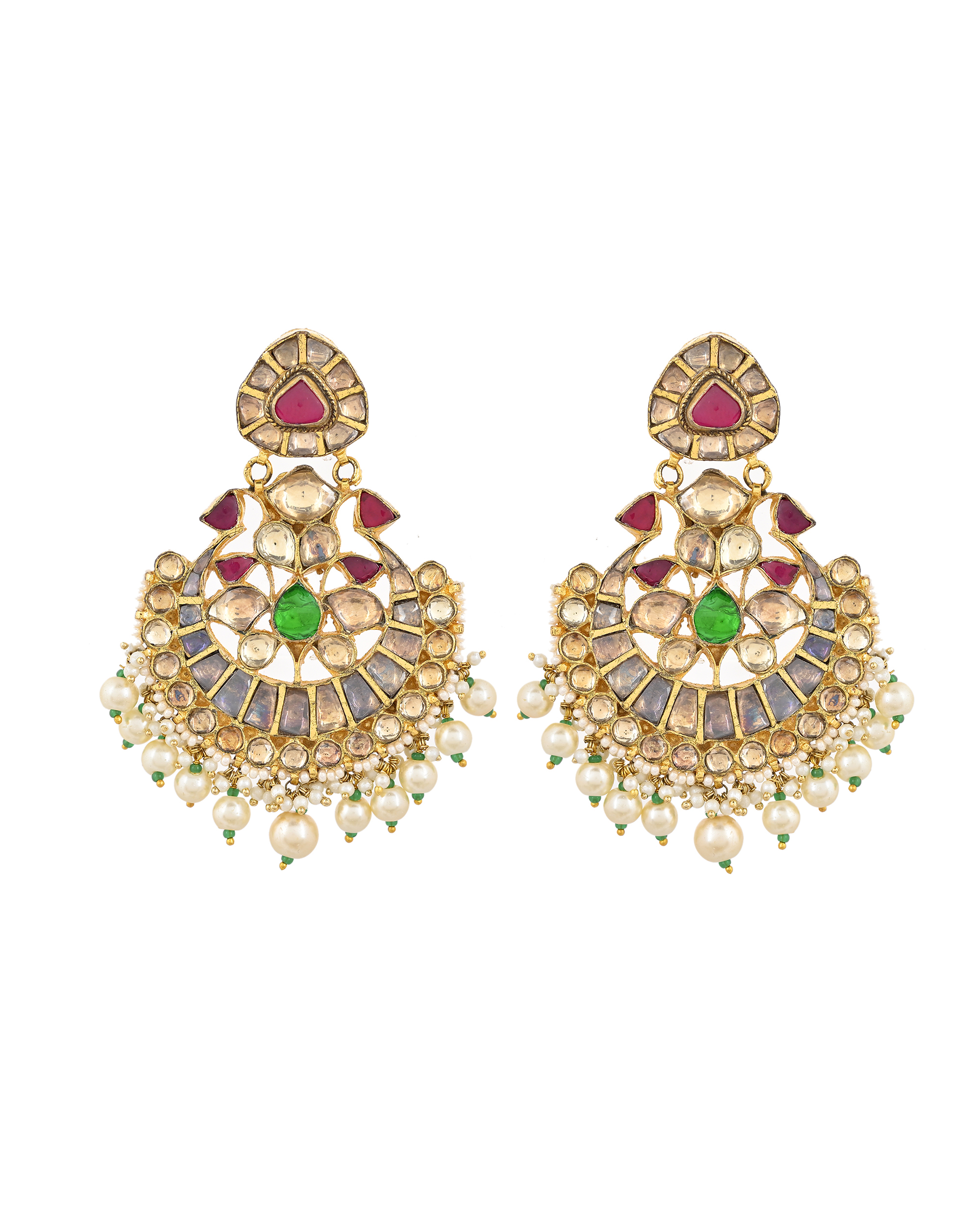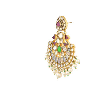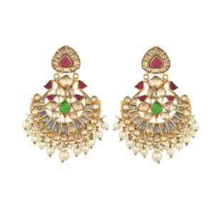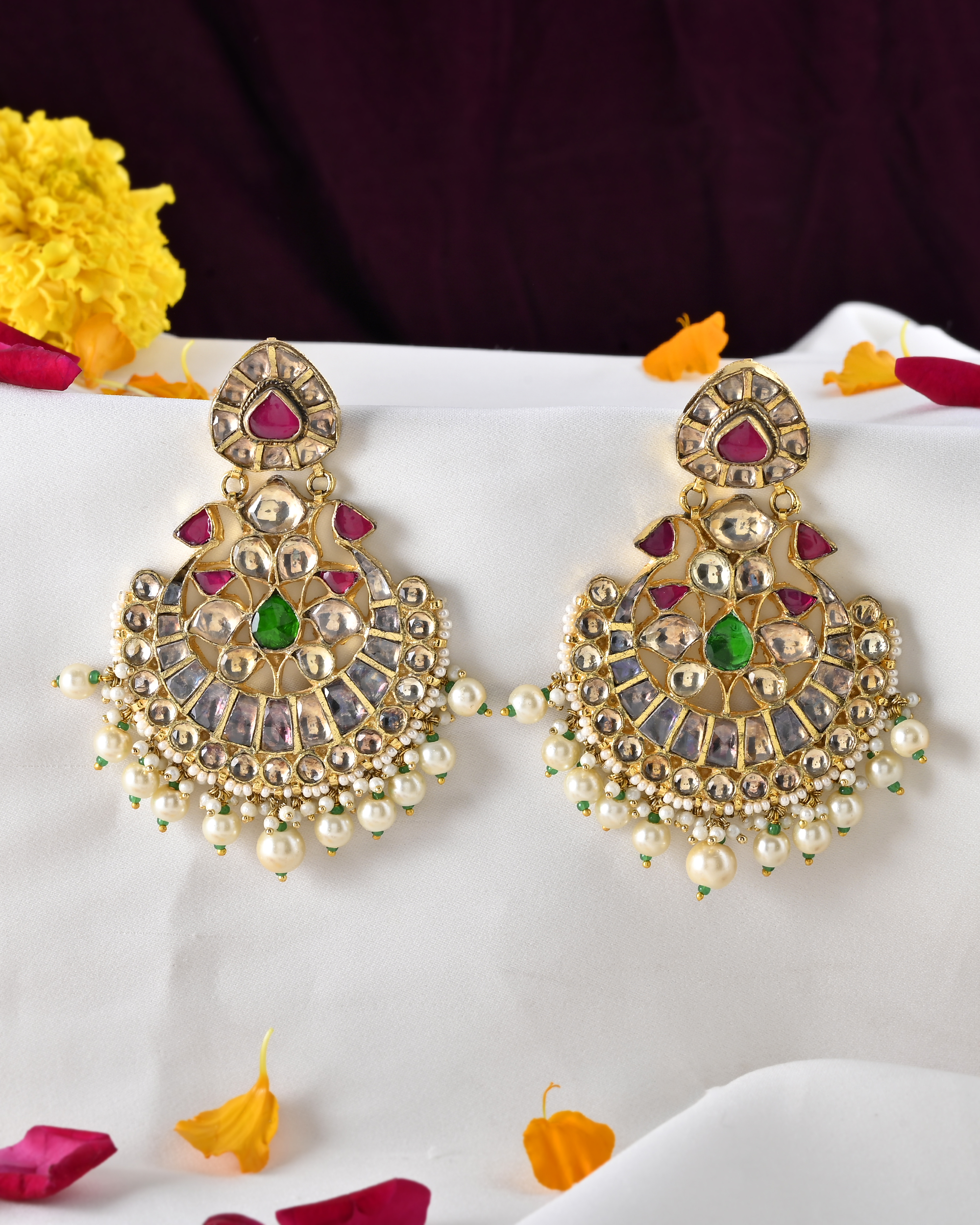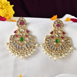 Make a grand entrance with these exquisite chandbali earrings, showcasing intricate Kundan work accented by vibrant pink and green stones. A halo of shimmering polki mirrors the richness of traditional craftsmanship, while delicate pearl tassels add a touch of timeless elegance. Perfect for weddings, festive occasions, or any celebration that calls for a statement piece, these earrings blend heritage charm with modern flair.