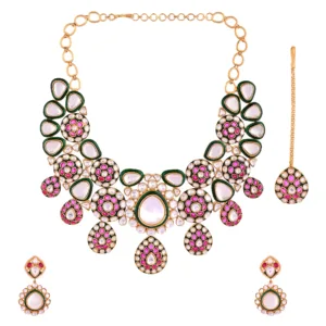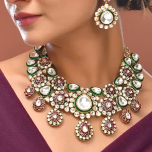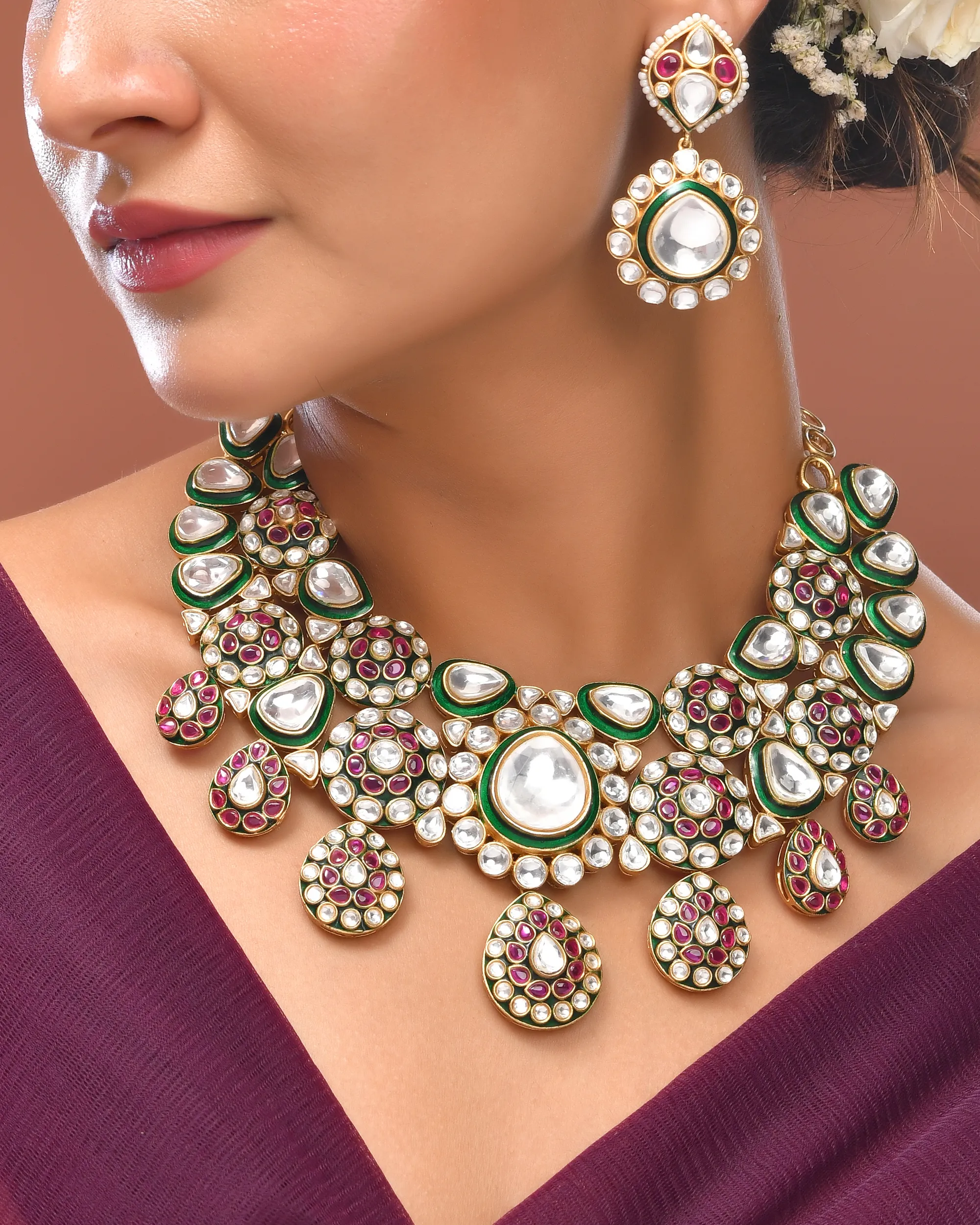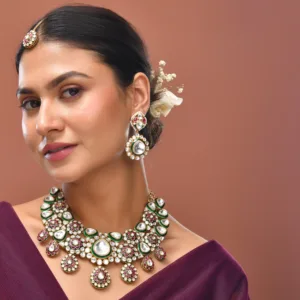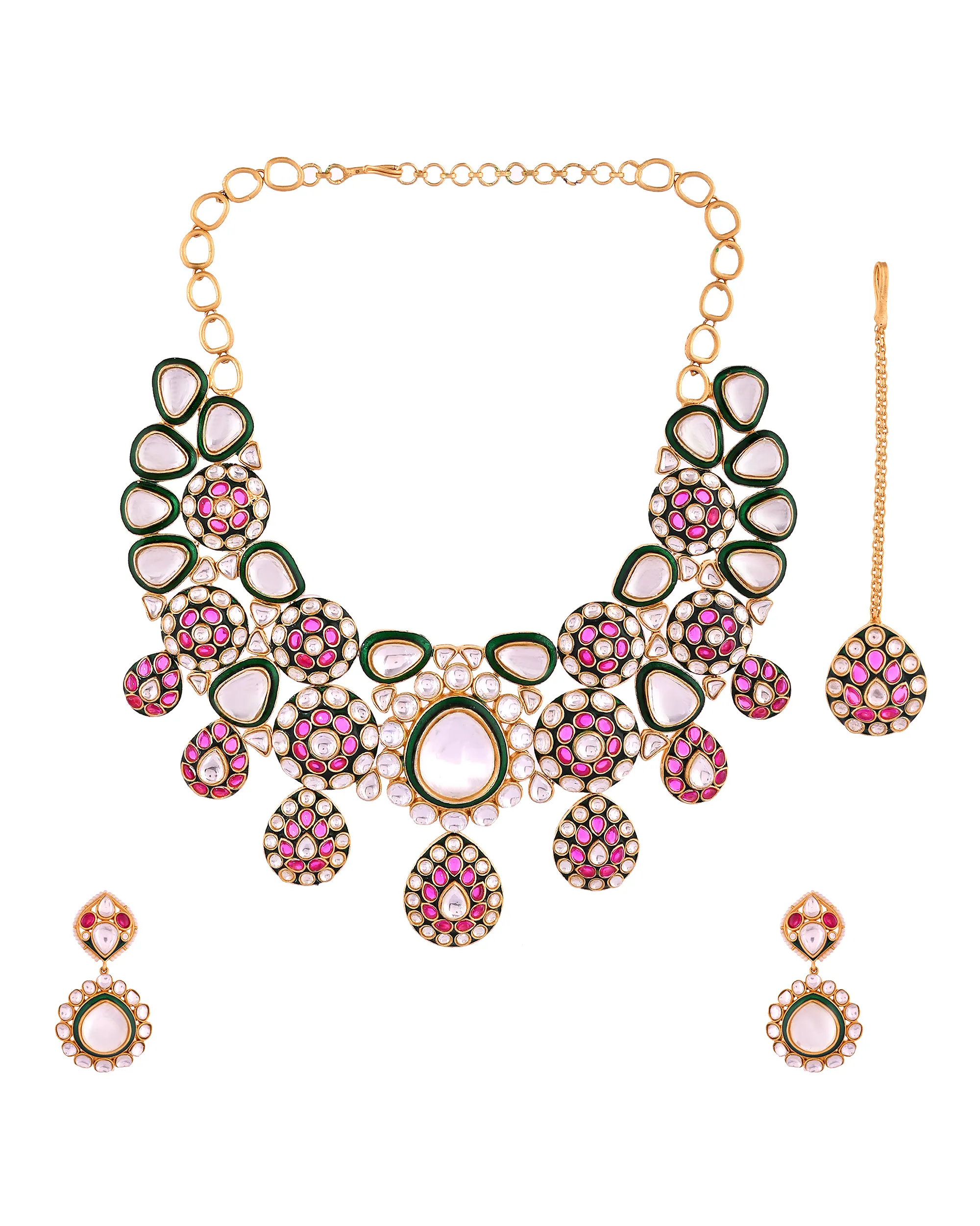Stunning traditional indian kundan necklace set, likely gold-plated. Appear to be a chocker -style necklace. Perfect for tradieiona function